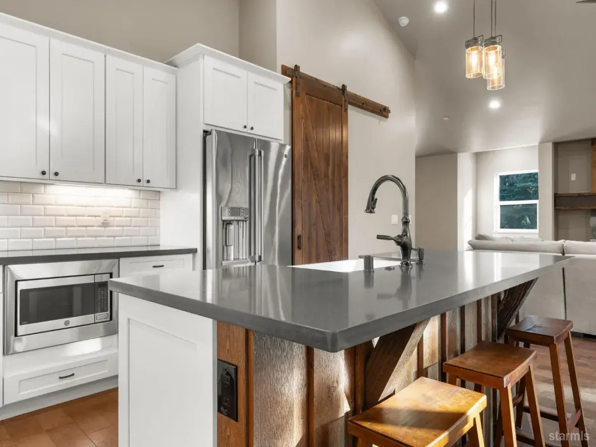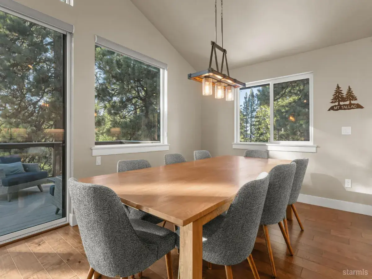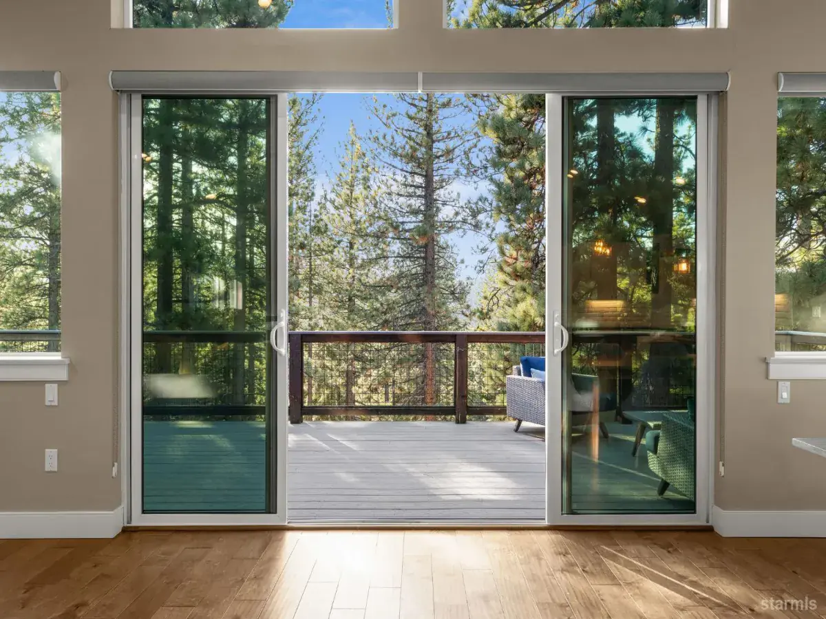 Set in a peaceful South Lake Tahoe location, this beautifully designed home enjoys a rare setting surrounded by towering pines and filtered views of Mount Tallac. High ceilings and expansive windows bring in abundant natural light while perfectly framing the mountain surroundings, with two Conservancy parcels to the left adding additional privacy.The striking exterior showcases a creative blend of architectural rooflines complemented by vertical metal accents, cedar siding, and stone finishes, creating timeless mountain-modern curb appeal.Inside, a thoughtful combination of rustic warmth and contemporary style shines throughout, featuring Alder doors, distressed wood flooring, brilliant white cabinetry, and slab quartz countertops. The expansive great room boasts grand ceilings and a stone-encased gas fireplace, opening seamlessly to a well-appointed kitchen ideal for entertaining. The home also includes air conditioning, providing year-round comfort in every season.The upper level includes a generous primary suite, guest bedroom, and additional full bath. Downstairs, three additional bedrooms and a full bath surround a spacious family room complete with a wet bar perfect for gatherings, guests, or multi-generational living.This home is well maintained and ready for you to move into, with furnishings negotiable.