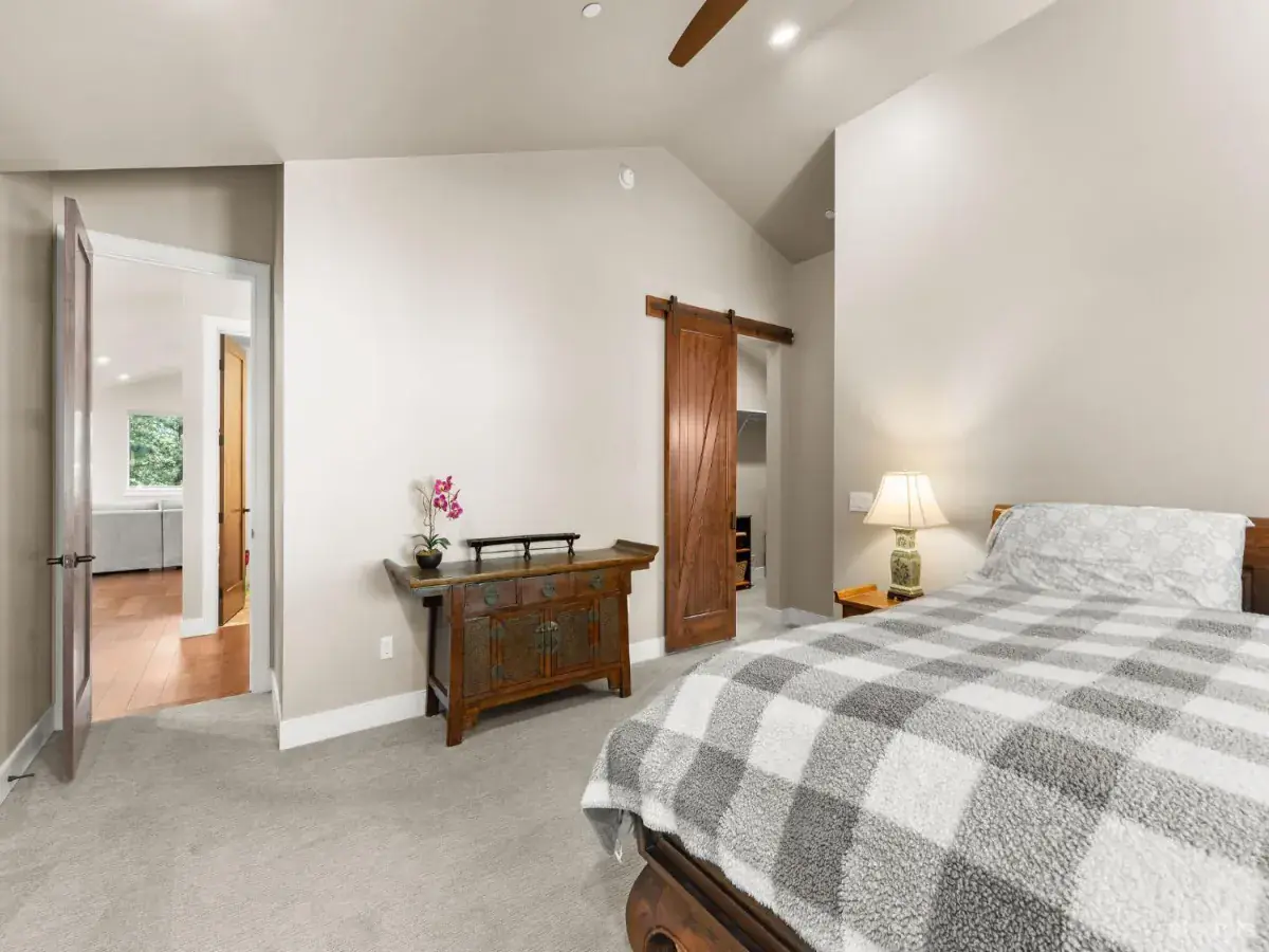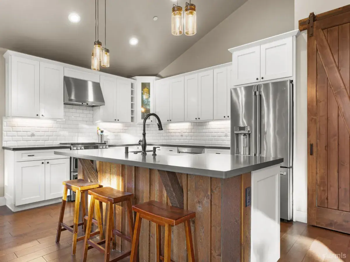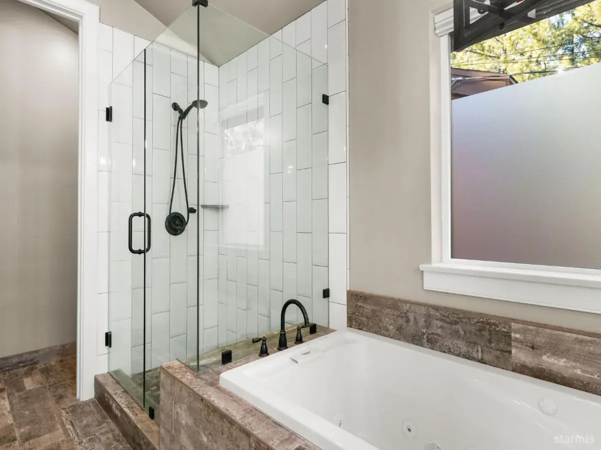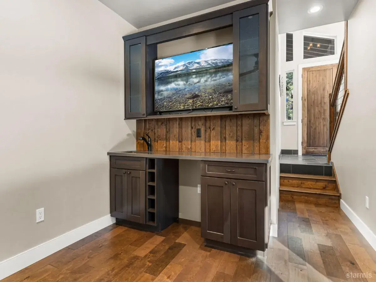 Set in a peaceful South Lake Tahoe location, this beautifully designed home enjoys a rare setting surrounded by towering pines and filtered views of Mount Tallac. High ceilings and expansive windows bring in abundant natural light while perfectly framing the mountain surroundings, with two Conservancy parcels to the left adding additional privacy.The striking exterior showcases a creative blend of architectural rooflines complemented by vertical metal accents, cedar siding, and stone finishes, creating timeless mountain-modern curb appeal.Inside, a thoughtful combination of rustic warmth and contemporary style shines throughout, featuring Alder doors, distressed wood flooring, brilliant white cabinetry, and slab quartz countertops. The expansive great room boasts grand ceilings and a stone-encased gas fireplace, opening seamlessly to a well-appointed kitchen ideal for entertaining. The home also includes air conditioning, providing year-round comfort in every season.The upper level includes a generous primary suite, guest bedroom, and additional full bath. Downstairs, three additional bedrooms and a full bath surround a spacious family room complete with a wet bar perfect for gatherings, guests, or multi-generational living.This home is well maintained and ready for you to move into, with furnishings negotiable.