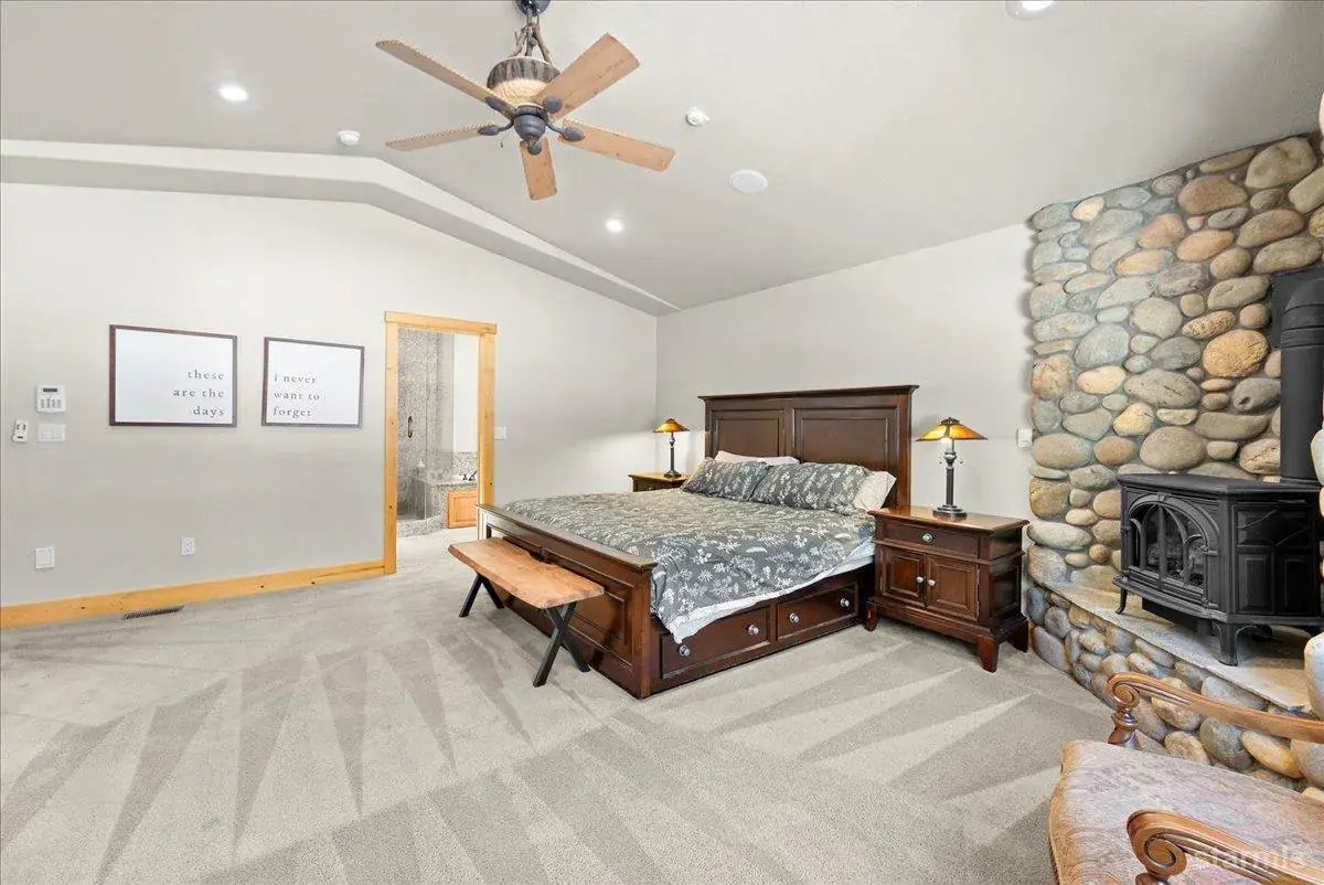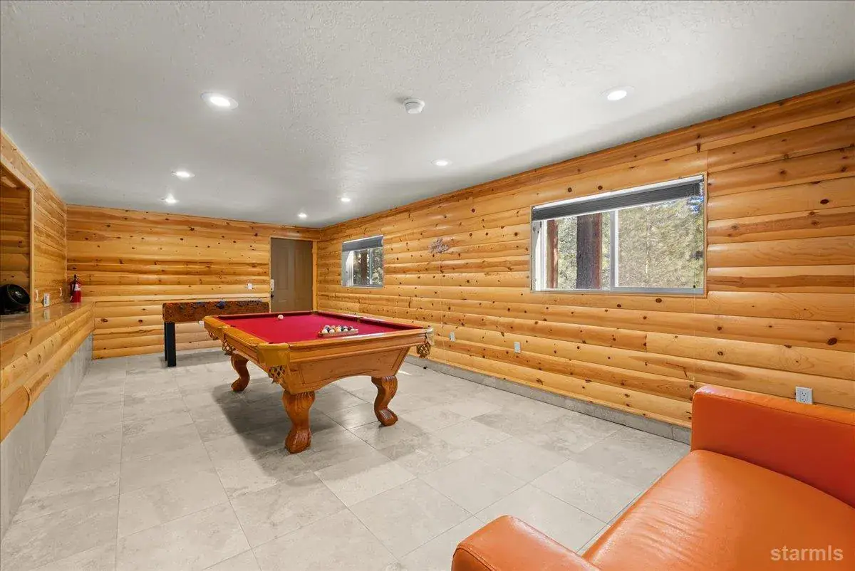 Experience refined mountain living in this Country Club Estates home that has been meticulously maintained and features timeless craftmanship throughout. Opening the double door entry reveals the quintessential Tahoe great room defined by soaring pine ceilings, warm hardwood, natural travertine floors and a signature peeled log staircase. The great room serves as the heart of the home centered around a beautiful granite boulder fireplace, breakfast bar, and a kitchen featuring warm alder cabinetry, granite slab counters and travertine floors. The expansive deck has picturesque views of the forest and mountains. Unwind in the primary suite. your personal hideaway complete with a cozy freestanding stove, a natural river rock hearth and custom built closet. The primary bath features a steam shower, a jetted soaking tub, radiant heated floors, and a natural light skylight. The lower level is a versatile guest retreat, featuring a cozy den, full bath, and two bedrooms. This space is grounded by heated travertine floors, and warm wainscoting. The third level Game Room is ready for action with a full size pool table, foosball, and a dart game setup for endless fun and competition. Heated floors in two baths, den and game room. Custom built in closet inserts in all three bedrooms. The entire inside is newly painted. Sold Furnished. The exterior is wrapped on all sides with beautiful well maintained cedar siding. Beyond parking the three car garage has an abundance of built in storage cabinet and workbench. Located on a third of an acre with two sides of the property are owned by Tahoe conservancy and BLM. Large Drive way accommodates multiple cars along with a three car garage. Close proximity to and minutes from ski resorts, shopping, restaurants, and casinos. This was a successful vacation rental prior to listing the property for sale. Luxury mountain retreat, turnkey rental, or forever home, this property defines the unrivaled Tahoe lifestyle!