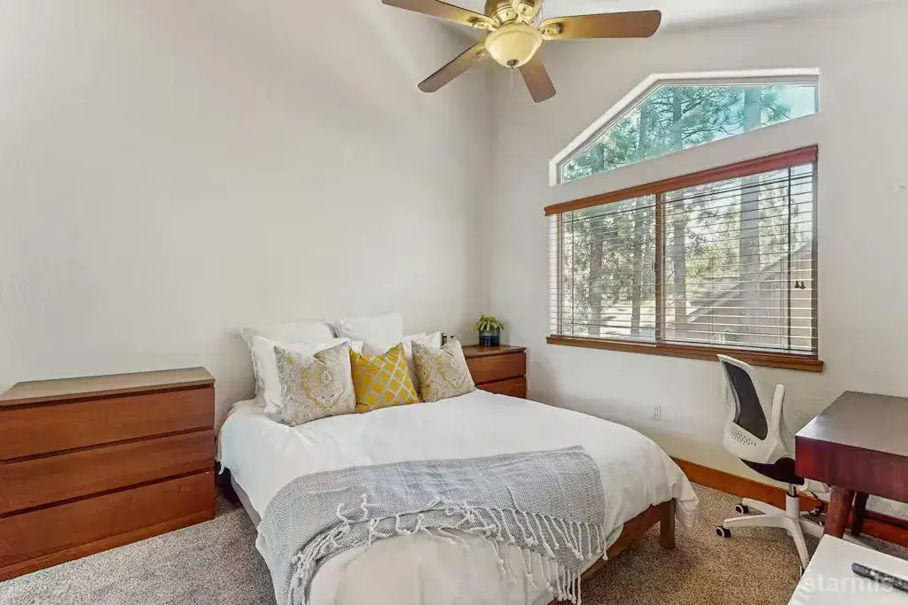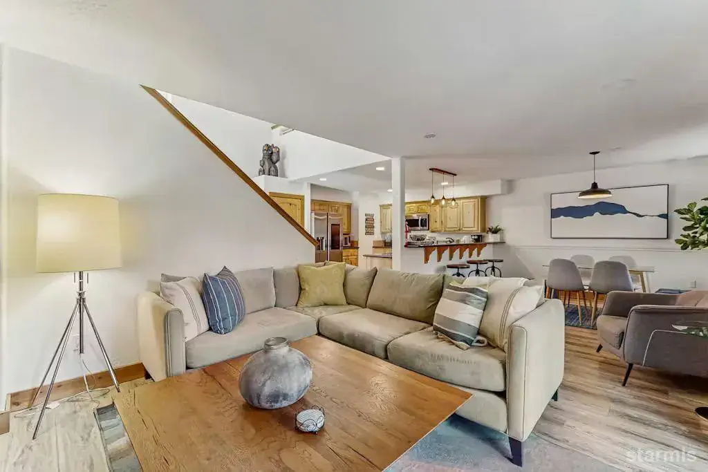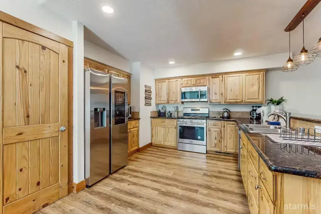 Welcome to this beautifully appointed 4 bedroom/3 bath townhome offering refined mountain living in the heart of South Lake Tahoe. Thoughtfully designed with a bedroom on each level, this home provides flexibility and privacy for guests and family alike. The primary suite features vaulted ceilings, his/hers closets, jetted tub and a double sink vanity, creating a true retreat. Rustic hickory cabinetry anchors the chef’s kitchen, complemented by granite countertops, hickory flooring, and updated light fixtures throughout. Knotty pine doors and trim add classic Tahoe character, while vaulted ceilings and abundant windows fill the home with natural light. Step onto the deck overlooking a fully fenced, private backyard – perfect for entertaining or relaxing after a day enjoying the great outdoors. A spacious attached 2 car garage and efficient forced-air heating ensure year-round comfort. Low-maintenance living is made easy with an HOA that covers exterior maintenance, water, insurance and snow removal. Ideally located within walking distance to the pristine shores of Lake Tahoe. Just 10 minutes to Heavenly Ski Resort and close to exceptional dining, shopping and hiking/biking trails. This home is being sold fully furnished with an acceptable offer. New water heater installed in 2025