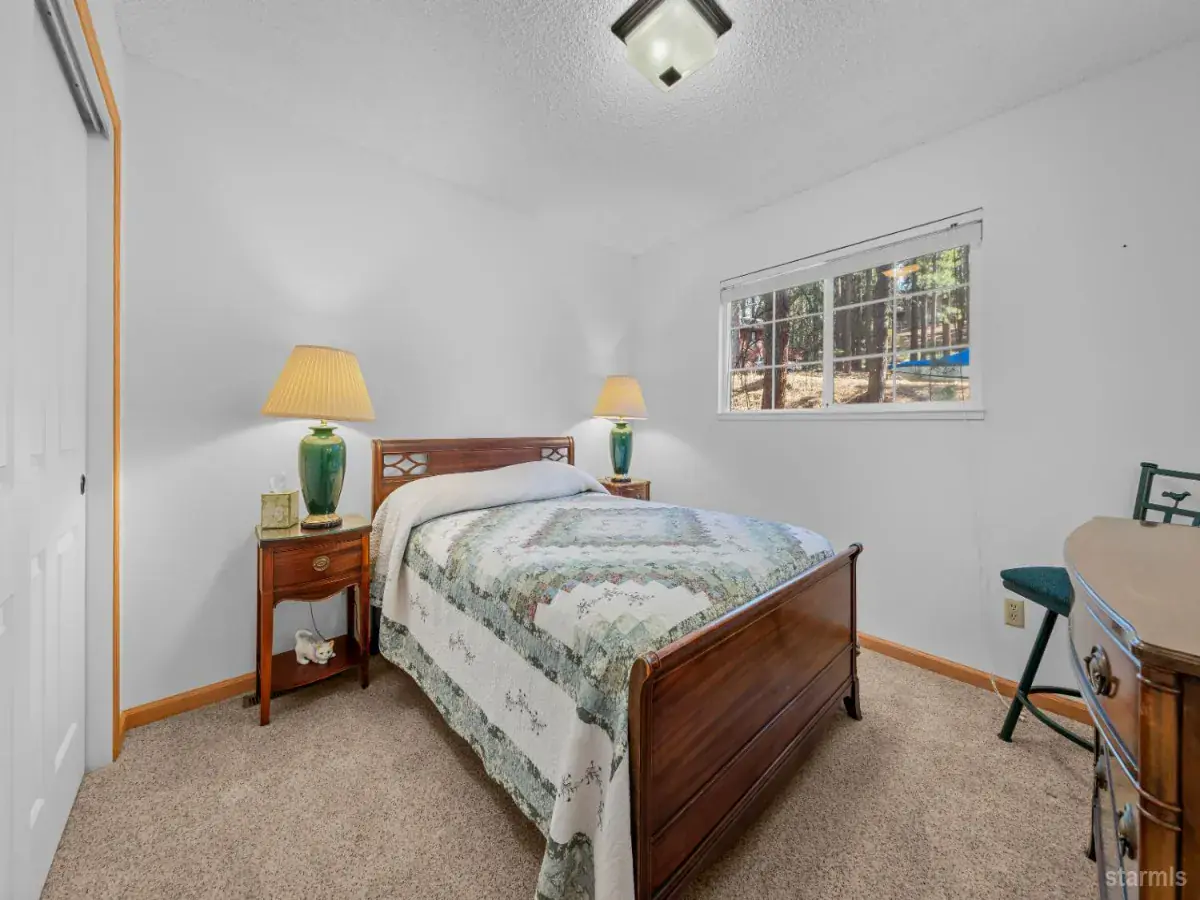 This home offers highly sought after amenities when looking for your forever home, in Lake Tahoe.*LOCATION- Montgomery Estates *SETTING – Surrounded by Forest (home across the street) *STYLE – Single Story Prow Front Chalet * LOT SIZE – Over 13,000 s.f. *PRIVACY – This home is focused on gazing out at the forest. If you are into outdoor activities, right outside your door are miles of hiking, biking, snow shoeing, hammocking and all the outdoor living you dream of. Enjoy queing & entertaining on a deck? You have it here, a large wrap around composite deck. This is a very special and rare opportunity to own a single story, 3 bedroom (including a primary)/2 bathroom/2 car attached garage in a central county location. 10 – 15 min. drive to all of the fun South Lake Tahoe has to offer. The Owners have only used this lovely escape, as their vacation home, for many years.Simply bring your toys, your joy and don’t wait on this one!