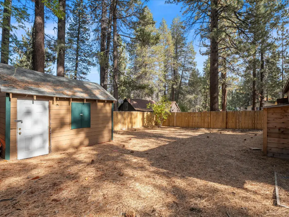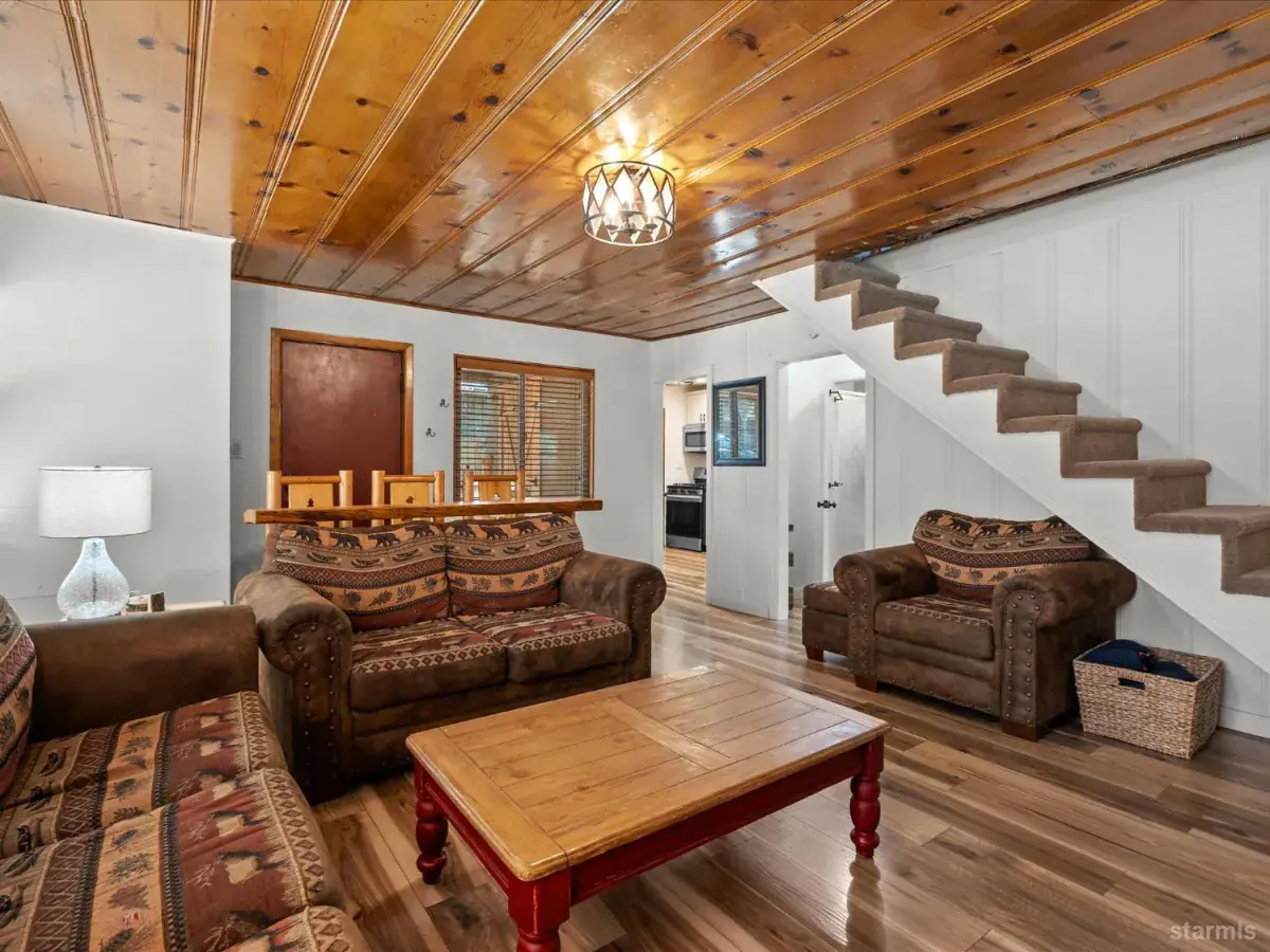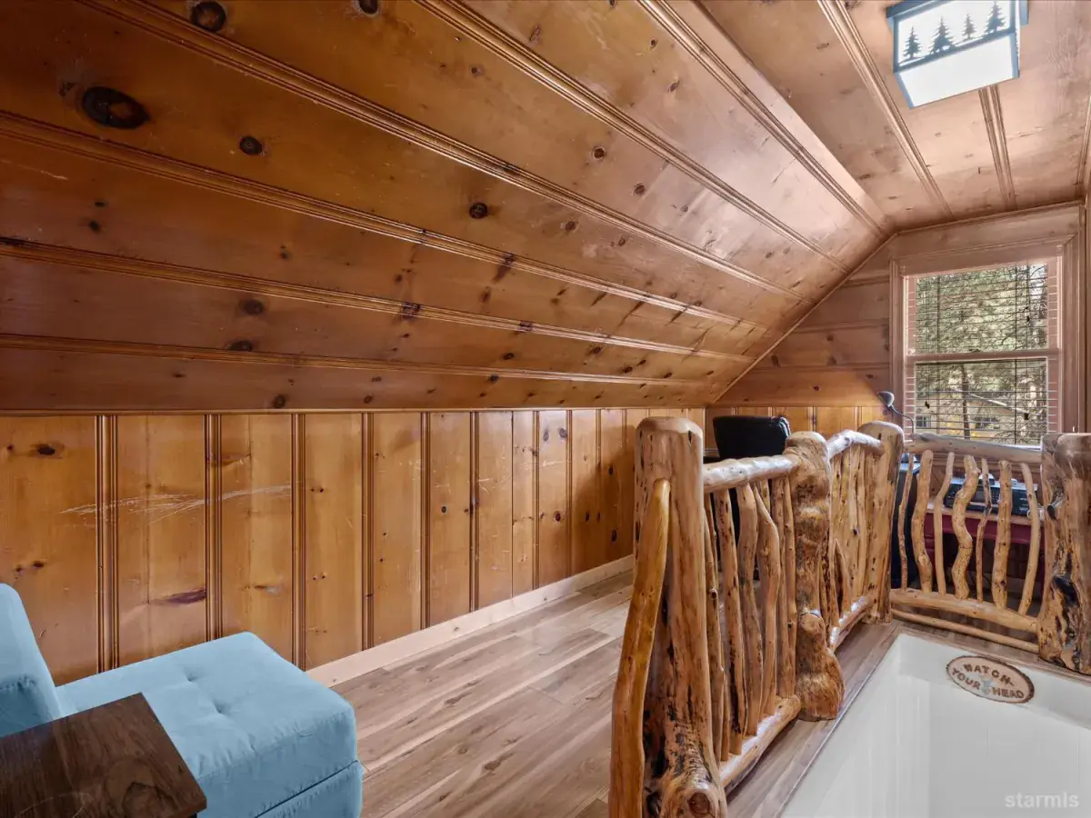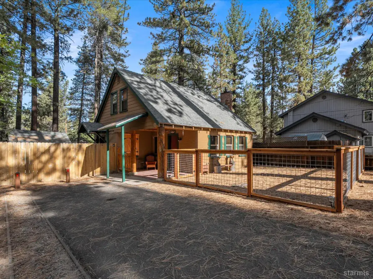 Looking for an old world charm, log cabin in an excellent, move-in ready condition? Look no more. This knotty pine Lake Tahoe cabin is surrounded by tall pine trees and is only 6 blocks away from Lake Tahoe Blvd, restaurants and shopping. You may walk your dogs or ride your E-Bike on trails along Trout Creek to Lake Tahoe Community College. On the first floor of this fully furnished cabin you will find a good size family room with gas fire place, a bedroom, a full bath and a nicely remodeled kitchen (see the photos). The kitchen has door to the fenced backyard just in case woofy needed to be let out . Upstairs you will find two more bedrooms and another half-bath plus a small office/ study / loft area. Upgrades include newer vinyl plank flooring, double pane vinyl windows, a newer kitchen including appliances, tasteful bathroom fixtures, driveway, water heater and electric panel.