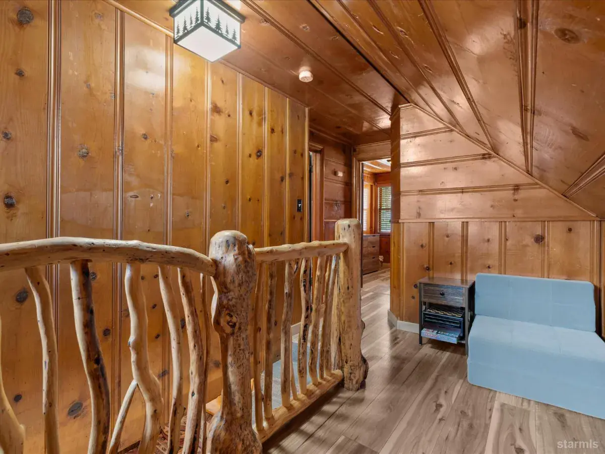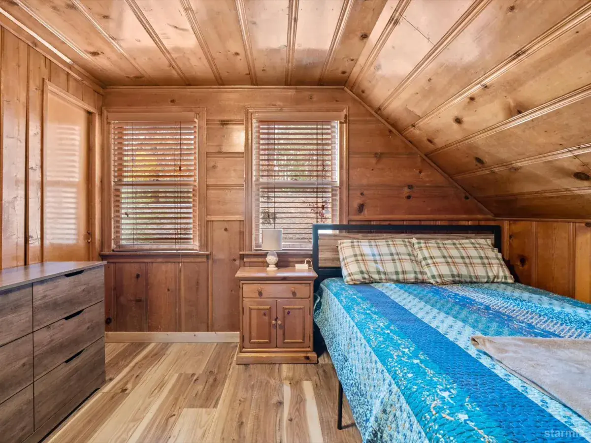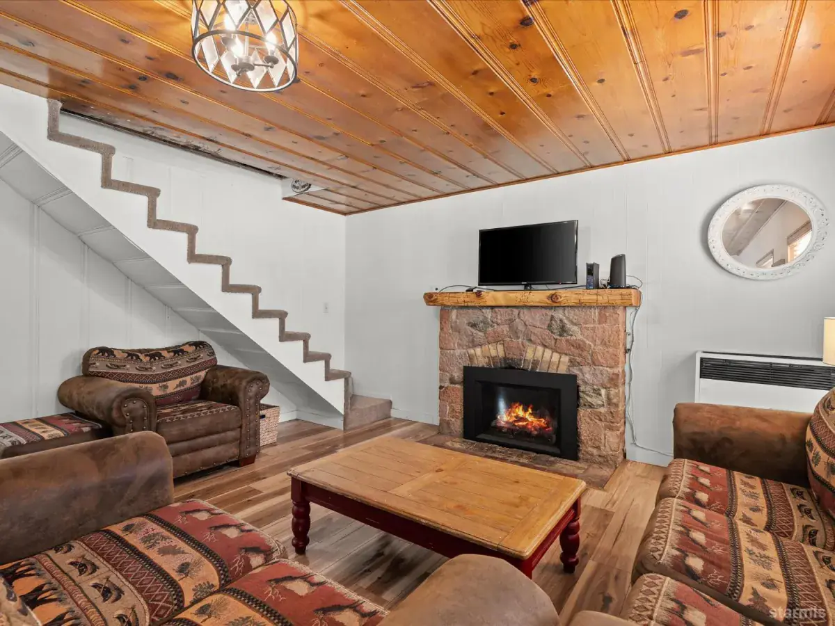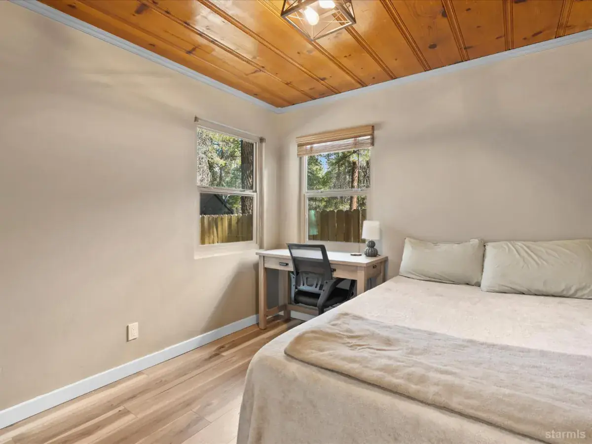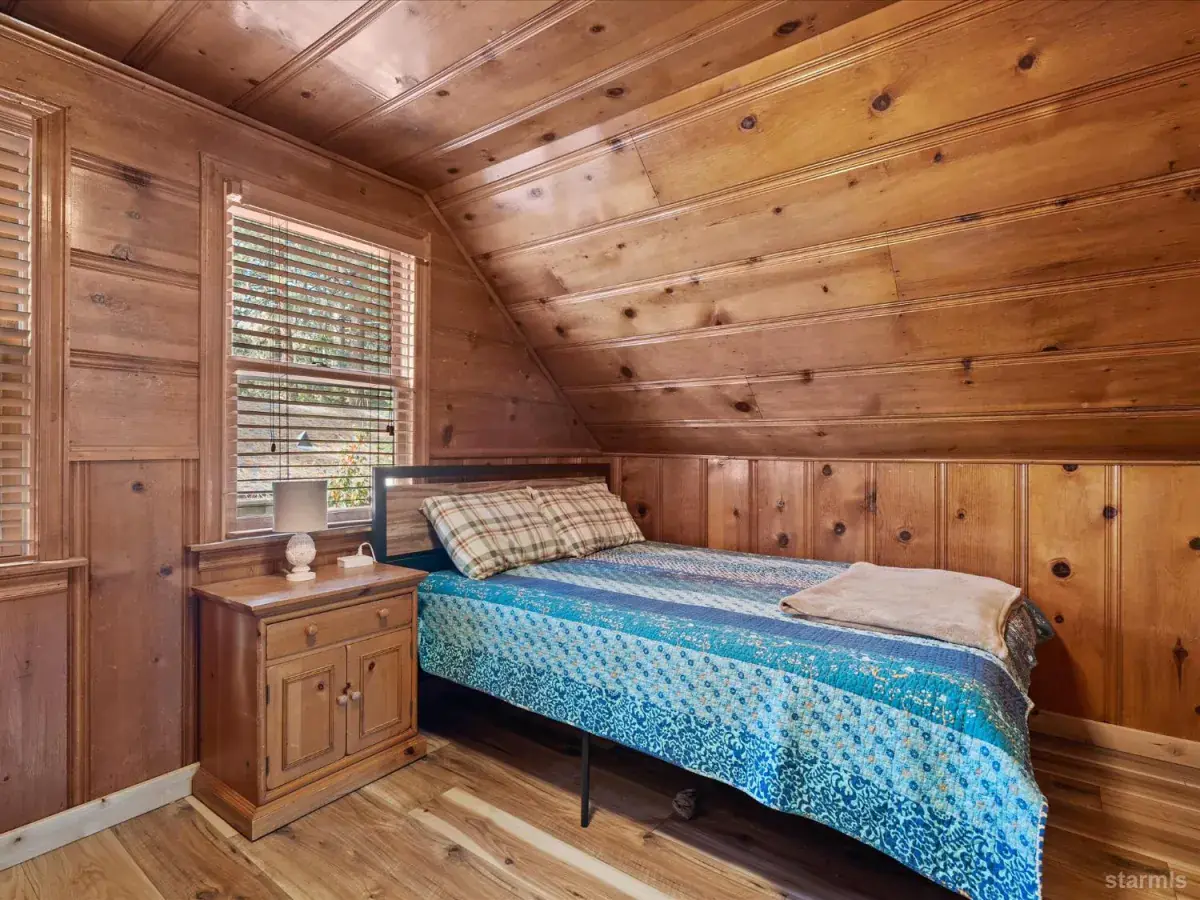 Looking for an old world charm, log cabin in an excellent, move-in ready condition? Look no more. This knotty pine Lake Tahoe cabin is surrounded by tall pine trees and is only 6 blocks away from Lake Tahoe Blvd, restaurants and shopping. You may walk your dogs or ride your E-Bike on trails along Trout Creek to Lake Tahoe Community College. On the first floor of this fully furnished cabin you will find a good size family room with gas fire place, a bedroom, a full bath and a nicely remodeled kitchen (see the photos). The kitchen has door to the fenced backyard just in case woofy needed to be let out . Upstairs you will find two more bedrooms and another half-bath plus a small office/ study / loft area. Upgrades include newer vinyl plank flooring, double pane vinyl windows, a newer kitchen including appliances, tasteful bathroom fixtures, driveway, water heater and electric panel.
