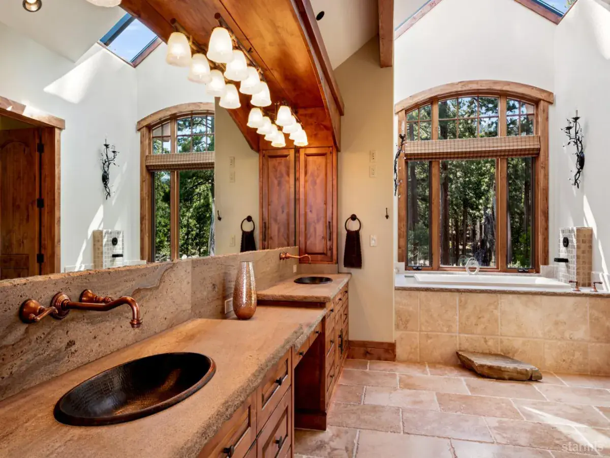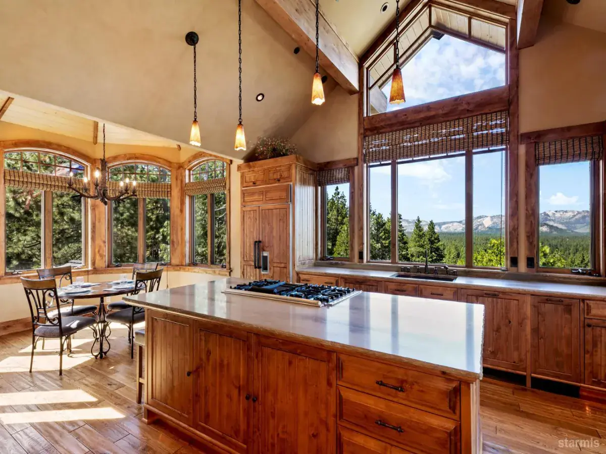 Beyond a stately iron gate and down a winding drive framed by native pines and granite outcroppings lies one of South Lake Tahoe’s most exclusive alpine compounds. Perched atop the crown of a five-acre sanctuary, this private estate commands panoramic views spanning Lake Tahoe’s crystalline waters, the iconic silhouette of Mt. Tallac, and a skyline of surrounding summits. Offering a rare blend of scale, seclusion, and scenery, the property lies at the intersection of wilderness and world-class convenience—just moments from Heavenly’s CA Lodge and the famed Powerline Trail.- – Crafted by one of the region’s most respected builders, the architecture harmonizes bold timber elements, dynamic rooflines, and artisan stonework—uniting durability with timeless design. Thoughtfully sited among granite formations and bathed in sunlight, the home is both immersed in nature and buffered from the outside world.- – A true-arched entry leads into a grand foyer with soaring ceilings and a quartzite-floored fountain. The great room makes an immediate impression with massive purlin beams, floor-to-ceiling windows, and unfiltered views. A stone-wrapped fireplace with hammered copper accents anchors the space, while radiant heat beneath distressed oak floors adds comfort throughout.- – An open layout connects to a chef’s kitchen, where Alder cabinetry meets live-edge sandstone countertops. Commercial-grade appliances, a walk-in pantry with dumbwaiter, double wall oven, and warming drawer enhance daily functionality. A cozy breakfast nook beneath turreted cedar ceilings adds warmth and charm. An expansive L-shaped composite deck offers a front-row seat to sunsets and starry skies.- – The main-level primary suite evokes a private lodge feel with a sitting alcove, fireplace, dormered ceilings, and secluded balcony. A spa-caliber bath features dual vanities, hammered copper sinks, a steam shower with dual heads, and an infinity-edge soaking tub. The walk-in wardrobe includes detailed millwork, organization, and a split laundry chute.- – Downstairs, two additional suites showcase natural stone finishes, designer lighting, and custom cabinetry. The secondary living space is perfect for entertaining, with built-in surround sound, gaming space, wet bar, and a native granite fireplace with hand-hewn mantle.- – Other features include an executive office with antique-finished built-ins, full laundry center, fire suppression, integrated audio, and a climate-controlled three-car tandem garage with dog wash. Hydronic radiant heat, an indirect boiler-fed hot water system, and central vacuum optimize efficiency. – – Every inch of this retreat reflects thoughtful craftsmanship and enduring materials, wrapped in distressed alder and finished in Ralph Lauren’s warmest tones.- – With 7,000+ square feet of remaining coverage, the possibilities for expansion—are as limitless as the views!
