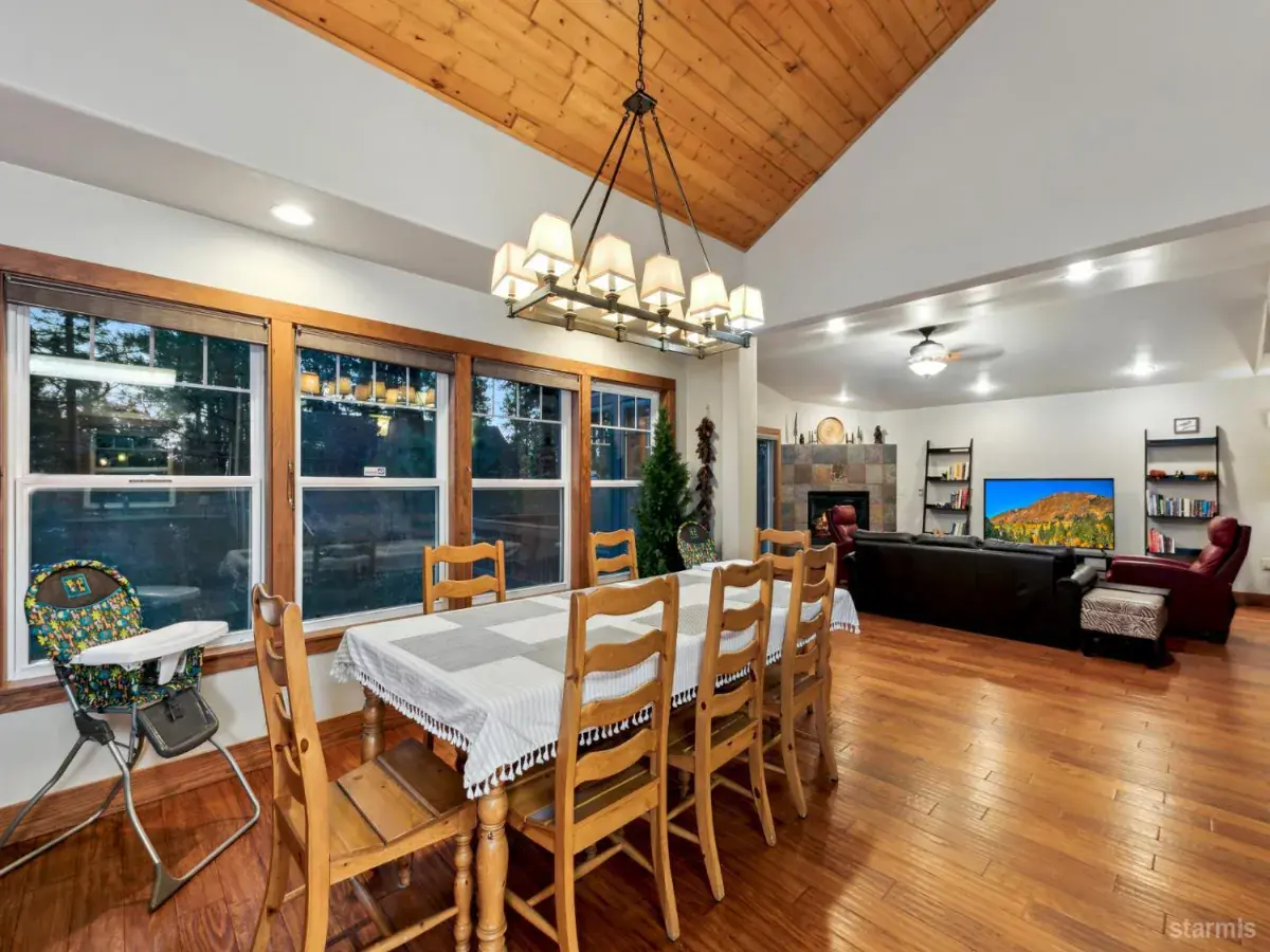 Measure T was recently overturned, and the City of South Lake Tahoe has approved a revised ordinance for vacation home rentals (VHRs) and started accepting permit applications. Set high above it all in the sought-after Lakeview Heights neighborhood of Heavenly Valley, this thoughtfully rebuilt and expanded home (2003) offers a rare blend of convenience, character, and space. Just a stone’s throw from the California Base Lodge at Heavenly Ski Resort and steps away from the iconic Powerline Trailhead, this location perfectly balances outdoor adventure with peace and privacy.A generous three-car garagedetached and engineered with its own truss systempresents endless possibilities for future expansion, guest quarters, or an ADU addition. The substantial driveway easily accommodates vehicles, trailers, or recreational gear.Tucked away on the peaceful hillside, the home is wrapped in beveled vinyl siding and features low-maintenance composite decking, making the exterior ready for Tahoe’s seasons. Step inside to a bright, open layout with zero stairs from garage to living area. The main level showcases soaring pine-lined ceilings, rich distressed wood flooring, and an abundance of natural light.Custom cherry cabinetry, slab granite surfaces, and stainless-steel appliances define the spacious kitchen. Clear pine window casings and suspended grids bring timeless craftsman charm to every room. A gas fireplace with a slate surround anchors the living space and opens to a large outdoor deckideal for entertaining or relaxing under the stars.The lower floor includes two well-proportioned bedrooms, a full bathroom, powder room, and laundry. Upstairs, you’ll find two additional bedrooms, including a large primary suite with dual sinks, tub/shower combo, and an oversized walk-in closet. An airy loft offers a playful retreat, creative workspace, or reading nookframed by unique rooflines and overlooking both the foyer and dining area.Sold mostly furnished and styled with tasteful mountain dcor, this turnkey offering is a rare opportunity in one of South Lake Tahoe’s most desirable enclaves.