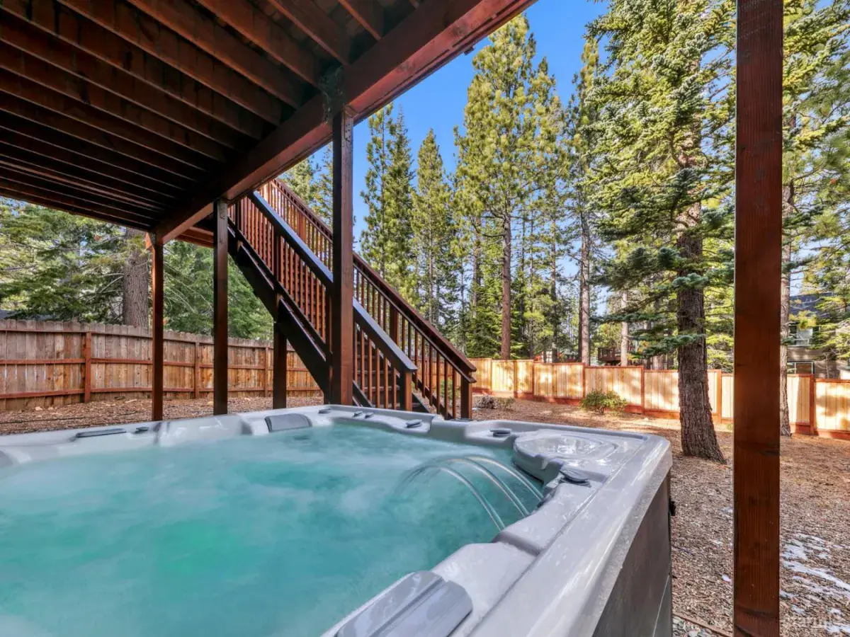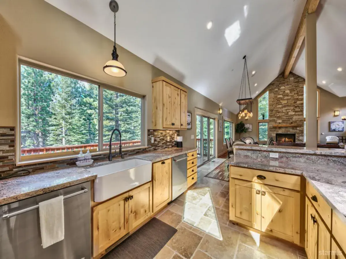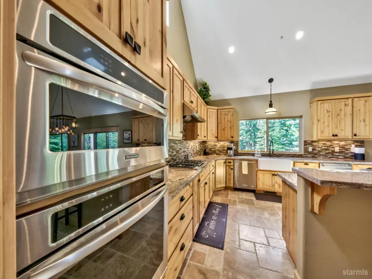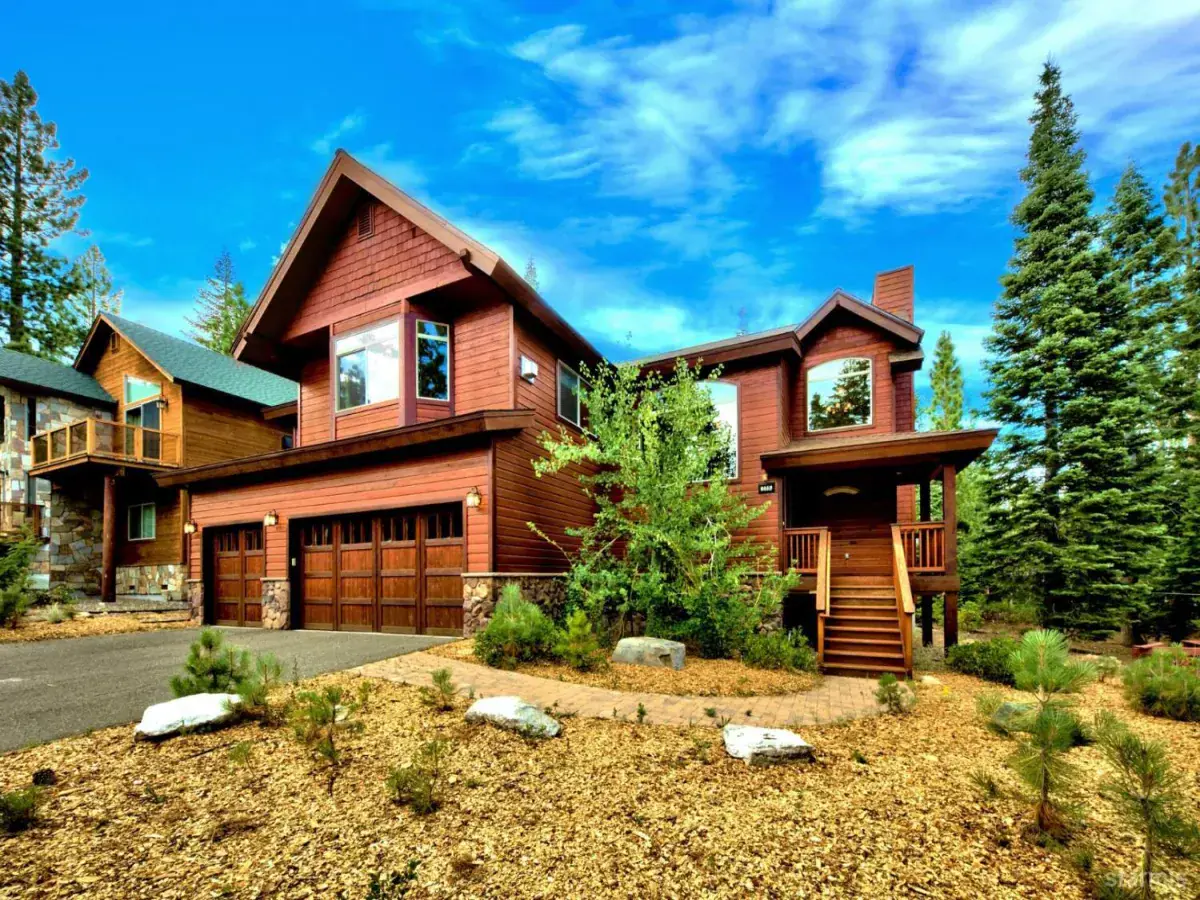 Bordering one of Tahoe’s most recreation-rich forest corridors, this mountain home claims a level 10,000-sf lot in the North Upper Truckee neighborhood, just moments from trail access leading toward Echo Summit. The wide front elevation delivers excellent curb appeal with a 3-car garage, generous covered entry, and varied rooflines. Lap cedar siding, cedar shingles, and stone accents provide a classic Tahoe aesthetic. The south-facing front draws strong natural light, while the fully fenced, flat backyard offers easy year-round usability. A split-level entry sets up an ideal flow, leading to upstairs living with cathedral ceilings, an exposed ridge beam, and a substantial stone fireplace. Warm tones and distressed acacia hardwood flooring elevate the main level. The open layout connects the living room to a large dining area, built-in wine bar, and a well-appointed kitchen with a central L-shaped island, farmhouse sink, two dishwashers, built-in commercial refrigerator, and a walk-in pantry. The upper-level primary suite is oversized and comfortable, featuring its own stone fireplace, a large walk-in closet, and a bath with an extensive dual vanity, 72-inch soaking tub, and stall shower. The lower level centers around a welcoming family room with a third fireplace and direct access to the yard, dual rear decks, and the new 7-person hot tub. Three additional bedrooms and two full baths, including a secondary suite, complete this floor. Multiple outdoor areas create easy indoor-outdoor living and great connectivity to the backyard. Tastefully furnished, the home blends comfort, scale, and timeless Tahoe style in a recreation-rich setting.
