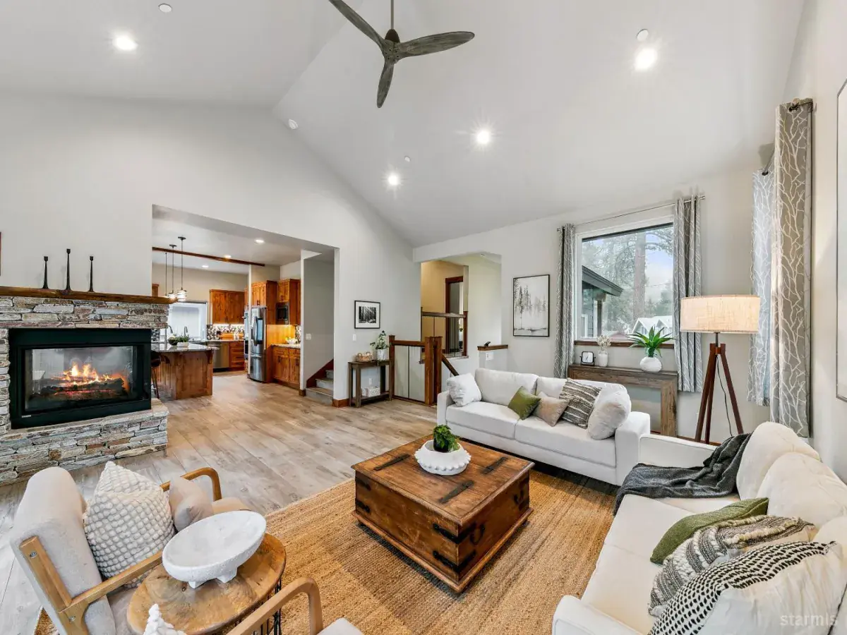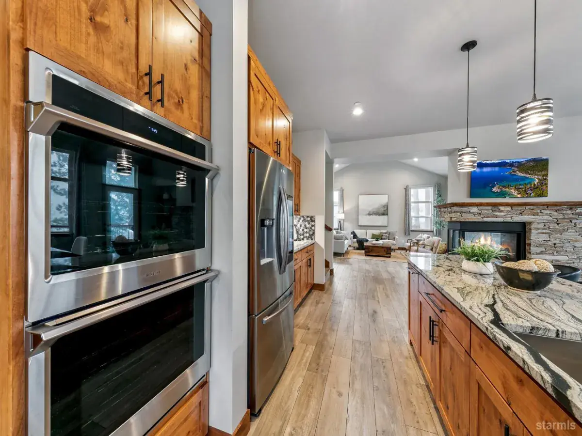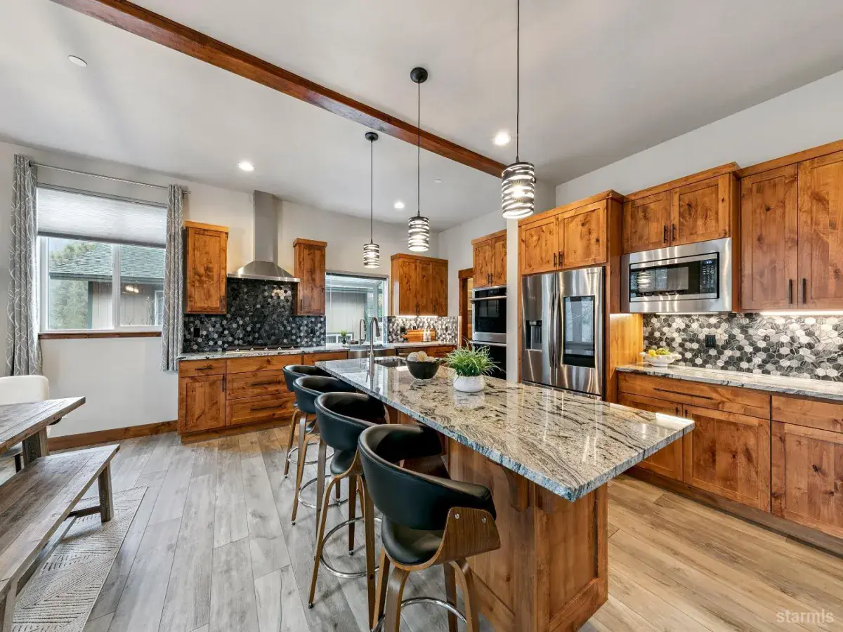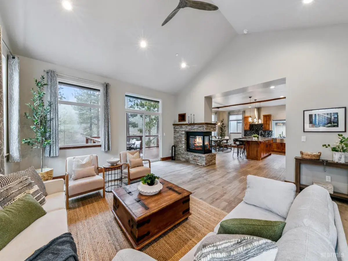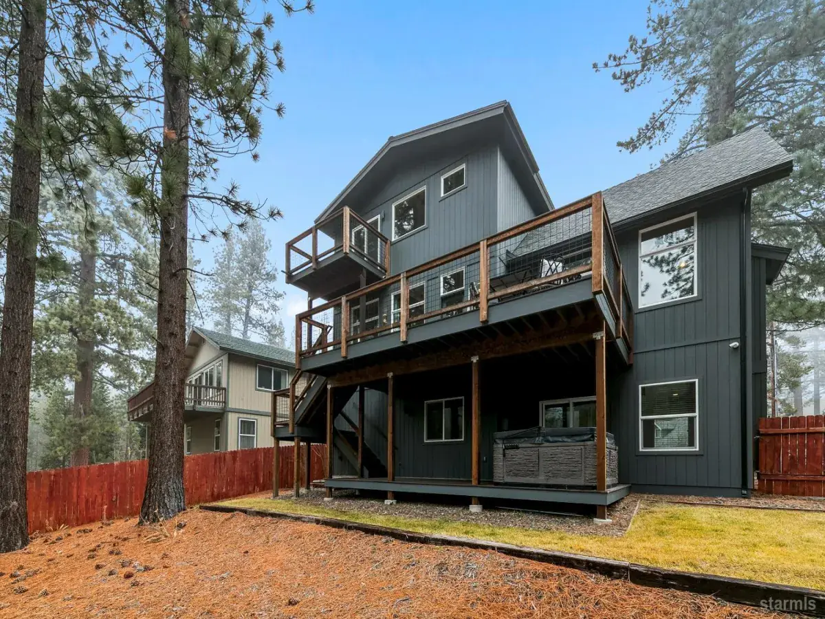 Your search for the perfect home truly ends here. This custom-built masterpiece offers everything you’ve been dreaming of and more.The main level welcomes you with a warm living room featuring a three-sided gas fireplace with a custom rock hearth, a bright and inviting chef’s kitchen, a spacious pantry with a second fridge, and a great room with a large dining area perfect for everyday living and entertaining. There is also an open and bright living space with access to the expansive upper deck and stairs down to the lower level deck and landscaped yard. Down the hallway, you’ll find a bathroom, a guest bedroom, and a primary master with an en-suite bathroom.The third level is dedicated entirely to a grand primary retreat, featuring a private deck, an expansive bedroom, a walk-in closet with skylight, and a luxurious spa-like bathroom.The ground level offers two additional bedrooms, a full bathroom, and a generous family / game room with a second gas fireplace, ideal for cozy winter evenings in Lake Tahoe.Enjoy lavish low maintenance decks on every level, providing plenty of space for entertaining, hosting memorable gatherings, or unwinding in your private jacuzzi.Additional highlights include: radiant in-floor heating throughout (with six zones that allow for custom control), custom tile work including a travertine entryway, on-demand hot water, and ample storage space including a walk-in attic space, custom shelves in the garage, and 120 sqft storage shed.Words can’t fully capture the beauty and elegance of this exceptional property.