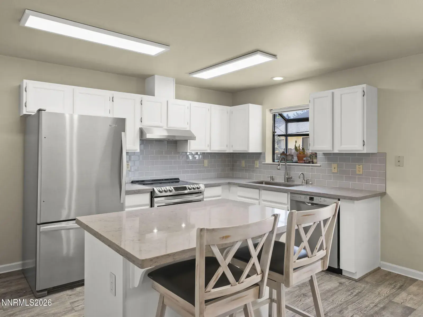 Stunning Gardnerville Ranchos home with exceptional upgrades and mountain views. This beautifully maintained single-level residence sits on a spacious quarter-acre corner lot and offers 1,750± sq ft of thoughtfully designed living space, perfect for both everyday comfort and entertaining. The open great room is anchored by a cozy gas fireplace and flows seamlessly into the updated kitchen, featuring quartz countertops, subway tile backsplash, a large island workspace, pantry, induction range, Bosch dishwasher, refrigerator, and instant hot water faucet. Washer and dryer are included for added convenience. An expansive bonus or recreation room with wet bar and dual sliding glass doors provides flexible space for a home office, media room, gym, or guest retreat with direct access to the backyard. The home offers three well-appointed bedrooms and two updated bathrooms finished with quartz and quality fixtures. Natural light fills the home and highlights peaceful mountain views throughout. Outdoors, enjoy a low-maintenance xeriscaped yard with paver patio, mature fruit trees, RV carport, and a detached two-car garage with both 30-amp and 50-amp hookups, ideal for toys, hobbies, or workshop space. No HOA and ample parking provide added freedom and functionality. This is a rare opportunity to own a move-in ready, upgraded property – combining lifestyle, flexibility, and long-term value.