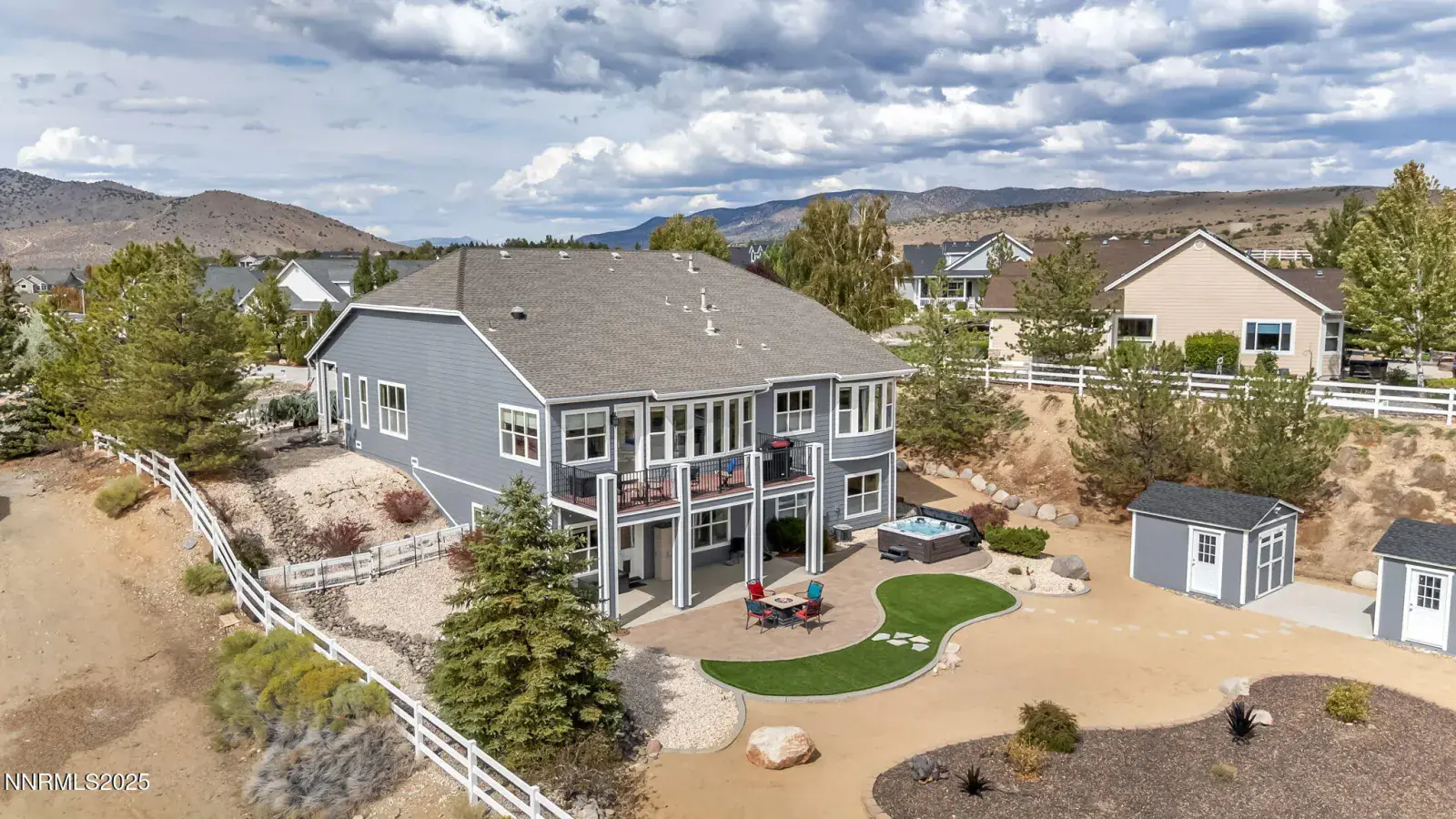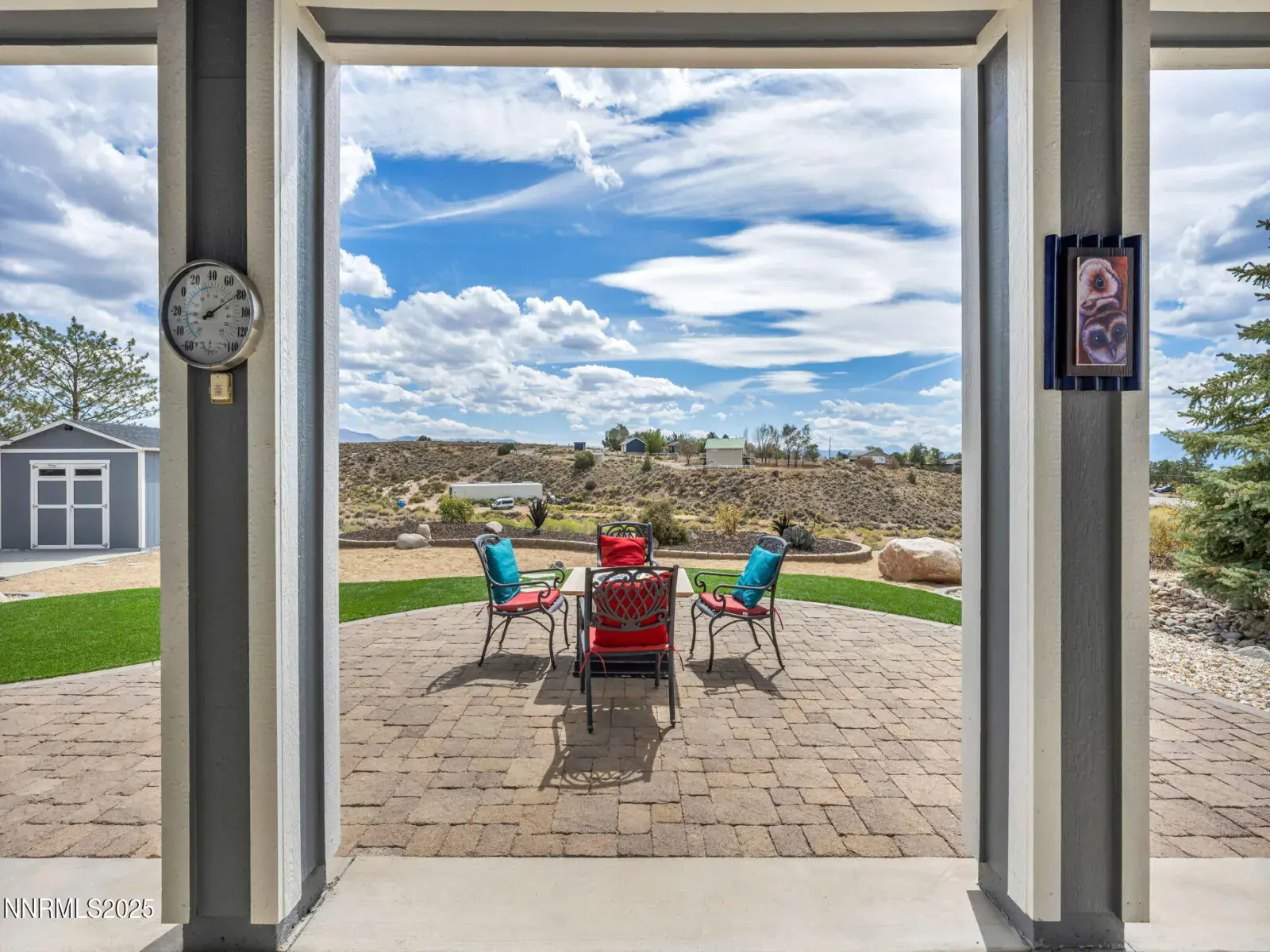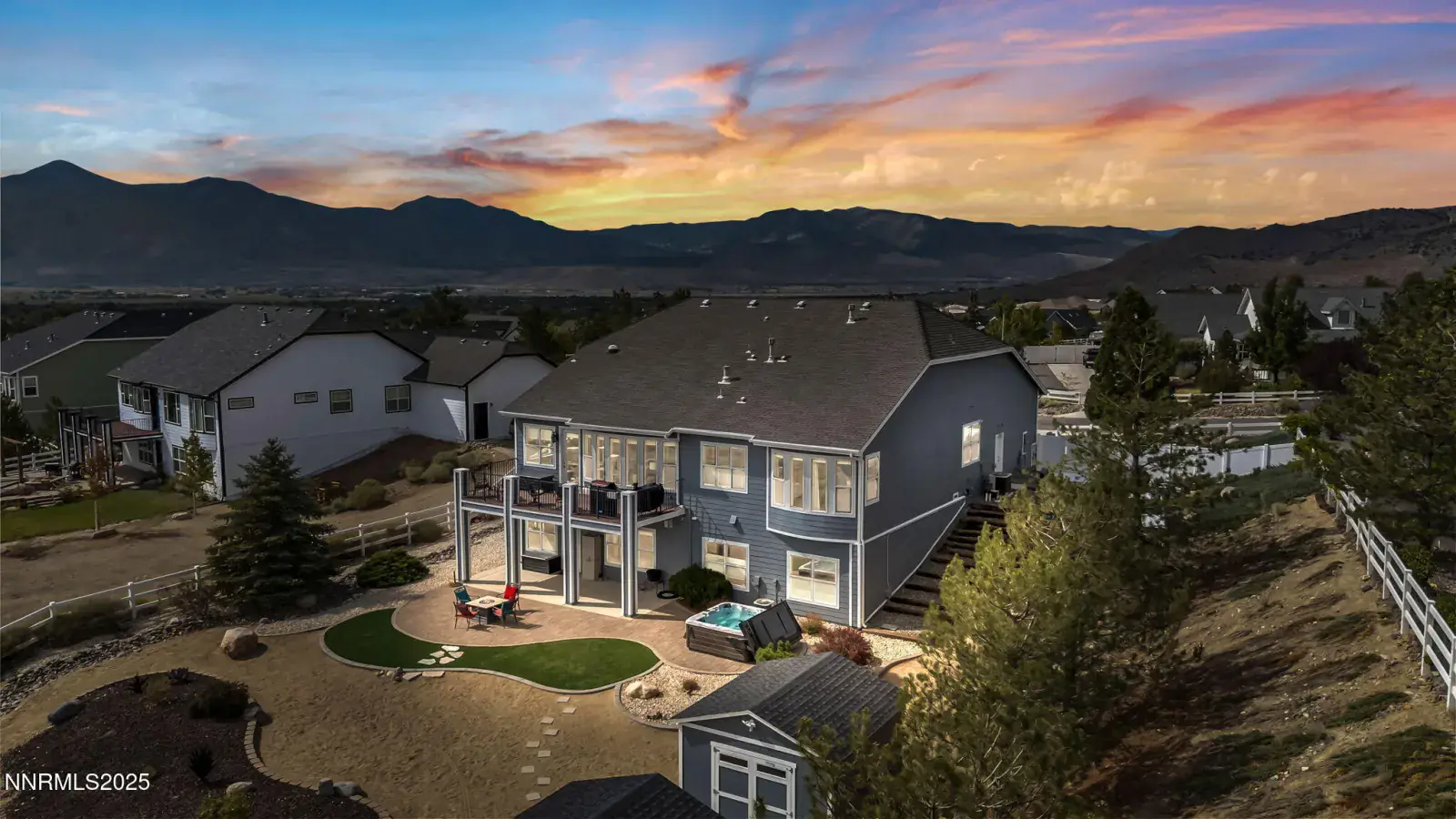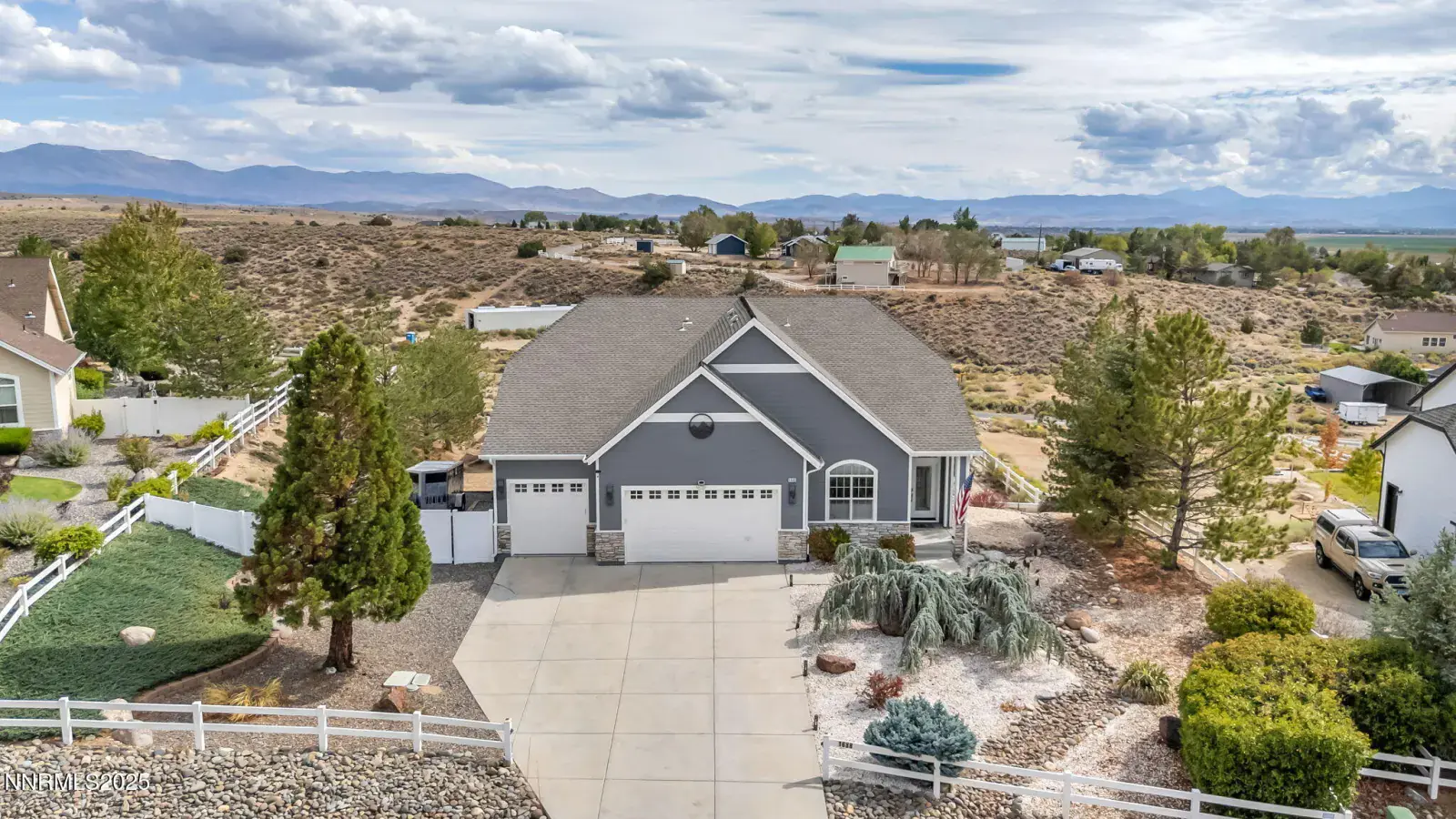 Set on just over an acre in the desirable Skyline Ranch community, this beautifully updated 4-bed, 4-bath home offers luxury, comfort, and functionality with breathtaking views of the Pine Nut Mountains and Sierra Nevada. Inside, enjoy quality craftsmanship with real maple and walnut hardwood flooring, an updated kitchen with newer appliances. The spacious layout includes a main-level master suite with an electric fireplace, and spa-like bath. Additional features include zoned climate control with dual WiFi-enabled thermostats, built-in stereo system, and upgraded lighting throughout. Downstairs is another living area with 2 bedrooms, full bathroom and a full wet bar. Exterior highlights include a new craftsman-style insulated front door, motion-sensing security lights, recent professional paint, ultra-quiet garage opener and RV parking with power hookup. Outdoor living is made easy with an upper level deck, lower level covered patio, hot tub, and two powered workshops. Located near BLM land for easy outdoor access in a quiet, low-traffic neighborhood, this home combines modern amenities with the natural beauty of Northern Nevada, truly a Skyline Ranch gem.