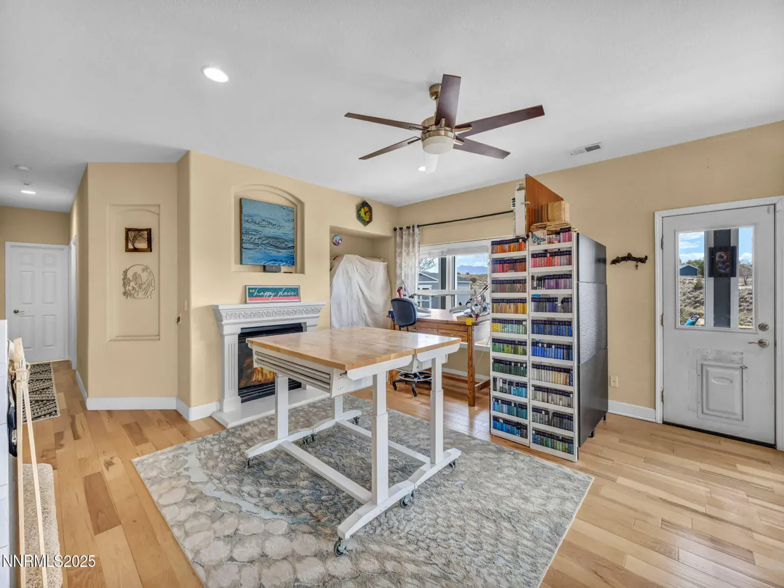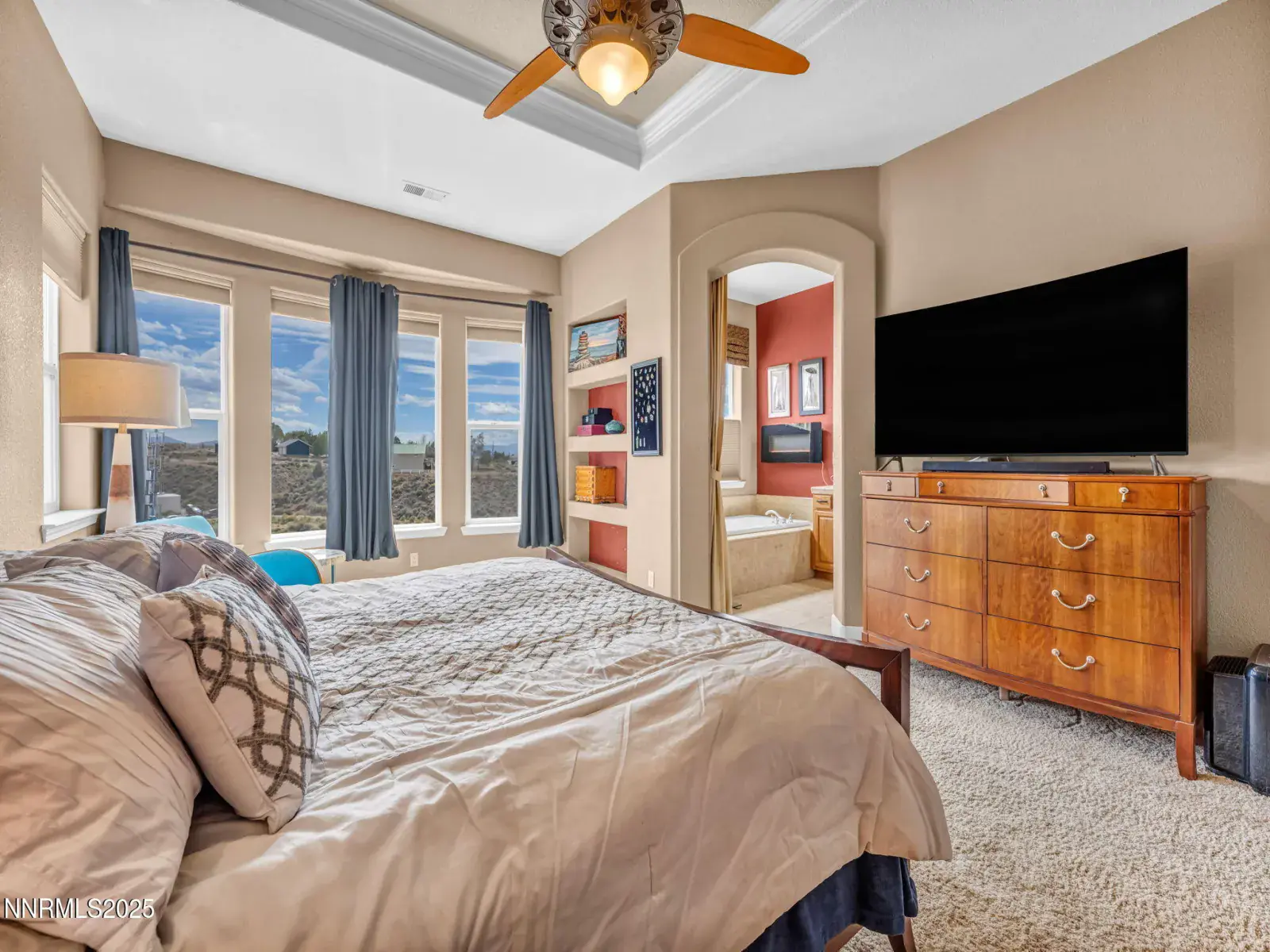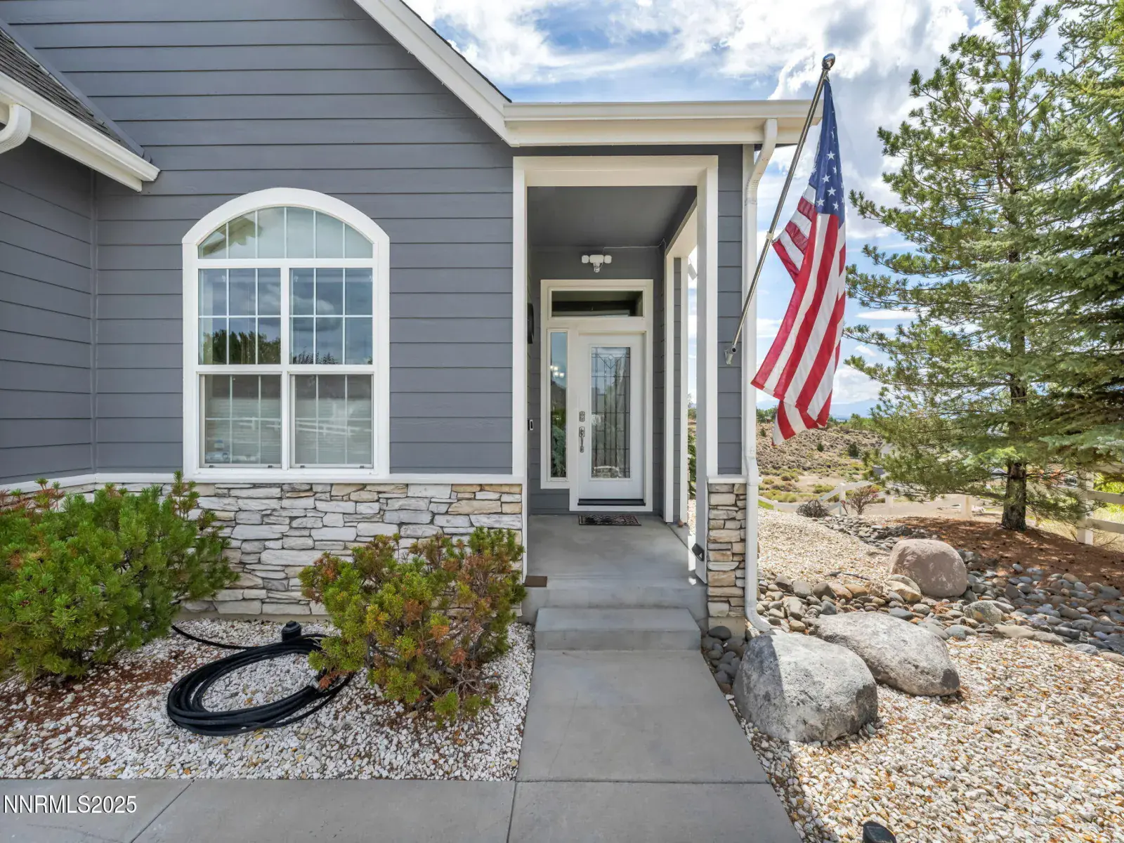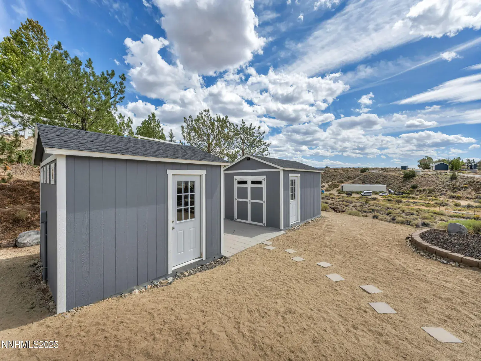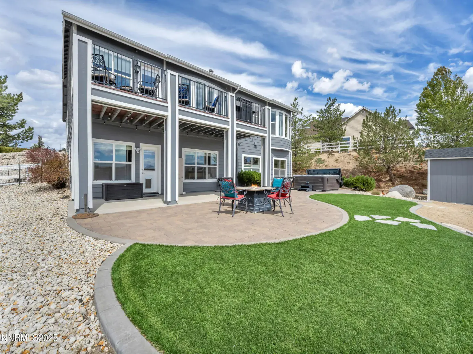 Set on just over an acre in the desirable Skyline Ranch community, this beautifully updated 4-bed, 4-bath home offers luxury, comfort, and functionality with breathtaking views of the Pine Nut Mountains and Sierra Nevada. Inside, enjoy quality craftsmanship with real maple and walnut hardwood flooring, an updated kitchen with newer appliances. The spacious layout includes a main-level master suite with an electric fireplace, and spa-like bath. Additional features include zoned climate control with dual WiFi-enabled thermostats, built-in stereo system, and upgraded lighting throughout. Downstairs is another living area with 2 bedrooms, full bathroom and a full wet bar. Exterior highlights include a new craftsman-style insulated front door, motion-sensing security lights, recent professional paint, ultra-quiet garage opener and RV parking with power hookup. Outdoor living is made easy with an upper level deck, lower level covered patio, hot tub, and two powered workshops. Located near BLM land for easy outdoor access in a quiet, low-traffic neighborhood, this home combines modern amenities with the natural beauty of Northern Nevada, truly a Skyline Ranch gem.