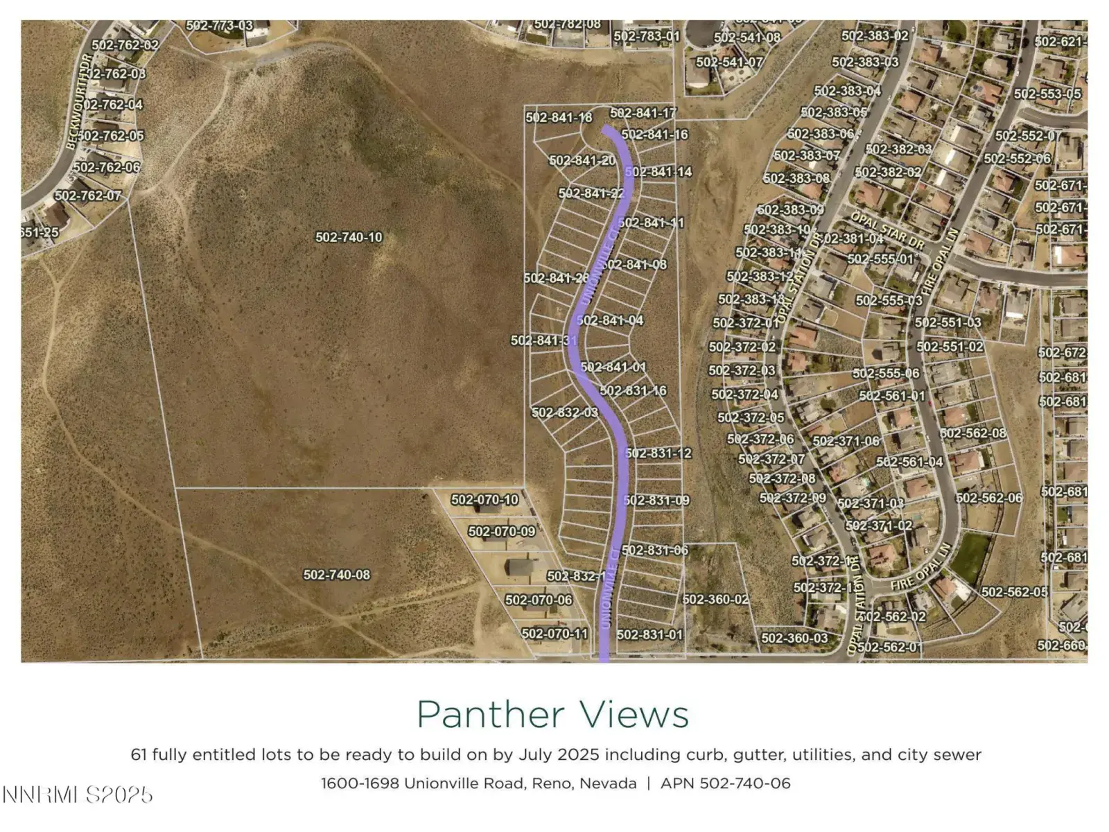 Panther Views is a newly developed residential subdivision offering 61 finished lots in the growing Unionville area of Northern Nevada. Estimated completion of subdivision improvements is September 2025. Each lot will be delivered with water, sewer, electricity, and dry utilities stubbed to the lot line, along with completed roads, and other public improvements per approved civil plans. Ideal opportunity for builders seeking a streamlined path to vertical construction. Lot pricing at $150,000; seller open to phased purchase structure. Contact listing broker for full due diligence packet and terms.