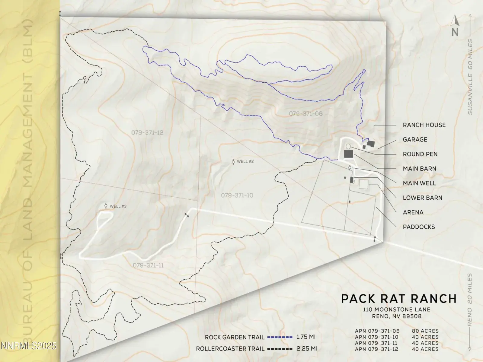 A once-in-a-lifetime 200-acre legacy ranch in Red Rock, where rugged wilderness meets refined Western living. This private holding captures the essence of Nevada’s open range—rolling hills, panoramic vistas, and miles of trails that begin right off your back porch. Comprising four contiguous parcels, the property’s western boundary adjoins over 50,000 acres of BLM land, offering direct and unrestricted access to the Sand Hills and Peterson Wilderness—a vast and untamed expanse ideal for trail riding, hiking, and exploring Nevada’s backcountry in pure solitude. The ranch-style residence crowns an elevated ridge with sweeping, cinematic views in every direction. Completely reimagined in 2016, the home blends rustic craftsmanship with understated luxury—featuring Aries Brothers cabinetry, leathered granite counters, Wolf, Miele and Zephyr appliances, a true cast iron clawfoot tub, and real hardwood flooring throughout. Custom built-ins accent each room, and a Jotul wood-burning fireplace with a reclaimed timber mantle from the Davis Creek Ranch anchor the great room, while every window frames an ever-changing visual masterpiece – Sand Hills and Peterson Mountain Wilderness, the Dog Skins and Virginia Peak, Fred’s Mountain, and even down to Sonora Pass along the sweeping Eastern Sierra front – almost 120 miles! The equestrian compound is purpose-built for those who ride, train, or simply live the lifestyle. A custom six-stall cedar barn showcases handcrafted ironwork designed for durability and beauty. A secondary barn provides two additional stalls, hay and equipment storage, and a wash rack. The professional-grade 90′ x 90′ arena and round pen—each built with reclaimed oil field piping and deep concrete footers—are designed to handle serious use. Two custom single-track, multi-use trails of 4.5 miles wind through the property. Rollercoaster trail ascends to the property summit with stunning views back onto the home and barns and up into the exquisite rocks of the Sand Hills. Rock Garden trail explores quartz-laced, wind-carved boulders, and summits the iconic property mesa with 360-degree views of colorful mountains and sweeping valleys unlike anywhere else in Northern Nevada. For the discerning buyer seeking adventure, privacy, majestic scenery, and connection to the land, this property offers it all—breathtaking sunrises and Alpen-glow sunsets, crisp snow-capped horizons, and endless adventure by horseback, mountain bike, on foot or on side-by-side. Just 20 minutes from town, yet it feels a world apart—an authentic Nevada sanctuary, truly one of a kind. 4 Parcel IDs : 079-371-06, 079-371-10, 079-371-11, 079-371-12