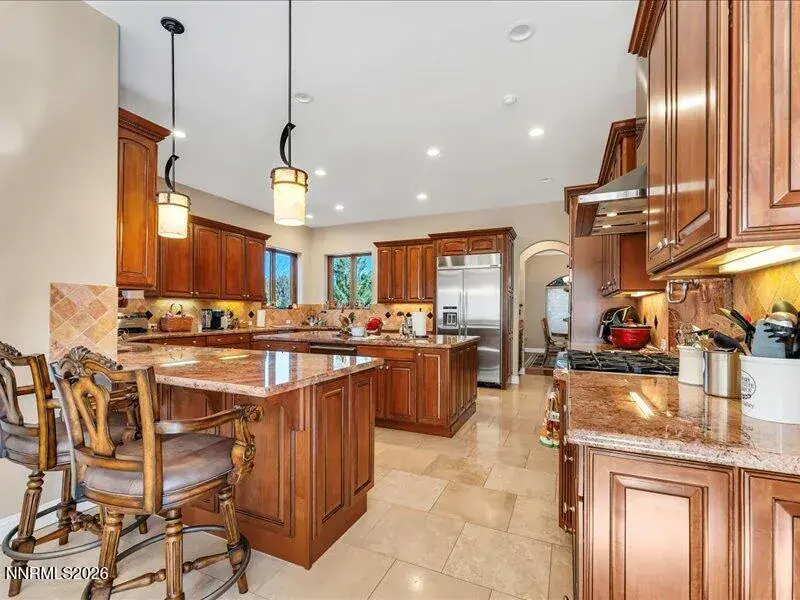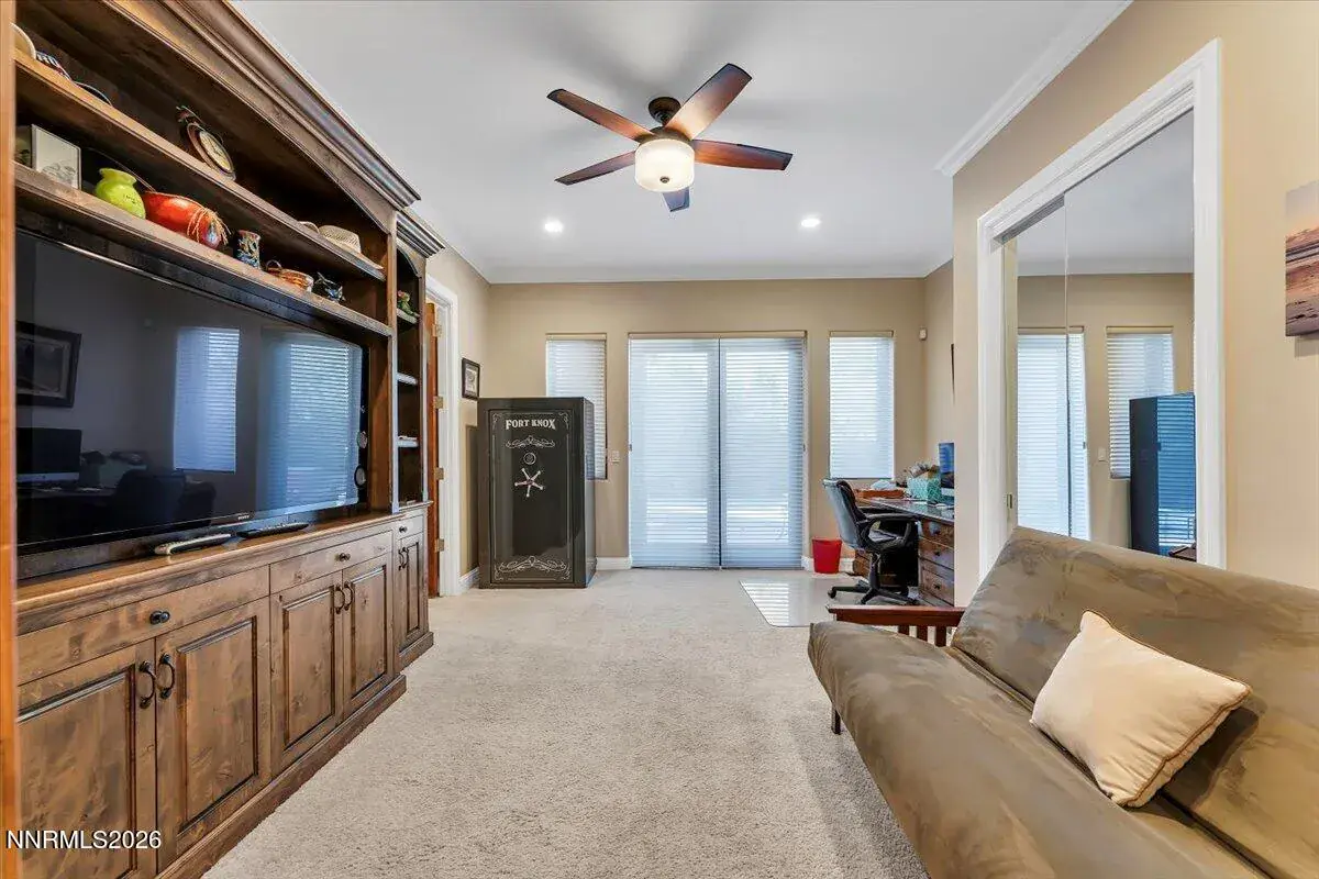 A South Reno Estate That Redefines Luxury Living – With No HOA. If you’re looking for a home that offers both Privacy and beautiful Trees, this sprawling single-story estate in South Reno is for you. Step through the grand foyer, and you’re greeted by a series of expansive common areas, with flooring that creates a warm yet sophisticated ambiance. This home seamlessly blends modern upgrades with timeless appeal. And if you’re into entertaining, this place has you covered. This property boasts construction with insulated concrete forms, meaning superior energy efficiency and soundproofing. There’s a custom home theater, a wine fridge big enough to keep the collection ready for guests, an in-ground pool, and a garage setup that’s a car lover’s dream. The kitchen features top-of-the-line appliances, a Wolf range, granite countertops, and opens to a dining area with views of the lush grounds and sparkling pool. And, the kitchen is a chef’s dream come to life complete with stunning cabinetry, sleek stainless-steel appliances, an oversized island, and a breakfast bar. It’s got a bit of everything: striking architectural details, a layout that’s equal parts cozy and impressive, and finishes that make every room feel like a statement piece. It’s the kind of place that invites you to entertain, unwind, and just live without compromise. For entertaining or everyday relaxation there is a formal dining room and a living room. The family room, with its cozy fireplace, opens directly to the pool and gazebo area. The master suite is the ultimate retreat complete with access to a covered patio and proximity to the pool and hot tub. And, of course, you’ve got separate his-and-her bath areas, with his featuring a steam shower. The oversized closet and adjacent office space round out the suite, making it as functional as it is luxurious. Nestled in an exclusive, gated compound of just three custom homes, this estate offers the privacy you crave with all the convenience you need. Located close to golf courses, major shopping, and fine dining, you’re also just 15 minutes from Reno-Tahoe International Airport and 25 minutes from Lake Tahoe. Remodeled in 2014 to add a home theater, a private cabana area and expand the RV garage. With three bays plus room for an RV, you’ve got space for your cars and your next project. If you’re not filling it with vehicles, the space could easily convert to guest quarters. Piano is not included in the purchase price but could be sold if buyer desires.
