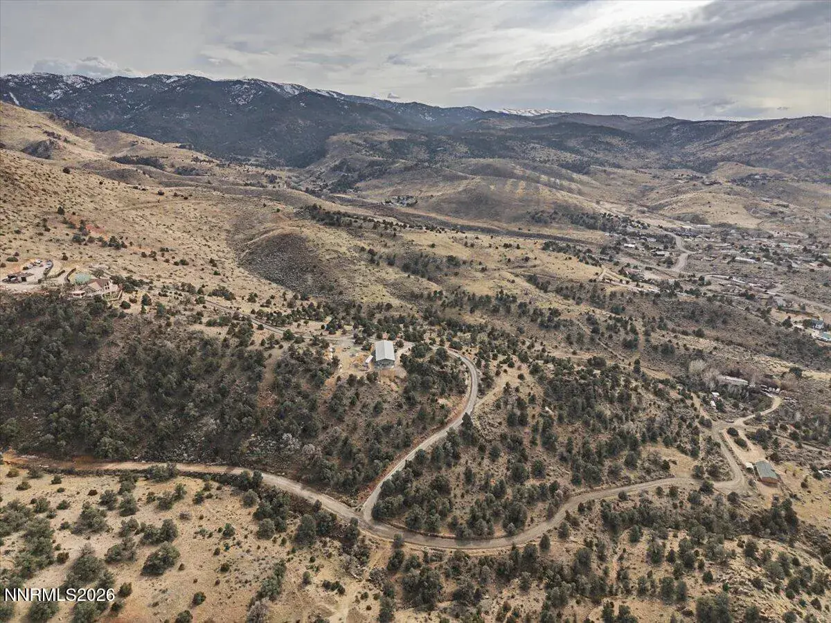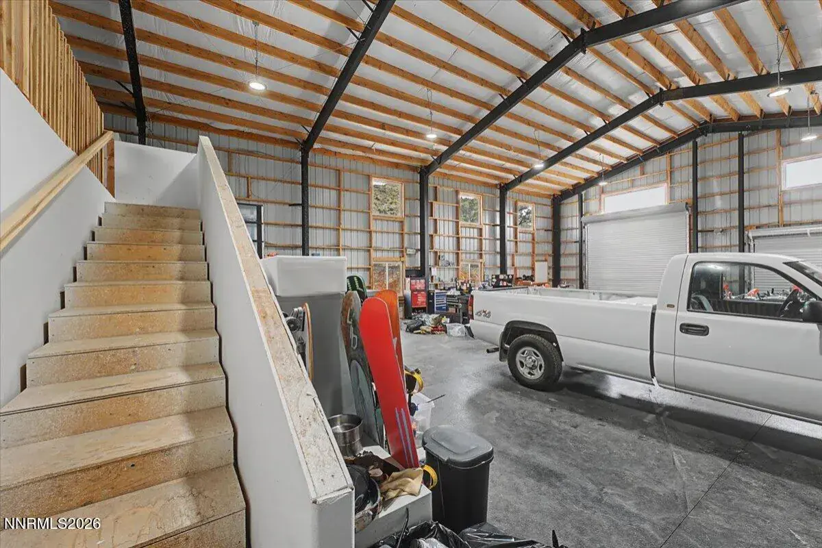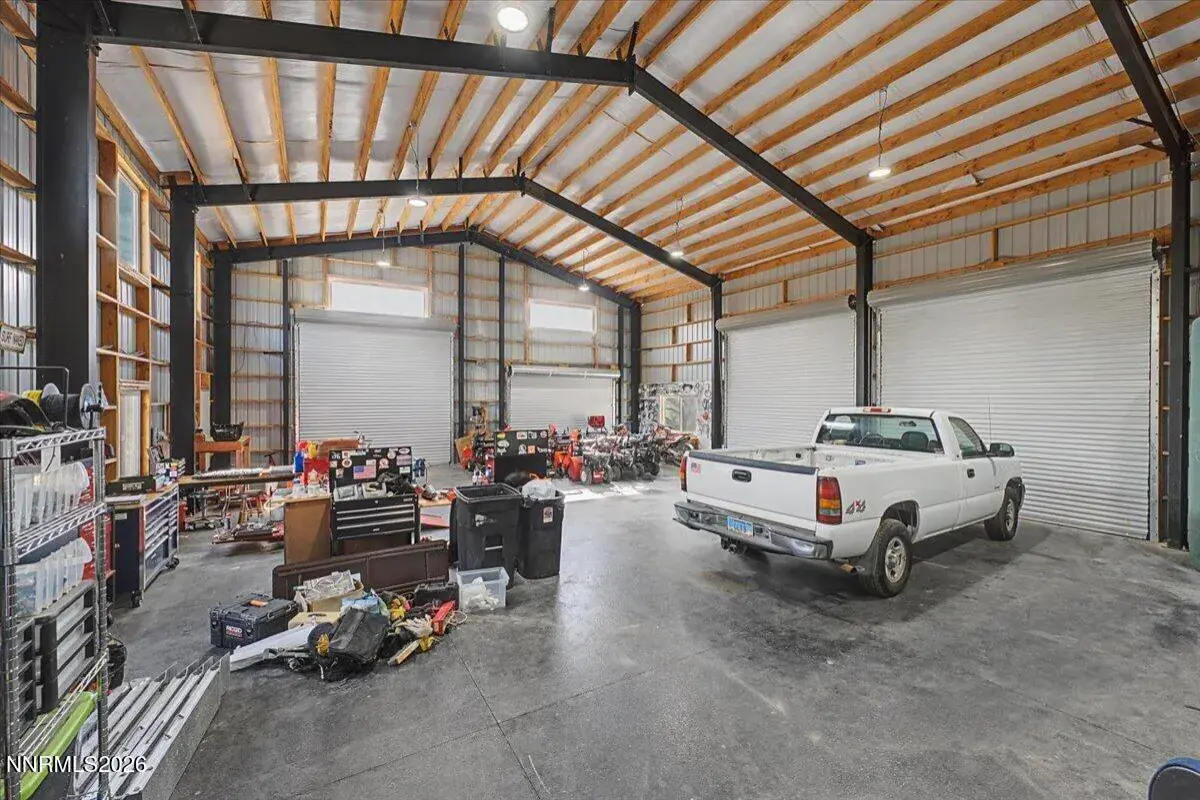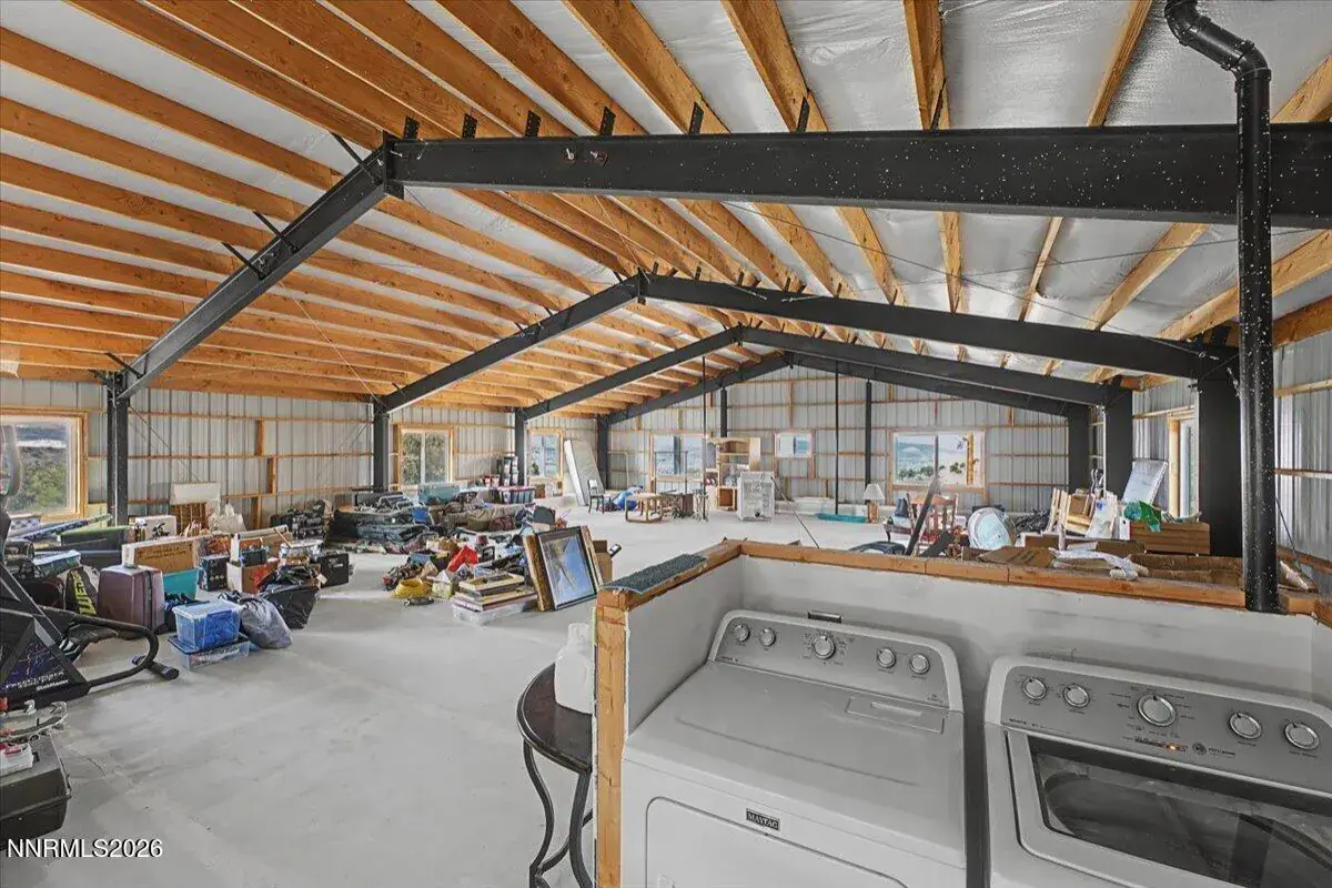 A rare opportunity in South Reno located in the Virginia Foothills offering flexibility, functionality, and expansive views. Situated across four separate parcels totaling 27.684 acres, this barndominium-style property delivers true Nevada living just minutes from the city. The total building footprint measures approximately 4,080 square feet (102 feet by 40 feet), not including the covered patio. The structure currently features 1,726 square feet of finished living space, including 2 bedrooms, 2 bathrooms, and an open great room design that blends comfort with industrial character. Above, an additional 1,726 square foot mezzanine offers substantial expansion potential for future living space, office, recreation, or storage. The attached shop spans over 2,000 square feet with impressive 22 foot 10 inch ceiling height and four roll-up doors, including two 12 foot 6 inch doors, one 14 foot door, and one 10 foot door, providing exceptional access for equipment, vehicles, or workspace needs. A 640 square foot covered patio (16 feet by 40 feet) extends the living space outdoors and offers the opportunity to expand with a wraparound deck to maximize views and outdoor living. Positioned to capture sweeping views of the Sierra Mountains, the Virginia Range, and the City of Reno, the property offers both privacy and proximity. The four separate parcels provide flexibility for future development, additional structures, or long-term planning. Whether envisioning additional residences, equestrian facilities, expanded shop space, or simply enjoying wide open acreage with room to grow, this property offers possibilities rarely found so close to town. A unique blend of country setting and convenience creates an opportunity unlike anything else currently available in the area. APN 016-762-39 5 acres with residence, APN 016-762-41 5 acres vacant land, APN 016-762-38 5 acres vacant land & APN 016-762-42 12.684 acres all included in the sale.