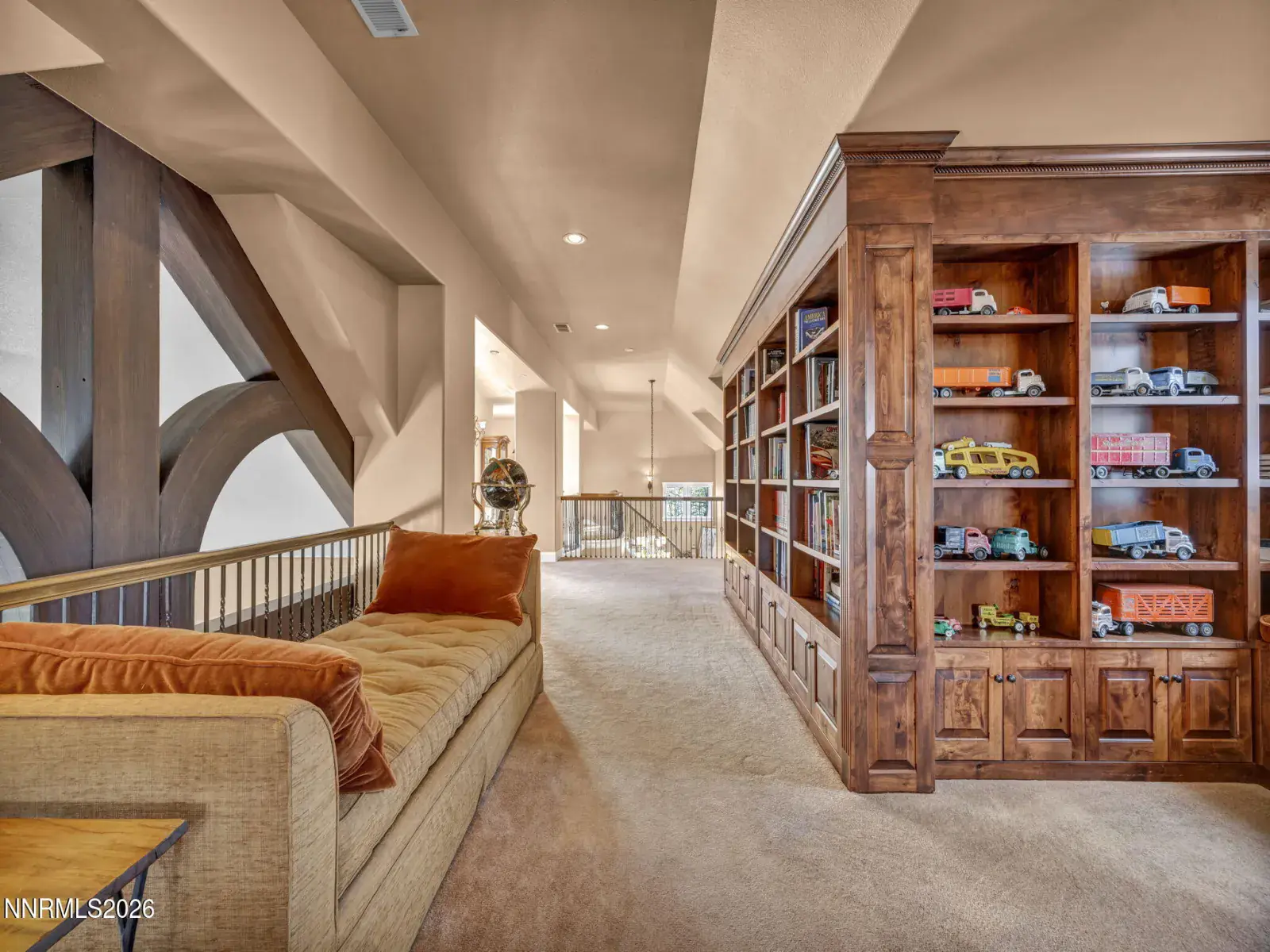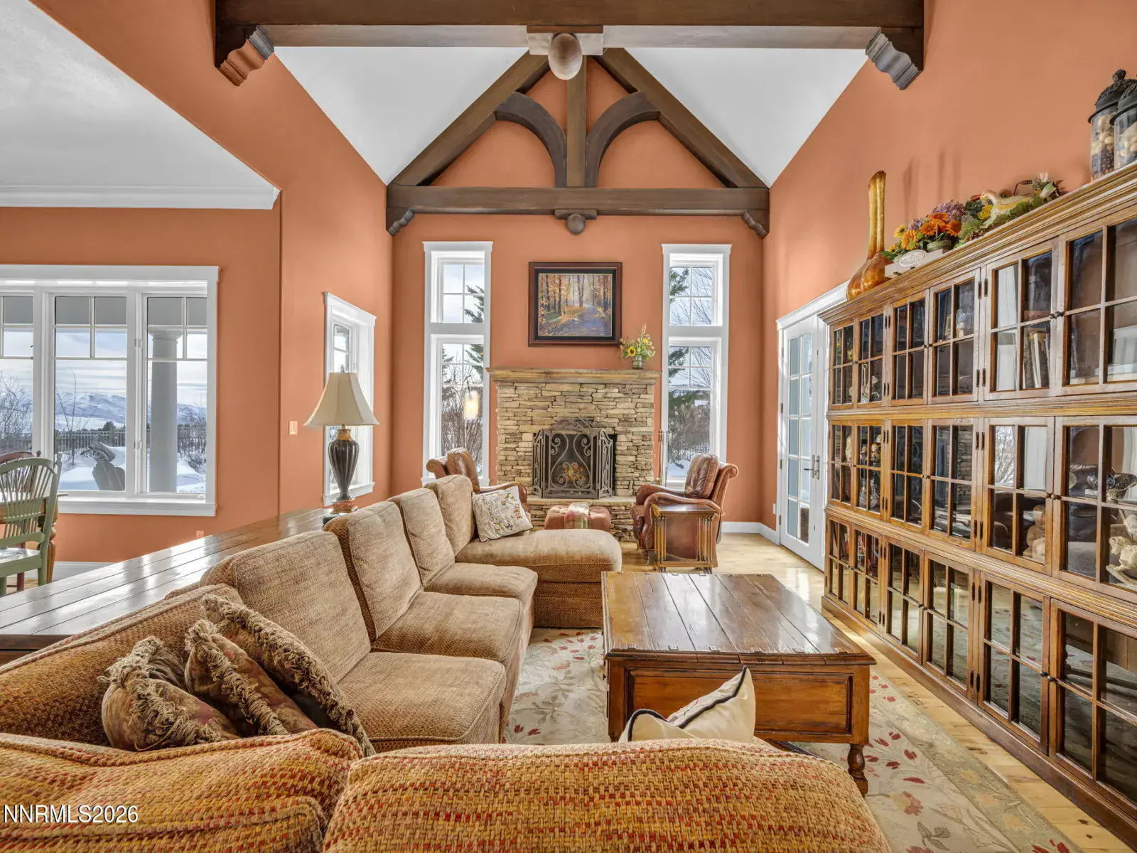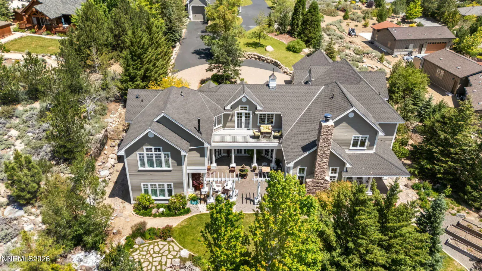 Pristine mountain views and golf course serenity out your back door. Over 10,000 square feet under roof —with no HOA. Privacy and close to shopping, freeway, airport, ski slopes, and Carson City. Designed for those who want space, privacy, and presence, this custom-built estate that backs directly to Montreux Golf Course and captures stunning Mt. Rose views from both the main and upper levels — including from the entertainer’s courtyard with a lush backyard and over 6,400 square feet of open concept living space, this home blends mountain luxury with everyday livability. Featuring a custom kitchen open to family room with soaring ceilings, character hickory floors, formal and informal dining options and an additional Coffee/Beverage center. This home has natural gas, 4 furnaces and 3 fireplaces for additional warming in winter and 2 AC units for the hot summer days. An architectural staircase anchors the home, with a second staircase that leads to the upstairs game room with wet bar and built in library. The main-level primary suite opens directly to the courtyard — perfect for morning coffee with fresh mountain air. Upstairs, a second primary suite, game room, and two additional guest rooms with on suite bathrooms create an ideal multi-generational or extended-stay layout. The attached 1,100+ square foot three-car garage provides ample room for daily drivers or hobby vehicles. For those who value lifestyle flexibility, the architecturally matching detached 2,000+ square foot garage is a rare find — built to accommodate a 40-foot RV with a 14-foot door, complete with 4 post car lift, tankless water heater, and half bath. Above it, is a separate studio offers space for guests, a gym, office, or creative escape. Outdoors, mature landscaping, manicured lawns, fenced yard space, and a circular driveway create both elegance and functionality — designed for effortless entertaining and easy vehicle flow.