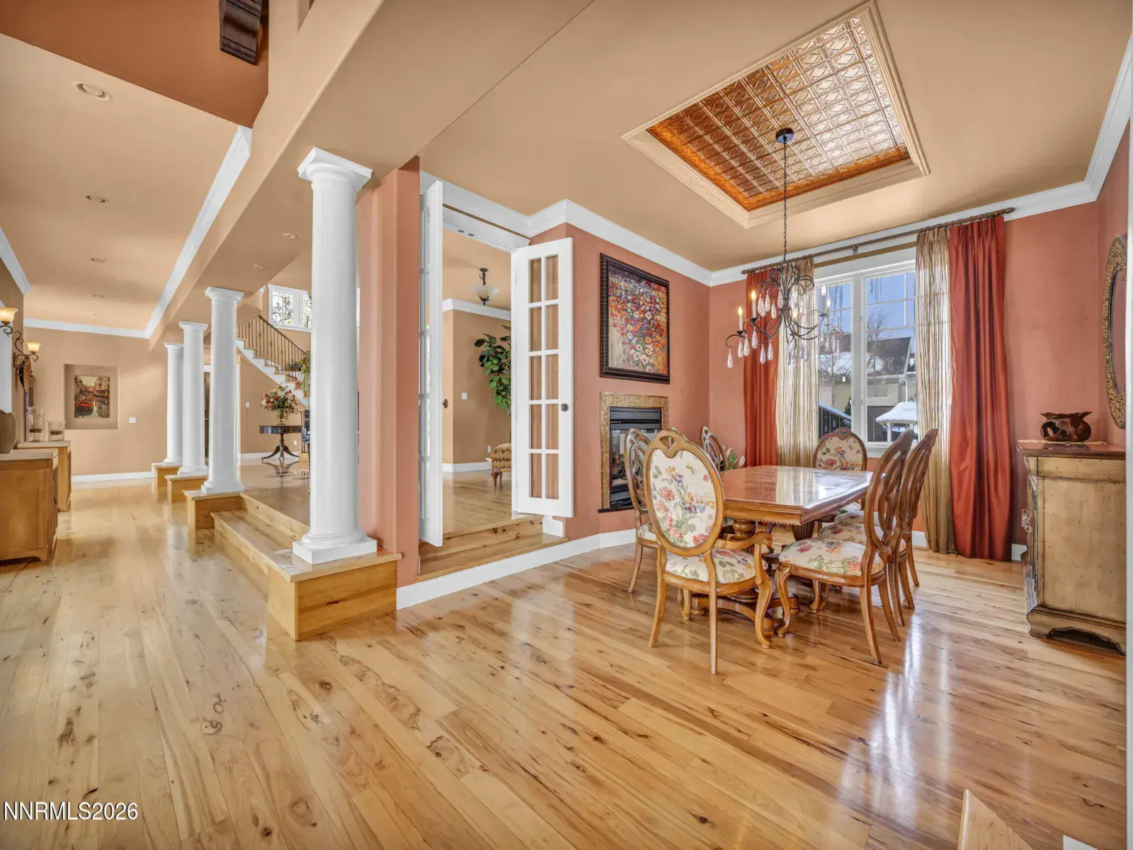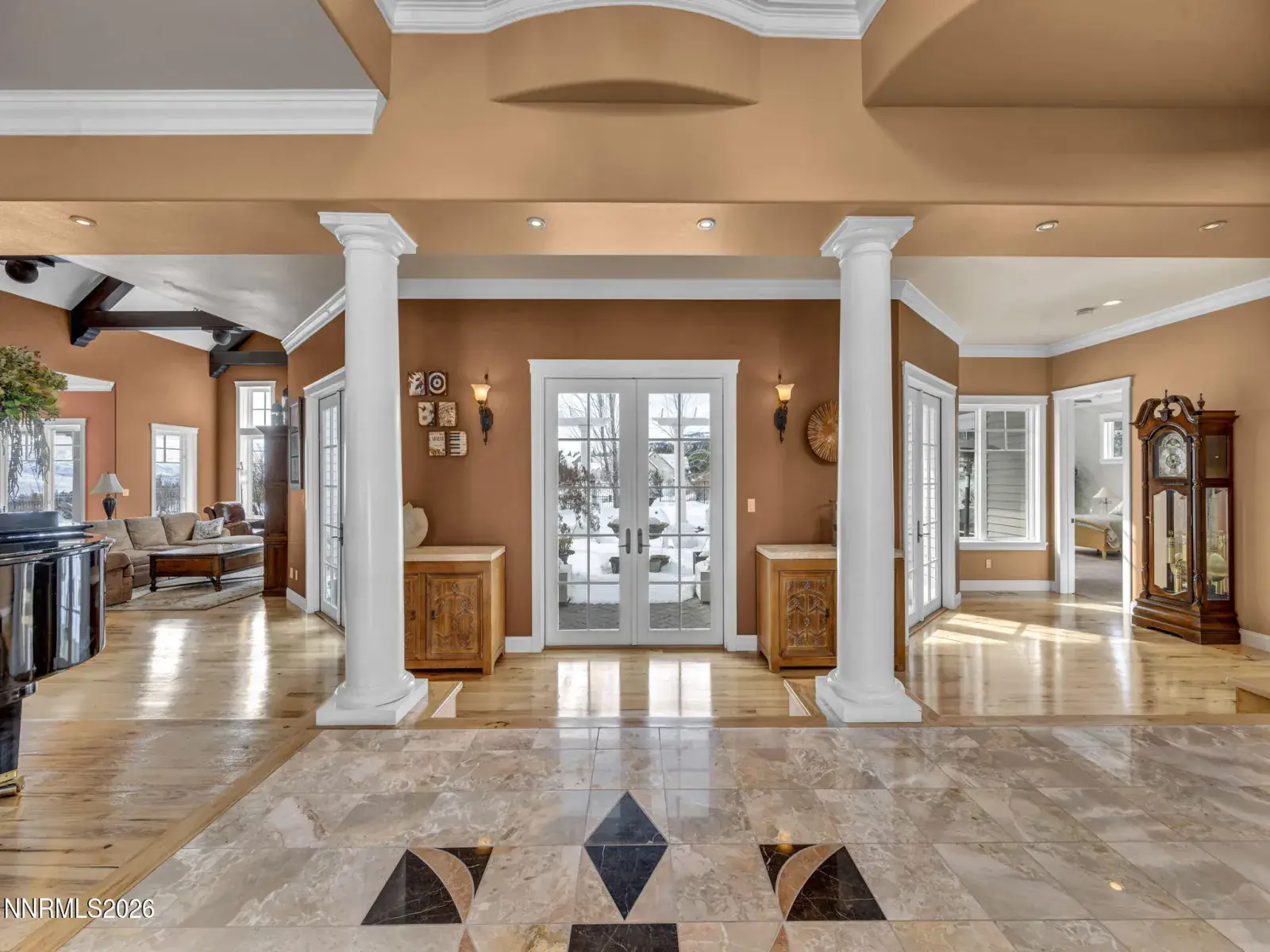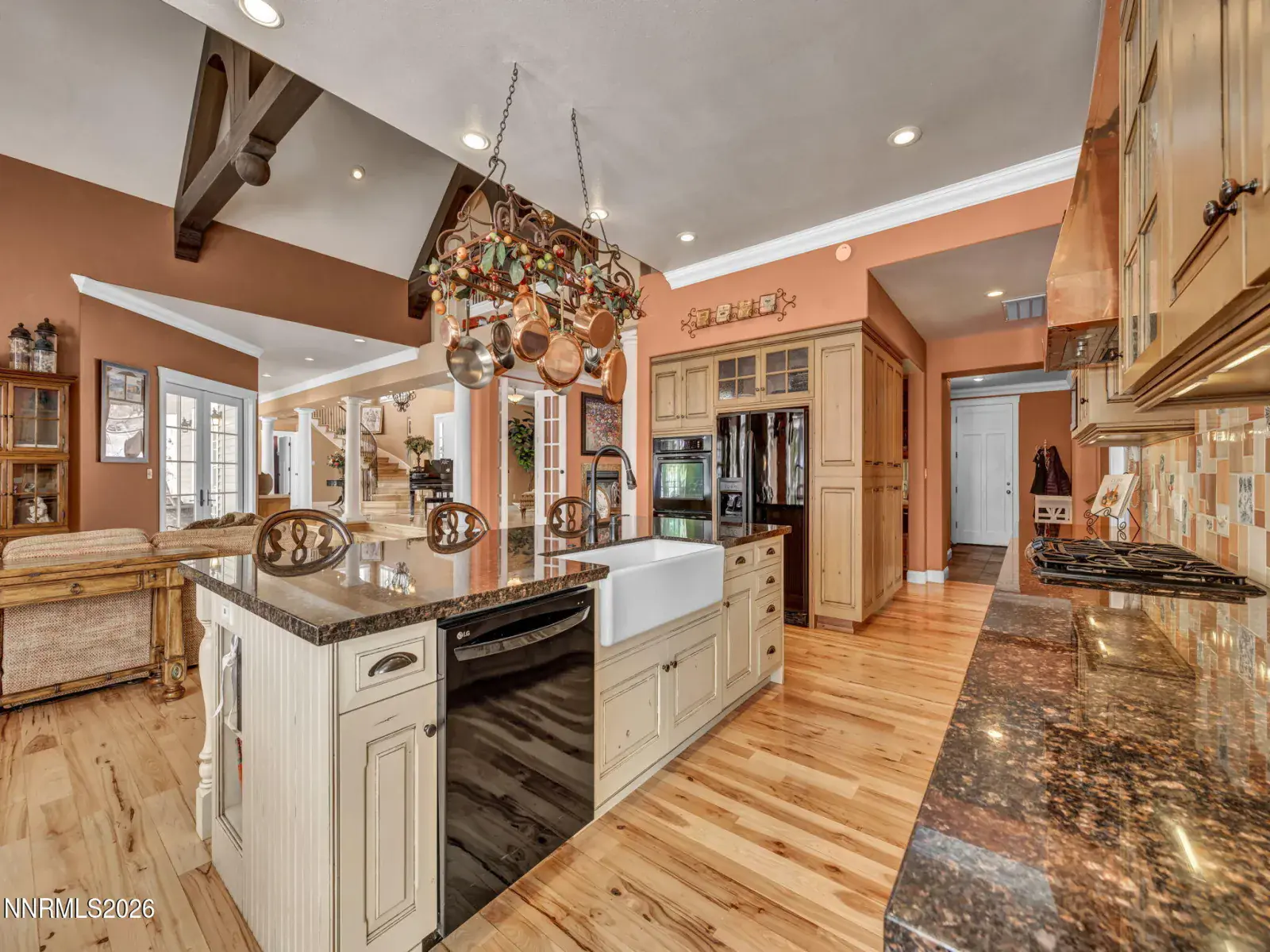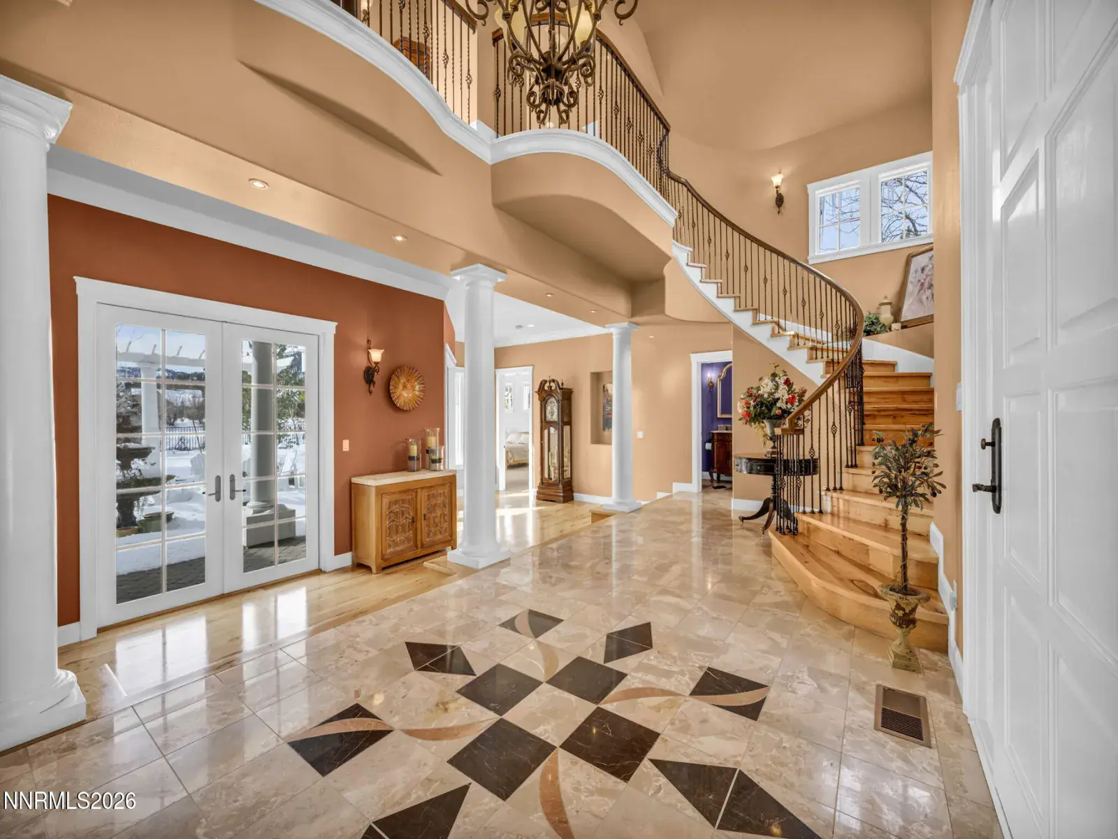 Pristine mountain views and golf course serenity out your back door. Over 10,000 square feet under roof —with no HOA. Privacy and close to shopping, freeway, airport, ski slopes, and Carson City. Designed for those who want space, privacy, and presence, this custom-built estate that backs directly to Montreux Golf Course and captures stunning Mt. Rose views from both the main and upper levels — including from the entertainer’s courtyard with a lush backyard and over 6,400 square feet of open concept living space, this home blends mountain luxury with everyday livability. Featuring a custom kitchen open to family room with soaring ceilings, character hickory floors, formal and informal dining options and an additional Coffee/Beverage center. This home has natural gas, 4 furnaces and 3 fireplaces for additional warming in winter and 2 AC units for the hot summer days. An architectural staircase anchors the home, with a second staircase that leads to the upstairs game room with wet bar and built in library. The main-level primary suite opens directly to the courtyard — perfect for morning coffee with fresh mountain air. Upstairs, a second primary suite, game room, and two additional guest rooms with on suite bathrooms create an ideal multi-generational or extended-stay layout. The attached 1,100+ square foot three-car garage provides ample room for daily drivers or hobby vehicles. For those who value lifestyle flexibility, the architecturally matching detached 2,000+ square foot garage is a rare find — built to accommodate a 40-foot RV with a 14-foot door, complete with 4 post car lift, tankless water heater, and half bath. Above it, is a separate studio offers space for guests, a gym, office, or creative escape. Outdoors, mature landscaping, manicured lawns, fenced yard space, and a circular driveway create both elegance and functionality — designed for effortless entertaining and easy vehicle flow.