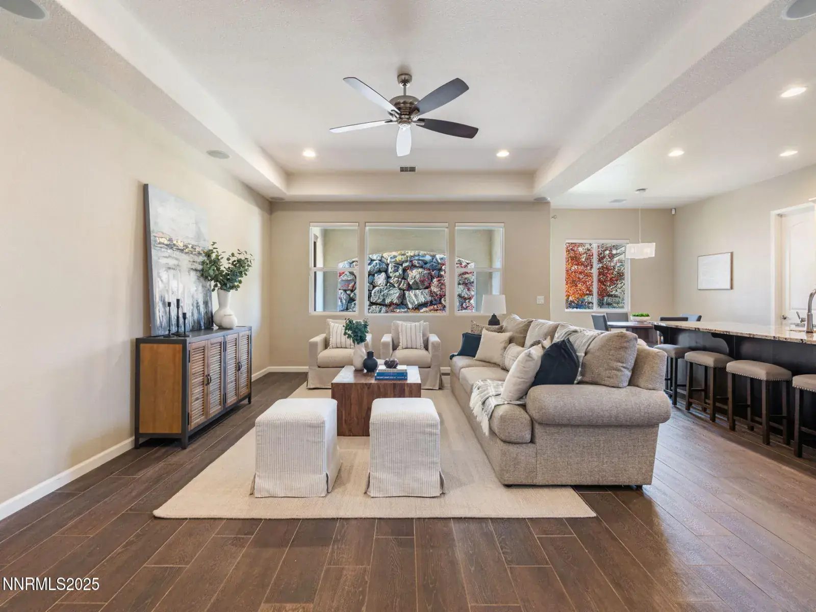 PRESENTING A UNIQUELY LOCATED SOMERSETT LUXURY RESIDENCE! If your dream lifestyle includes a resort-style living, golfing, sunset strolls, a vibrant clubhouse community, and a home that offers unique privacy, this beautifully upgraded residence is the one. This stunning custom home with 4 bedrooms and 3.5. baths, is located within gated, private streets in the prestigious masted-planned golf Community of Somersett. Perfectly positioned along the beautiful Somersett Golf Course, this home offers a rare privacy with no neighbors on the right side and breathtaking views of the golf course and the mountains. The ideal location close enough to enjoy the views, yet far enough to avoid the hazards – the currents owners have never experienced stray golf balls or noise from the golf course reach the home. From the moment you step inside you’ll notice high-end finishes and quality craftsmanship throughout. This home features impressive 10-foot tray ceilings that adds dimension and elegance to the rooms. The chef’s kitchen showcases premium appliances, custom cabinetry, custom eased-edge granite countertops, opening to a spacious living room and large picture windows that frame the scenic landscape in the formal dining room. Elegant ceramic flooring, designer lighting, and upgraded fixtures elevate every detail of the interior. The primary suite is a private retreat with a luxurious spa-inspired bathroom, custom quartz vanity, walk-in shower, extra-large soaking tub, and a spacious walk-in closet. Secondary bedrooms are generously sized, offering comfort and versatility for family, guests, or office use. One of the bedrooms has extra-large door frames for easy wheelchair access. Step outside to a beautifully landscaped backyard designed for relaxation and entertaining. Enjoy sweeping views of the golf course and surrounding mountains from the covered patio, ideal for barbecues or evening gatherings with friends and family. A tranquil water feature adds a touch of serenity, while the thoughtfully planned landscaping enhances the natural beauty of the setting. Residents enjoy access to the Somersett Clubhouse, featuring a resort-style pool, hot-tubs, fitness center, tennis/pickleball courts, and miles of walking trails, all within one of Reno’s most desirable master-planned communities. This home is the perfect combination of luxury, privacy, and golf course living — just minutes from dining, shopping, and downtown Reno.
