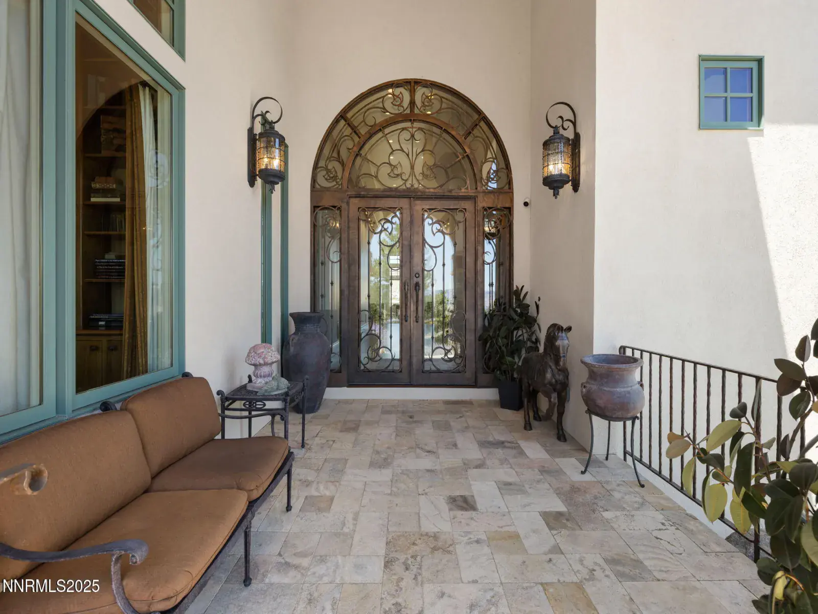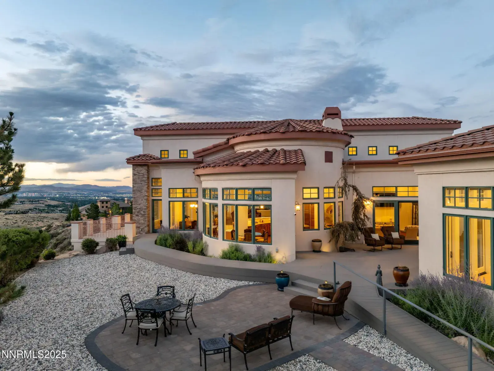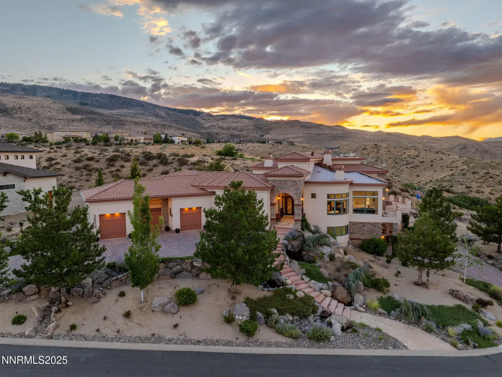 Architectural ArrowCreek Masterpiece. This move-in-ready Modern Revival Mediterranean estate, designed by renowned architect Steve Miles, is nestled on 0.73 private acres in one of the most serene, private settings within the prestigious, guard-gated ArrowCreek community. Offering 6 bedrooms, 5 baths, and 7,525 square feet of luxury living, this custom home is a rare find. From the moment you arrive, the dramatic entrance captivates with bubbling fountains emerging from massive boulders, a stone pathway leading to stately custom iron doors, and breathtaking panoramic views that unfold from every angle. Step into a gallery-style grand hallway that opens to a seamless, open-concept floor plan designed for both entertaining and everyday living. Soaring ceilings and expansive, seamless butt glass and Loewen windows capture sweeping vistas of the mountains, canyons, golf course, and the twinkling lights of Reno. Captivating nature-oriented views are further enhanced by a seasonal creek in the canyon, adding a serene element to this exceptional estate. Designed with steel beam construction, curved walls, and 5 fireplaces, this home showcases superior features and timeless design. The chef’s kitchen is a showstopper, with a massive center island, Viking range, granite counters, a back-kitchen, and new KitchenAid oven, fryer, and microwave—all overlooking stunning natural surroundings. The main-level primary suite is a sanctuary of luxury, featuring a private balcony, dual-sided fireplace, spa-inspired bath with steam shower, and a generous walk-in closet. Additional main-level highlights include: An elegant library retreat with custom walnut cabinetry, coffered ceilings, and crown molding, light-filled media room/optional bedroom with deck access, guest suite with separate entrance and café-style granite counter. Descend a sweeping stairwell with hand-forged railings to a gallery/den, complete with a fireplace, custom wet bar with undercounter refrigerator/ice maker, dishwasher, magnificent wine cellar with redwood racks and custom arched iron door entrance. Lower level also features a guest ensuite suite with a fireplaces, walk-in closets and a guest ensuite private access to the gardens and patios. Upper and lower level garages with paver entrances, wood carriage doors open to high-bay ceilings, high-bay lighting with motion sensors and new interlocking modular floor tiles. Upper-level heated 3-car garage with electric vehicle charging, storage areas, a tub wash station with travertine surround and travertine landing/entrance to interior. Lower-level new RV garage access with ample storage, utility sink, tool area, and workspaces. New TimberTech decks, steps and pathways enter the large courtyard area adjacent to the kitchen and multiple living spaces featuring a decorative outdoor fireplace. Step onto a paver-patio seating area surrounded by new xeriscape landscaping for minimal maintenance and canyon/golf course views. Deck pathway wraps the home to the large wrap-around decks and large balcony for panoramic views and entertaining. Loewen windows with glazed dual pane new glass replacement throughout. Recent Upgrades (2023-2025) include New roof, freshly painted interior and exterior, 3 new A/Cs, new carpet installed, New lower floor tile, new LED lights throughout, new security system upstairs, W/D (2023) downstairs W/D (2025) and extensive upgrades from 2023 to 2025. ArrowCreek residents enjoy access to the ArrowCreek Residents’ Center, featuring resort-style amenities and miles of scenic paved trails. The private Club at ArrowCreek offers dual championship golf courses and world-class facilities (membership required). Meticulously updated with striking features and high-end finishes, this exceptional turnkey home is poised to elevate your lifestyle. Buyers and Buyer’s Agents to Verify Independently, Confirm, Satisfy-Lot Lines, Square Footage, Easements, Preliminary Reports, Disclosures, All Details and Information.