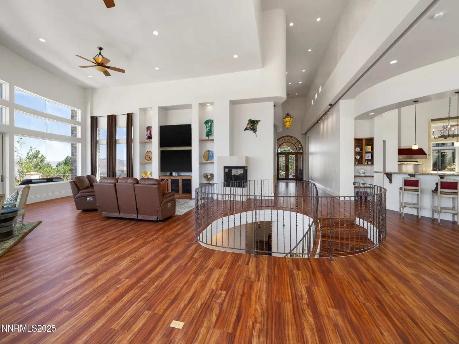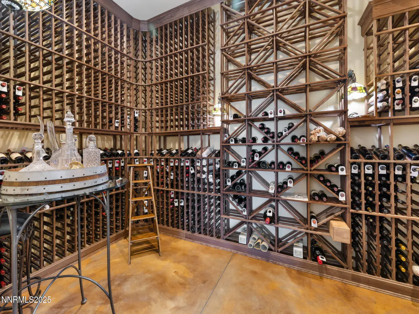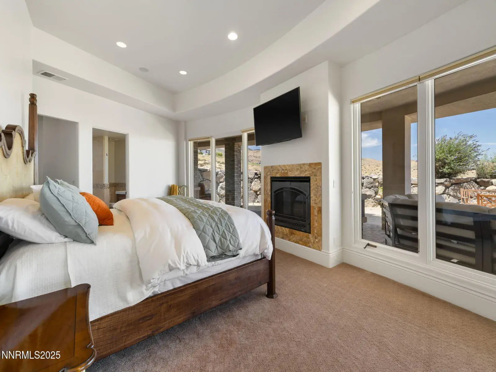 Architectural ArrowCreek Masterpiece. This move-in-ready Modern Revival Mediterranean estate, designed by renowned architect Steve Miles, is nestled on 0.73 private acres in one of the most serene, private settings within the prestigious, guard-gated ArrowCreek community. Offering 6 bedrooms, 5 baths, and 7,525 square feet of luxury living, this custom home is a rare find. From the moment you arrive, the dramatic entrance captivates with bubbling fountains emerging from massive boulders, a stone pathway leading to stately custom iron doors, and breathtaking panoramic views that unfold from every angle. Step into a gallery-style grand hallway that opens to a seamless, open-concept floor plan designed for both entertaining and everyday living. Soaring ceilings and expansive, seamless butt glass and Loewen windows capture sweeping vistas of the mountains, canyons, golf course, and the twinkling lights of Reno. Captivating nature-oriented views are further enhanced by a seasonal creek in the canyon, adding a serene element to this exceptional estate. Designed with steel beam construction, curved walls, and 5 fireplaces, this home showcases superior features and timeless design. The chef’s kitchen is a showstopper, with a massive center island, Viking range, granite counters, a back-kitchen, and new KitchenAid oven, fryer, and microwave—all overlooking stunning natural surroundings. The main-level primary suite is a sanctuary of luxury, featuring a private balcony, dual-sided fireplace, spa-inspired bath with steam shower, and a generous walk-in closet. Additional main-level highlights include: An elegant library retreat with custom walnut cabinetry, coffered ceilings, and crown molding, light-filled media room/optional bedroom with deck access, guest suite with separate entrance and café-style granite counter. Descend a sweeping stairwell with hand-forged railings to a gallery/den, complete with a fireplace, custom wet bar with undercounter refrigerator/ice maker, dishwasher, magnificent wine cellar with redwood racks and custom arched iron door entrance. Lower level also features a guest ensuite suite with a fireplaces, walk-in closets and a guest ensuite private access to the gardens and patios. Upper and lower level garages with paver entrances, wood carriage doors open to high-bay ceilings, high-bay lighting with motion sensors and new interlocking modular floor tiles. Upper-level heated 3-car garage with electric vehicle charging, storage areas, a tub wash station with travertine surround and travertine landing/entrance to interior. Lower-level new RV garage access with ample storage, utility sink, tool area, and workspaces. New TimberTech decks, steps and pathways enter the large courtyard area adjacent to the kitchen and multiple living spaces featuring a decorative outdoor fireplace. Step onto a paver-patio seating area surrounded by new xeriscape landscaping for minimal maintenance and canyon/golf course views. Deck pathway wraps the home to the large wrap-around decks and large balcony for panoramic views and entertaining. Loewen windows with glazed dual pane new glass replacement throughout. Recent Upgrades (2023-2025) include New roof, freshly painted interior and exterior, 3 new A/Cs, new carpet installed, New lower floor tile, new LED lights throughout, new security system upstairs, W/D (2023) downstairs W/D (2025) and extensive upgrades from 2023 to 2025. ArrowCreek residents enjoy access to the ArrowCreek Residents’ Center, featuring resort-style amenities and miles of scenic paved trails. The private Club at ArrowCreek offers dual championship golf courses and world-class facilities (membership required). Meticulously updated with striking features and high-end finishes, this exceptional turnkey home is poised to elevate your lifestyle. Buyers and Buyer’s Agents to Verify Independently, Confirm, Satisfy-Lot Lines, Square Footage, Easements, Preliminary Reports, Disclosures, All Details and Information.