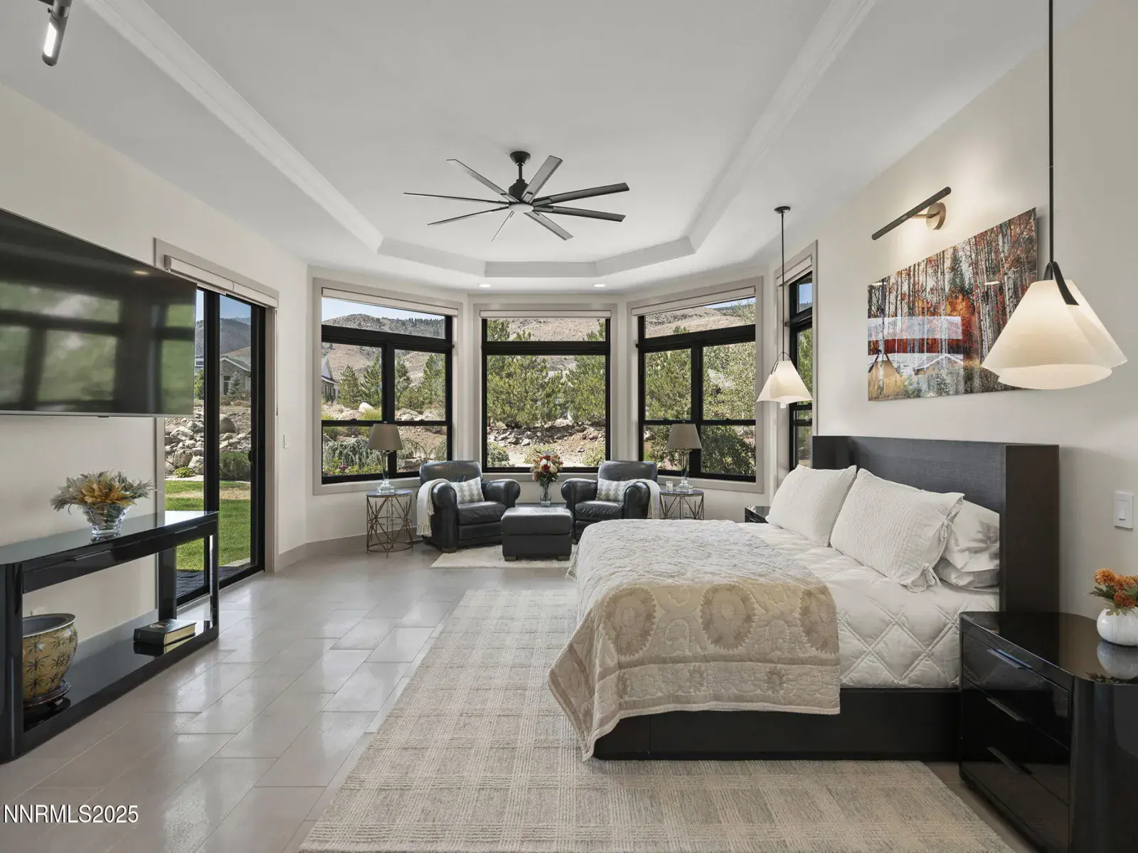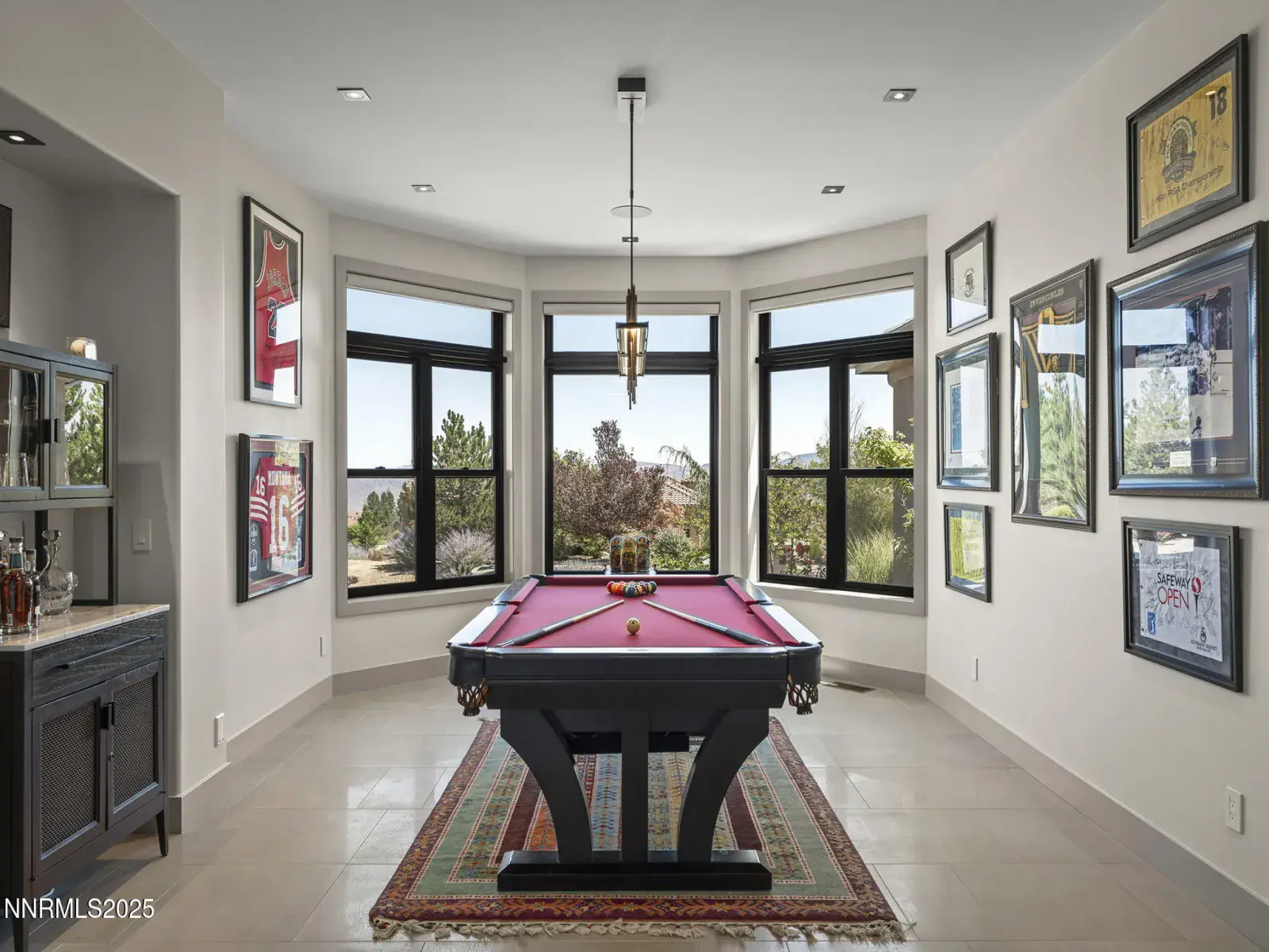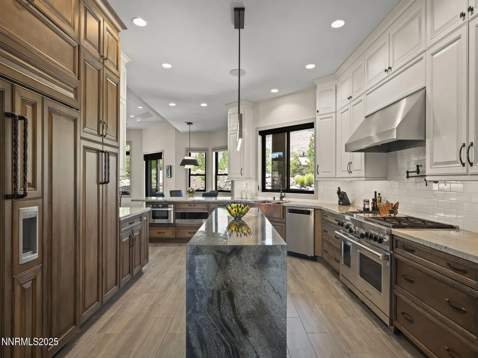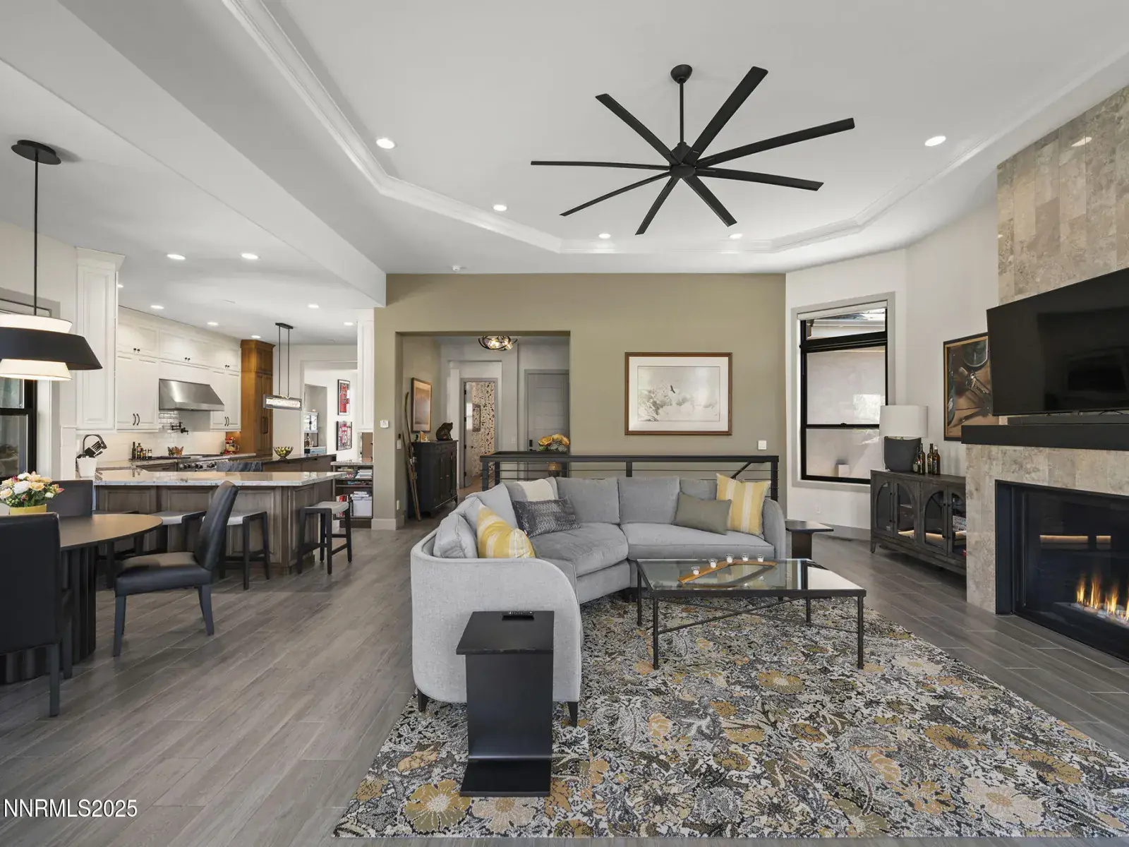 Step into 6177 North Featherstone, a residence reimagined from the ground up to embody the sophistication of design & the effortless grace of High Desert living. Nestled within the prestigious ArrowCreek community, this fully remodeled estate offers 5,586 square feet of inspired living on a full acre. With sweeping views across the Sierra Nevada & Mt. Rose mountains, lush golf fairways, & sparkling city lights, every angle of this home tells a story of elegance & connection to its surroundings. The owners began their remodel with purpose: to create a seamless flow, where form meets function & every detail enhances life, leisure, & entertaining. Walls were softened, pillars removed, & spaces reimagined to capture natural light & open sightlines. Modern finishes & thoughtful design balance grandeur with comfort. A finished basement & upstairs library added 312 square feet, expanding versatility without sacrificing intimacy. Arrival makes an unforgettable impression with a custom 9×6 steel pivot door by Modern Steel Doors of Arizona. Inside, a light-filled foyer leads to an expanded balcony, where sweeping golf course & city views set the stage for sunrise coffee or starlit evenings. At the heart of the home, the Dining Room has been elevated into a dramatic entertaining space with soaring two-story ceilings & a two-sided fireplace connecting indoors & outdoors. Andersen sliding doors open to patios & gardens, while striking Sonneman fixtures & art lighting create ambiance. Whether hosting holidays or intimate dinners, the space adapts with ease. The Main En Suite is a private retreat, complete with custom California Closets, cove lighting, & remote-controlled Hunter Douglas shades. The spa-inspired bath showcases a freestanding soaking tub beneath chandeliers, a dual-entry steam shower with rain head & sprayers, natural stone floors, shimmering glass tile, & custom cabinetry with quartz counters & lighted mirrors. The Great Room centers on a custom travertine fireplace with black quartz mantel, complemented by wood-grain tile floors, a Minka Aire fan, & integrated Sonos audio. The Kitchen & Nook feature a Wolf 48″ range, Sub-Zero refrigerator, & a central island with seating. The Games Room delights with Hubbardton Forge lighting, speakers, & motorized shades. A dramatic staircase of black-stained oak & iron railings rises beneath a cascading Sonneman chandelier. Upstairs, the new Library offers custom bookcases, club seating, & a 12-foot Andersen glass wall opening to a balcony with panoramic views. Four additional en suite bedrooms provide privacy, storage, & character. Outdoors, multiple patios, a two-sided fireplace, & landscaped grounds enhanced with solar lighting create serene gathering spaces. Modern systems include central HVAC with three units, radiant heated floors, Tesla solar panels, Cat-6 wiring, Sonos audio, & a four-car garage with EV charger. This estate is more than a home—it is a lifestyle. From morning coffee on the balcony to wine in the library at dusk, from quiet family nights to grand celebrations, this residence harmonizes elegance, comfort, & versatility. Every space has been thoughtfully crafted, every view a reminder of Reno’s beauty. This is a rare opportunity to own a fully realized vision of home, where luxury & ease coexist seamlessly.