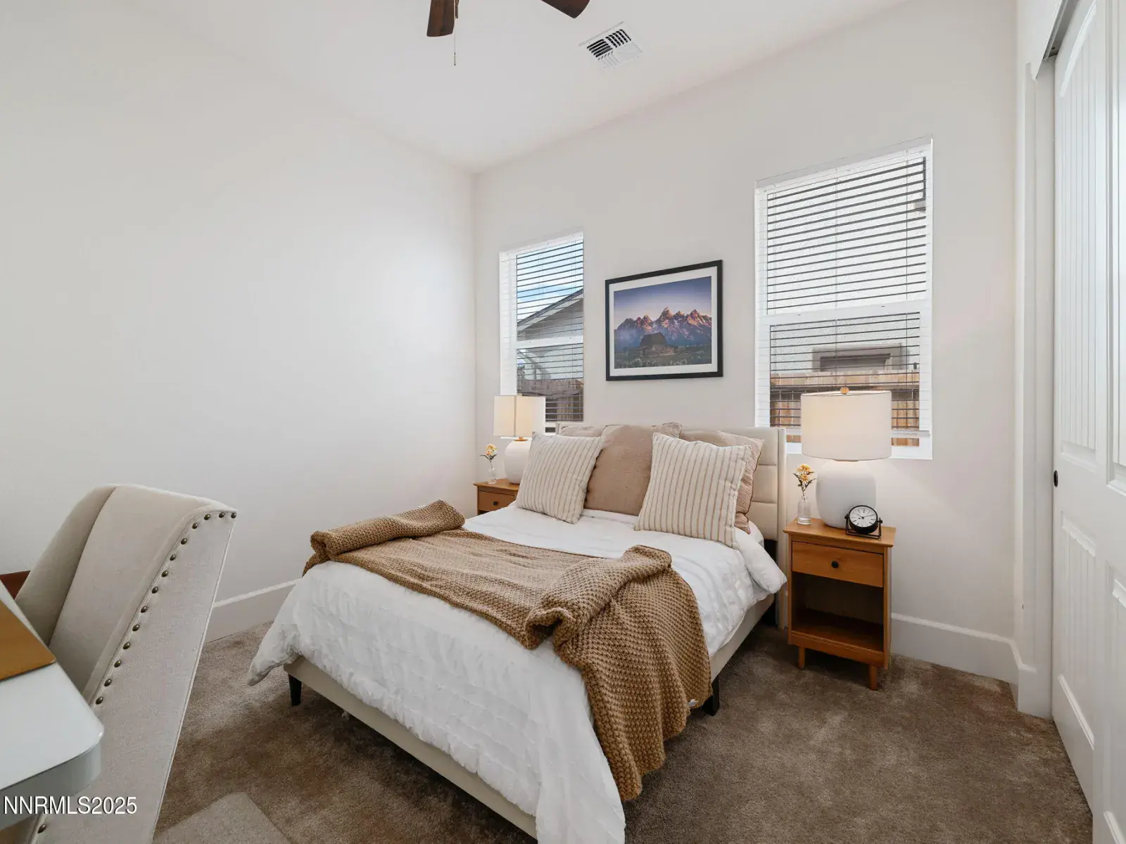 Set within the highly regarded gated enclave of Copper View at Carmella Ranch, this beautifully designed single-level residence offers an elegant balance of refined entertaining spaces and serene everyday living. Featuring 3 bedrooms, 2.5 bathrooms and a 3-car garage, this home is further distinguished by one of the larger lot sizes within the community, providing a rare sense of openness. The open-concept layout is thoughtfully curated with high ceilings and multiple oversized glass slider doors that frame tranquil backyard views while inviting abundant natural light throughout the home. At the heart of the residence, the kitchen pairs crisp white cabinetry with stainless steel appliances, seamlessly anchoring the living and dining spaces for effortless gathering and connection. The primary suite is positioned to capture open and mountain views and the spa-inspired primary bath features a generous walk-in shower with a rain shower head, while a custom built-in closet system completes that suite with both style and function. Wood-look tile flooring and Craftsman style doors add warmth and continuity, complemented by a soft, neutral palette that enhances the homes timeless and inviting aesthetic. Both the front and backyard are tastefully xeriscaped, offering appeal with minimal upkeep. Ideally located within walking distance to the community pool and clubhouse and surrounded by mountain scenery, this residence captures the essence of relaxed luxury living in one of South Reno’s most sought-after gated communities.