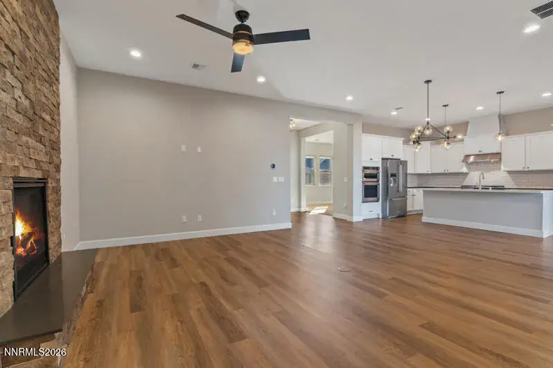 This beautifully built home in the Caramella Ranch 55+ community offers 2,262 square feet of living space, featuring 2 bedrooms, 2.5 bathrooms, and a thoughtful open floor plan with high-end finishes. Notable interior highlights include a floor-to-ceiling rock wall fireplace, luxury vinyl plank flooring, and neutral colors throughout. The well-designed kitchen is equipped with a large center island, quartz counter tops, stainless steel appliances, farmhouse sink, breakfast bar, premium cabinetry, and a roomy walk-in pantry. The spacious primary bedroom suite serves as a relaxing retreat, complete with a generous walk-in closet and a deluxe primary bath featuring a dual-sink vanity, large walk-in shower, and private water closet. Additional interior features include a secluded secondary bedroom with a sizable closet, a large den/office off the front entrance. To the rear of the home is a spacious bonus room that can act as a family or game room with a sizable linen closet, and a half bath. The residence also includes a large laundry room with cabinetry and a sink, as well as a convenient drop zone. The sellers have added several upgrades including new window coverings, ceiling fans, and updated fixtures. The backyard has a large covered paver patio for relaxing and enjoying the water feature while taking in the views of Mt. Rose. The finished, painted garage includes baseboards, a storage area, and a tankless water heater. Create your own group or join an organized group of residents in hiking, biking, walking, reading, coffee, wine, painting, travel, or golf. Living in Caramella Ranch offers a vibrant lifestyle with access to premium community amenities such as swimming pools, fitness facilities, pickleball courts, and the clubhouse that is just a short walk away. The perfect location for easy access to local shopping, restaurants, skiing, and the greater Reno area.