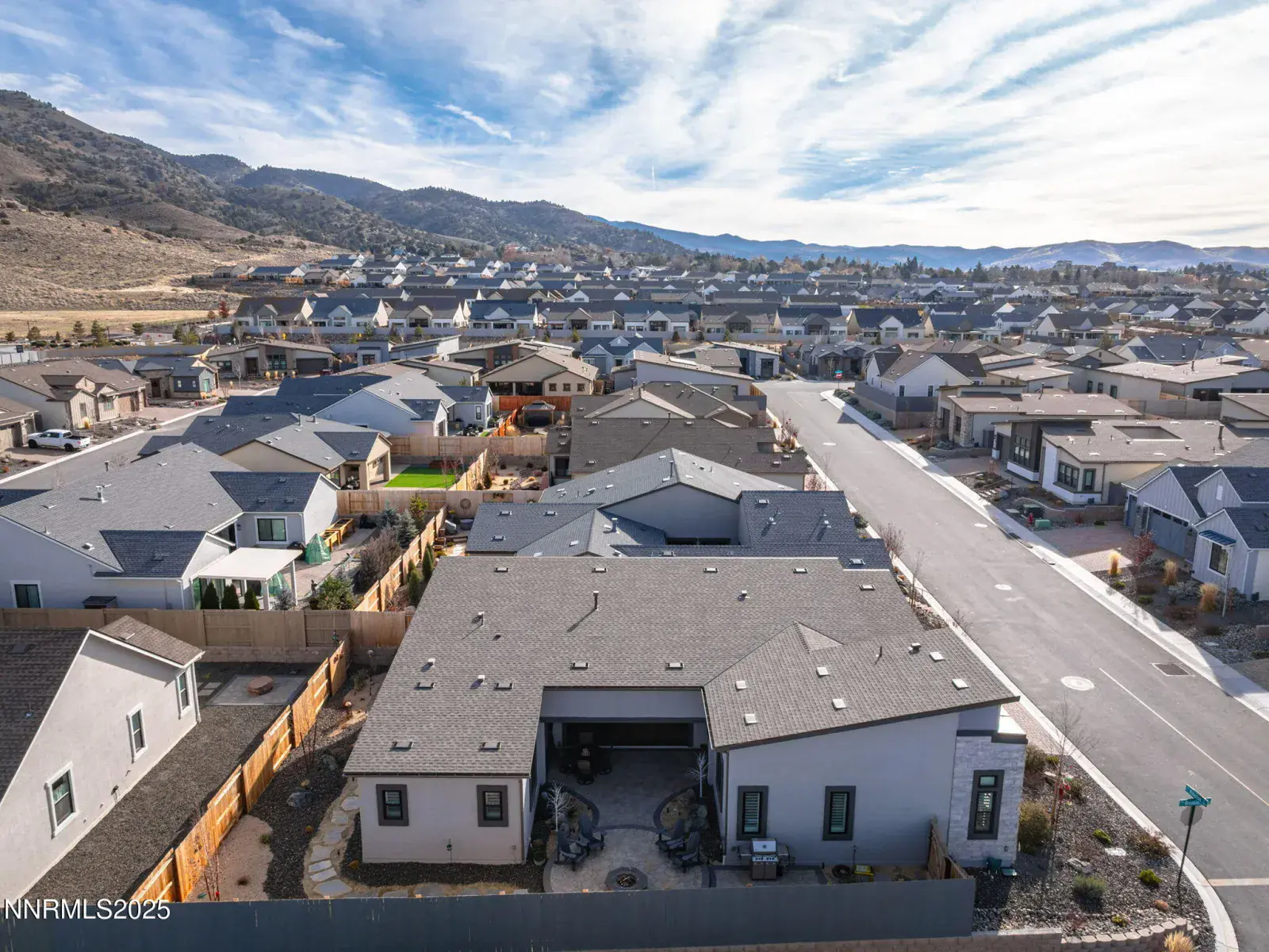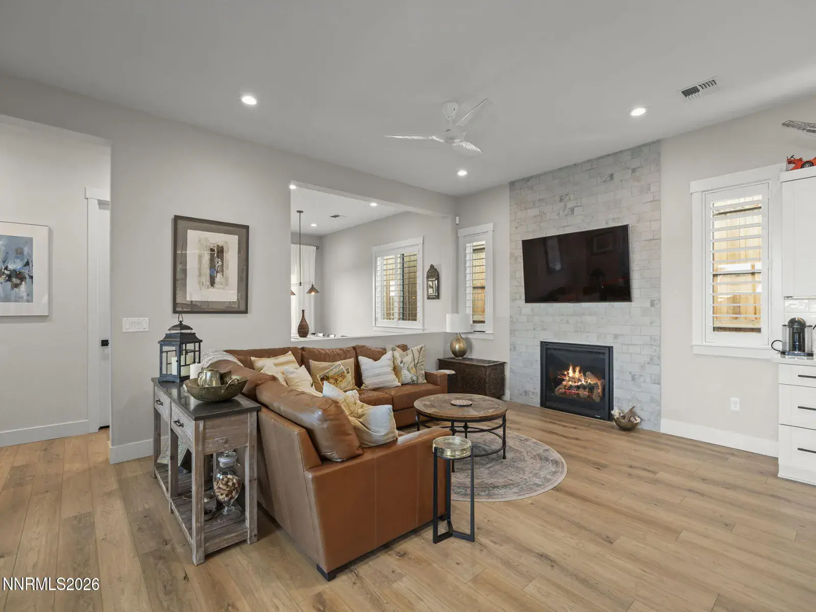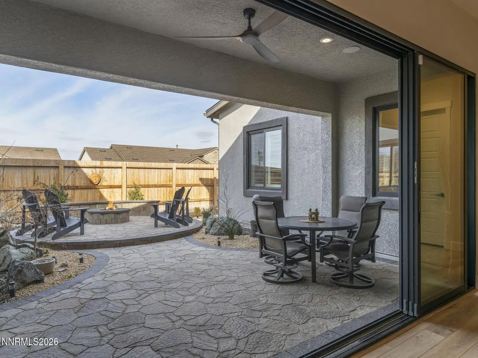 Welcome to this stunning 2-bedroom, 2-bath, 1,978 sq ft home built in 2023, perfectly positioned on a desirable corner lot in the sought-after Regency at Caramella Ranch. With approximately 255,000 dollars in thoughtfully curated upgrades, this home offers modern luxury, comfort, and effortless indoor-outdoor living. Inside, you’ll find an open and flexible floor plan filled with natural light, highlighted by luxury laminate flooring, solid wood interior doors, large ceiling fans throughout, and plantation shutters. The great room features a gas fireplace with blower for maximum heat, accented by a stunning tiled fireplace mantel wall, creating a warm and elegant focal point. Recessed lighting and upgraded fixtures elevate every space. The gourmet kitchen is a true showstopper, featuring top-of-the-line JennAir appliances, upgraded cabinetry and hardware, cabinet lighting, soft-close cabinets and drawers, slide-out shelving, and premium countertops—designed for both beauty and functionality. One of the home’s most impressive features is the 16-foot wall of folding glass doors, seamlessly connecting the interior to the outdoors. Complete with a disappearing screen, this space is perfect for enjoying warm summer evenings without worrying about bugs. The dining room offers added convenience with battery-operated Roman shades. Current den is a perfect flex-space which could also be used as a dining room (which is layout in the model). Step outside to a fully landscaped backyard oasis, designed for low maintenance and high enjoyment. Features include xeriscape landscaping, a beautiful paver pathway, multiple patio spaces, a raised patio with gas fire pit, landscape lighting in both the front and backyard, an automatic drip irrigation system, a gas-plumbed BBQ hookup, and a patio wired for stereo sound—perfect for entertaining. The primary bathroom showcases luxury finishes, including top-of-the-line Roburn medicine cabinets, while thoughtful details like soft-close toilet seats reflect the attention to quality throughout the home. Residents of Regency at Caramella Ranch, an exceptional 55+ community, enjoy resort-style amenities including a grand clubhouse, indoor and outdoor pools, a state-of-the-art fitness center, pickleball and bocce ball courts, and a full calendar of activities. Fitness and lifestyle classes range from yoga, Pilates, Tai Chi, and water aerobics to creative pursuits like painting. An on-site event planner coordinates community gatherings, including a popular summer concert series and countless social events. This home offers a rare opportunity to enjoy luxury, lifestyle, and low-maintenance living in one of South Reno’s most desirable communities. The sellers will be taking the following with them: water features in the courtyard, TV mounts, the pendant lights over the kitchen island, the garage cabinet above the work bench, and the BBQ in the backyard. The ceiling above the kitchen island will be capped at both spots where the pendants were. Future owners can then choose their style of lighting once they own it.
