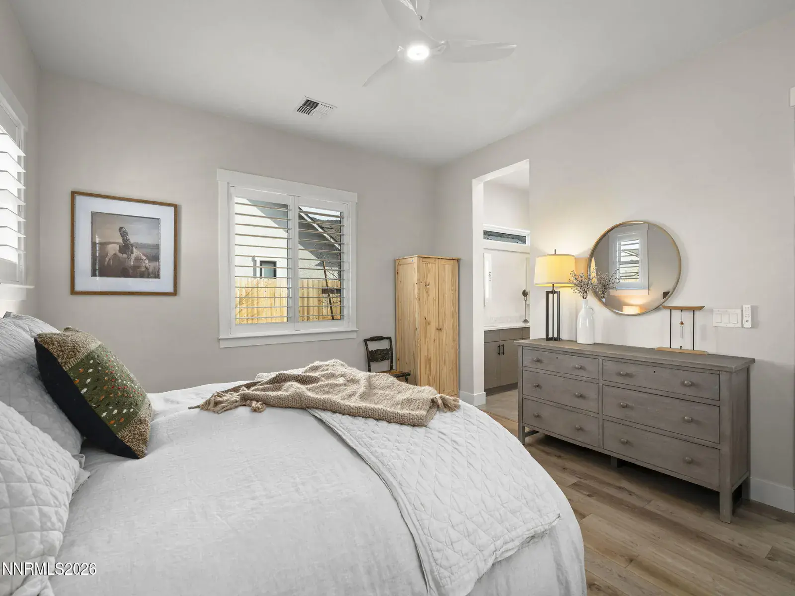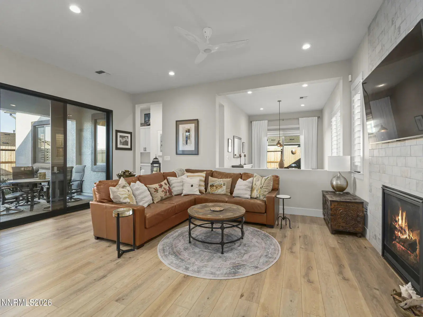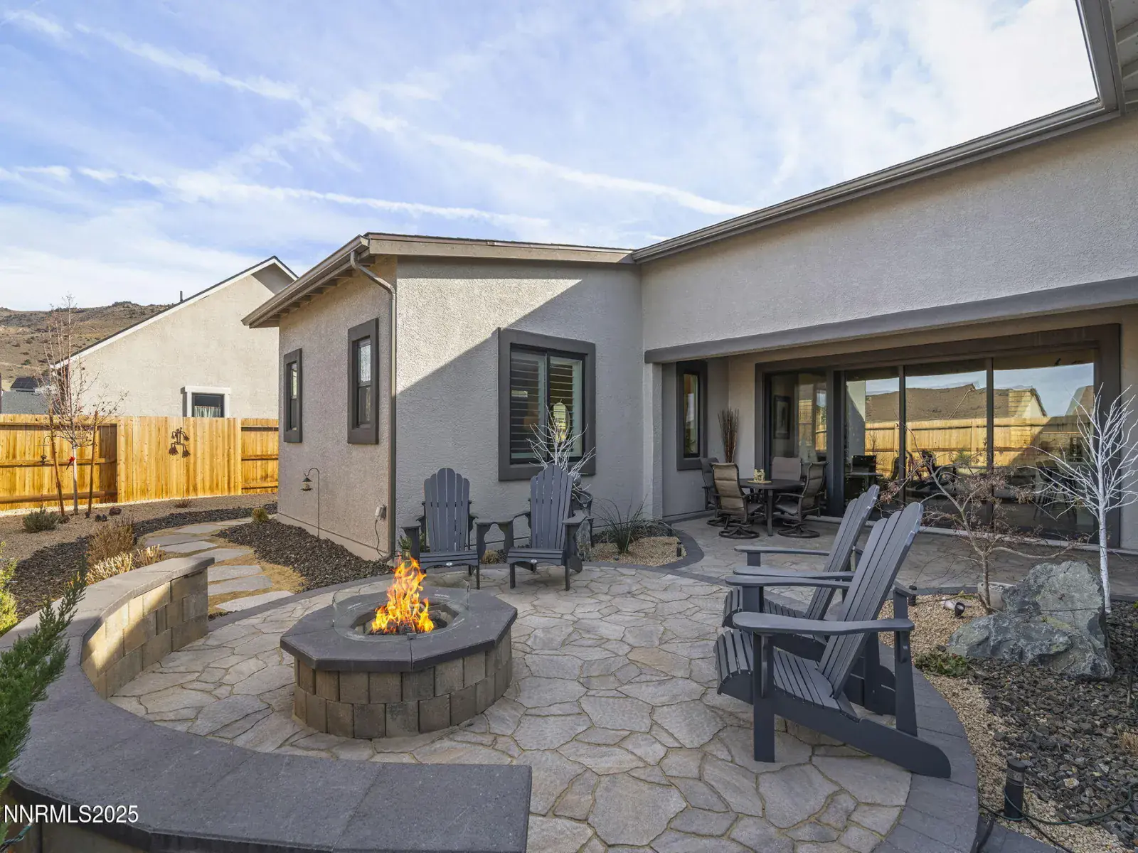 Welcome to this stunning 2-bedroom, 2-bath, 1,978 sq ft home built in 2023, perfectly positioned on a desirable corner lot in the sought-after Regency at Caramella Ranch. With approximately 255,000 dollars in thoughtfully curated upgrades, this home offers modern luxury, comfort, and effortless indoor-outdoor living. Inside, you’ll find an open and flexible floor plan filled with natural light, highlighted by luxury laminate flooring, solid wood interior doors, large ceiling fans throughout, and plantation shutters. The great room features a gas fireplace with blower for maximum heat, accented by a stunning tiled fireplace mantel wall, creating a warm and elegant focal point. Recessed lighting and upgraded fixtures elevate every space. The gourmet kitchen is a true showstopper, featuring top-of-the-line JennAir appliances, upgraded cabinetry and hardware, cabinet lighting, soft-close cabinets and drawers, slide-out shelving, and premium countertops—designed for both beauty and functionality. One of the home’s most impressive features is the 16-foot wall of folding glass doors, seamlessly connecting the interior to the outdoors. Complete with a disappearing screen, this space is perfect for enjoying warm summer evenings without worrying about bugs. The dining room offers added convenience with battery-operated Roman shades. Current den is a perfect flex-space which could also be used as a dining room (which is layout in the model). Step outside to a fully landscaped backyard oasis, designed for low maintenance and high enjoyment. Features include xeriscape landscaping, a beautiful paver pathway, multiple patio spaces, a raised patio with gas fire pit, landscape lighting in both the front and backyard, an automatic drip irrigation system, a gas-plumbed BBQ hookup, and a patio wired for stereo sound—perfect for entertaining. The primary bathroom showcases luxury finishes, including top-of-the-line Roburn medicine cabinets, while thoughtful details like soft-close toilet seats reflect the attention to quality throughout the home. Residents of Regency at Caramella Ranch, an exceptional 55+ community, enjoy resort-style amenities including a grand clubhouse, indoor and outdoor pools, a state-of-the-art fitness center, pickleball and bocce ball courts, and a full calendar of activities. Fitness and lifestyle classes range from yoga, Pilates, Tai Chi, and water aerobics to creative pursuits like painting. An on-site event planner coordinates community gatherings, including a popular summer concert series and countless social events. This home offers a rare opportunity to enjoy luxury, lifestyle, and low-maintenance living in one of South Reno’s most desirable communities. The sellers will be taking the following with them: water features in the courtyard, TV mounts, the pendant lights over the kitchen island, the garage cabinet above the work bench, and the BBQ in the backyard. The ceiling above the kitchen island will be capped at both spots where the pendants were. Future owners can then choose their style of lighting once they own it.