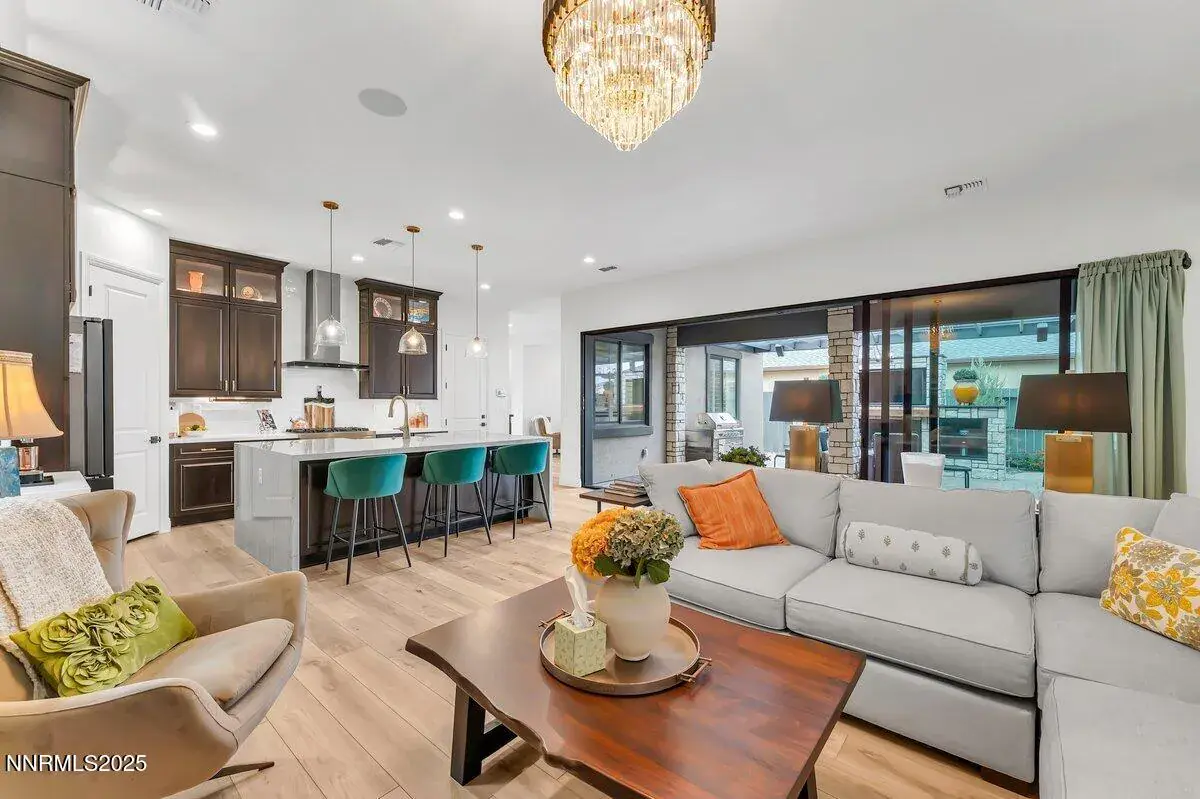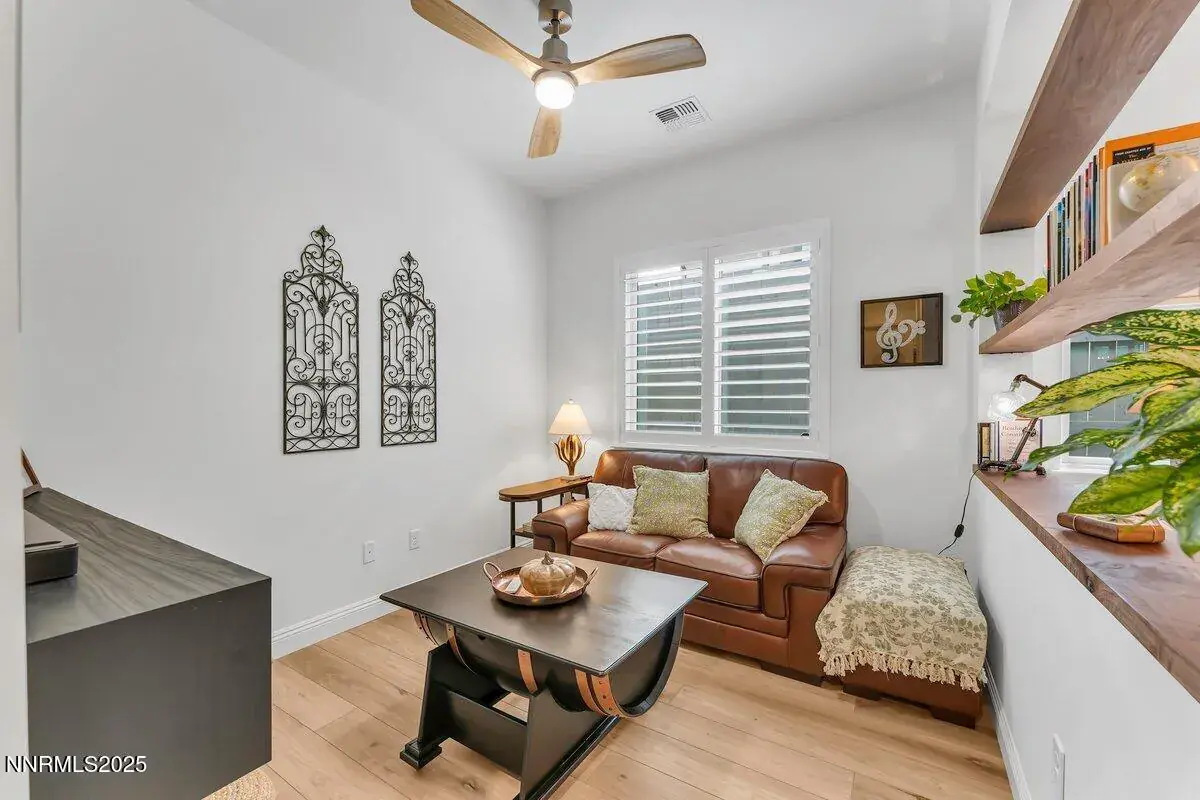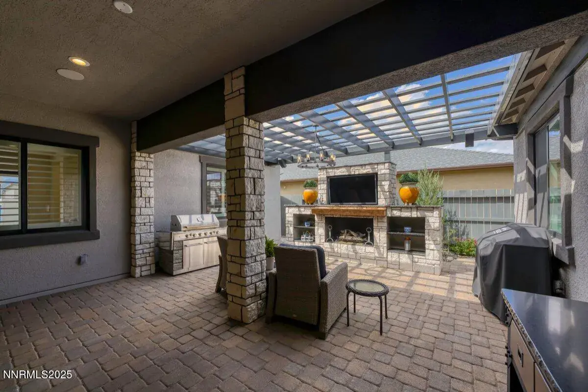 **See the Virtual Tour for a complete video walkthrough.** Welcome to your dream home in Regency at Caramella Ranch, Reno’s premier 55+ gated community! This stunning Quincy model two-bedroom, two-bath residence with a versatile office/flex room offers luxury living featuring nearly 150,000 dollars in upgrades (please see documents tab for list of upgrades). Securely situated behind guarded gates, the neighborhood provides peace of mind and access to resort-style amenities including pools, fitness classes, clubs, live entertainment, and more. Step inside to an open-concept floor plan featuring luxury vinyl plank flooring, soaring ceilings, and custom lighting throughout. The gourmet kitchen is a showstopper with a waterfall Quartzite island, upgraded cabinetry with ceiling-height finishes, JennAir cooktop, built-in microwave and an oven, and a spacious walk-in pantry with slide-out drawers. Entertain with ease as the kitchen flows into the dining room and great room, complete with a stacked stone fireplace in the great room, walnut shelving, a slide glass patio door that opens to your private backyard retreat complete with a surround sound system featuring Sonos Amps and a subwoofer in both the great room and the patio. Outdoor living is unmatched here, enjoy a covered paver patio, pergola, modern gas fireplace, and wall-mounted TV, low maintenance lawn with programable sprinkler system and an outdoor shed set on a durable paver floor. The primary suite boasts a spa-inspired shower with dual sinks and a custom Nevada Closets system, while the secondary bedroom offers comfort and privacy for guests. A flexible room makes the perfect office, library or hobby room. Additional features include plantation shutters, sleek celling fans, laundry room cabinetry, water softener, epoxy-coated garage floor with built-in cabinets, additional interior and exterior WI-FI access points and a home security system. The kitchen refrigerator conveys with the home. Caramella Ranch Regency offers an active lifestyle with social clubs, community events, resort-style clubhouse with indoor & outdoor pools, jacuzzi, fitness center, tennis, pickleball, bocce ball and so much more!