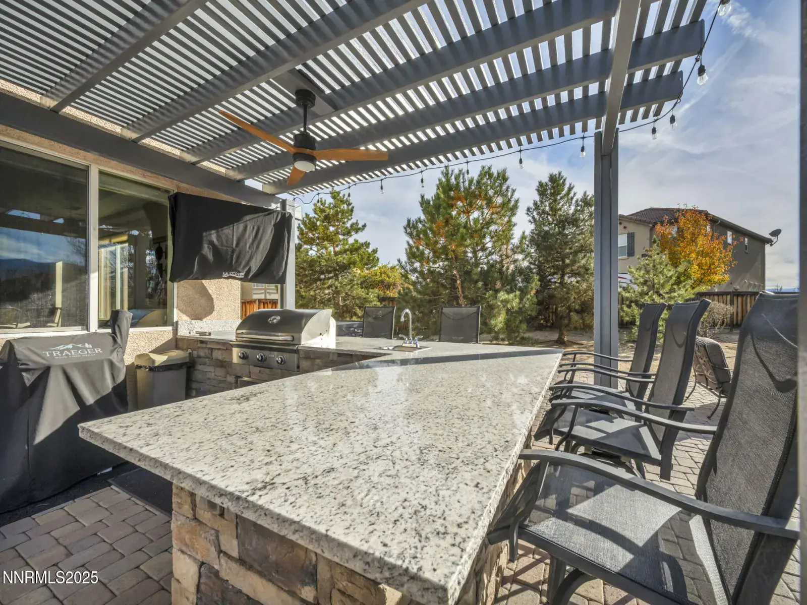 Welcome to this stunning 5-bedroom home nestled at the back of quiet cul-de-sac in one of South Reno’s most beautiful and sought after neighborhoods. From the moment you arrive you’ll be captivated by the impressive driveway and style this property offers. Spacious and thoughtfully designed for everyday living and entertaining. This home truly has everything you’re looking for. Step inside to an inviting foyer that flows seemlessly to the dining and living areas that feature a dual fireplace. The kitchen has been updated to include double ovens installed less than a year ago, an impressive granite island and generous counter and cabinet space. With 5 bedrooms, there’s room for everyone – ideal for large families, guests, or a home office setup. The primary suite offers a private retreat with its own bathroom while two additional full bathrooms provide convenience and comfort. Outside, you’ll enjoy a well-maintained yard, 12,000 sq ft of pavers, 2022 pergola with ceiling fan that provides comfort over the outdoor kitchen, also installed in 2022, complete with side burners, sink, refrigerator, cabinets, shelving and a mounted TV. The backyard also features a fire pit, seating areas and a top-of-the-line 2025 spa/hot tub. Surround sound speakers seemlessly installed throughout the lower level of the home and outdoor living area. This home is being sold by its original owner which was intended as a vacation home, it has only been lived in within the last few years; it is immaculate and considered allergen free; no smoking nor pets in the home. Whether you’re relaxing at home or taking in the surrounding community amenities, this property checks every box. Don’t miss your chance to own a home that has it all, space, location, and every feature you’ve been waiting for.