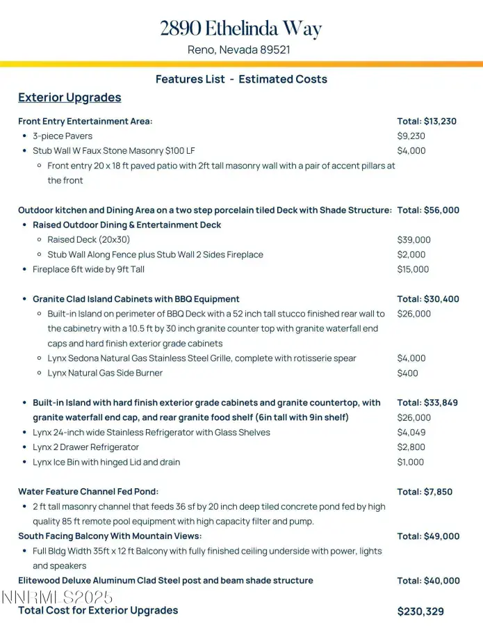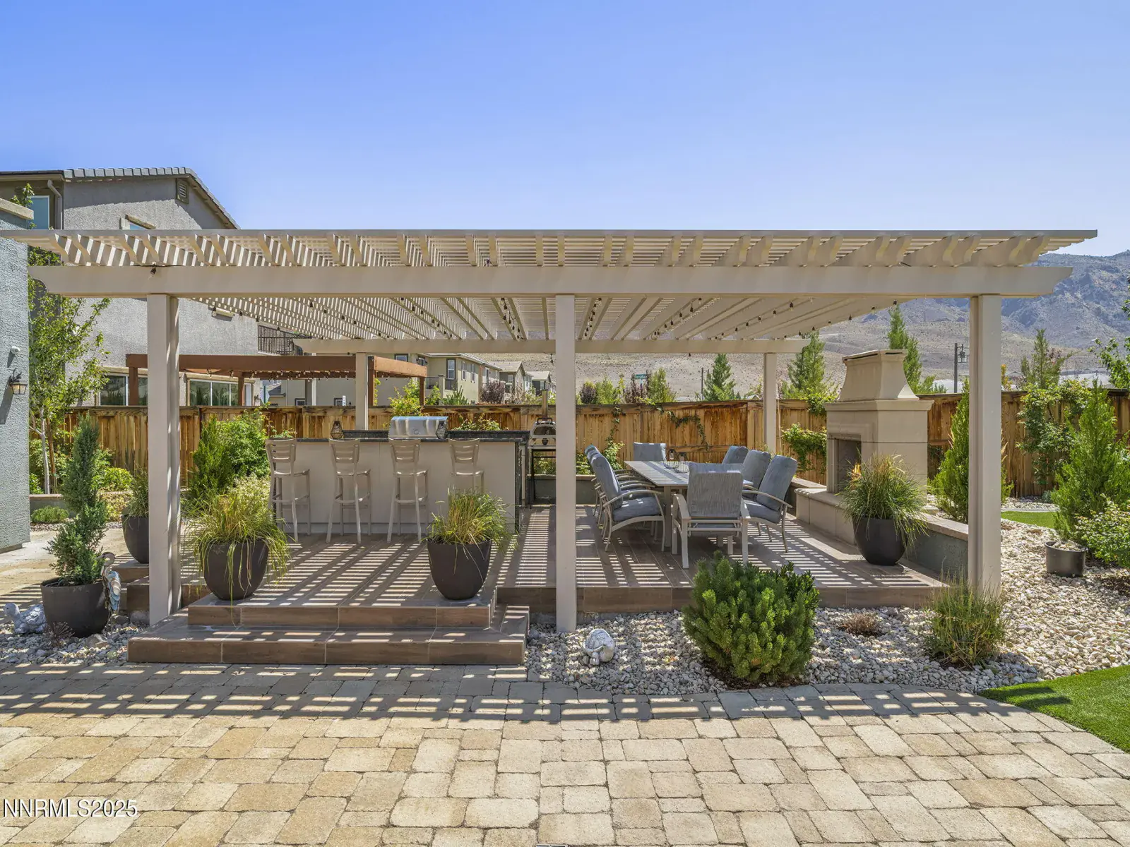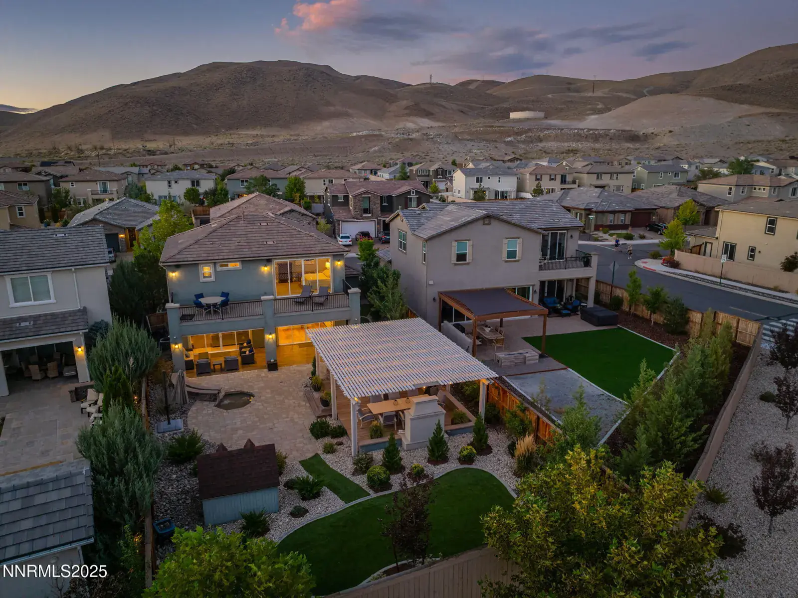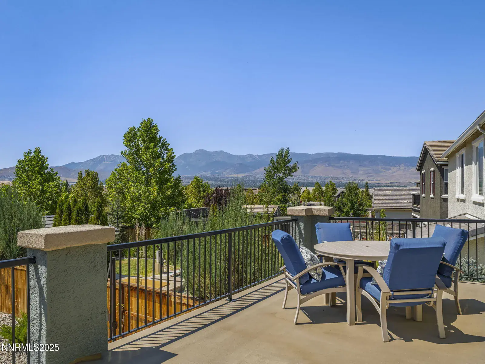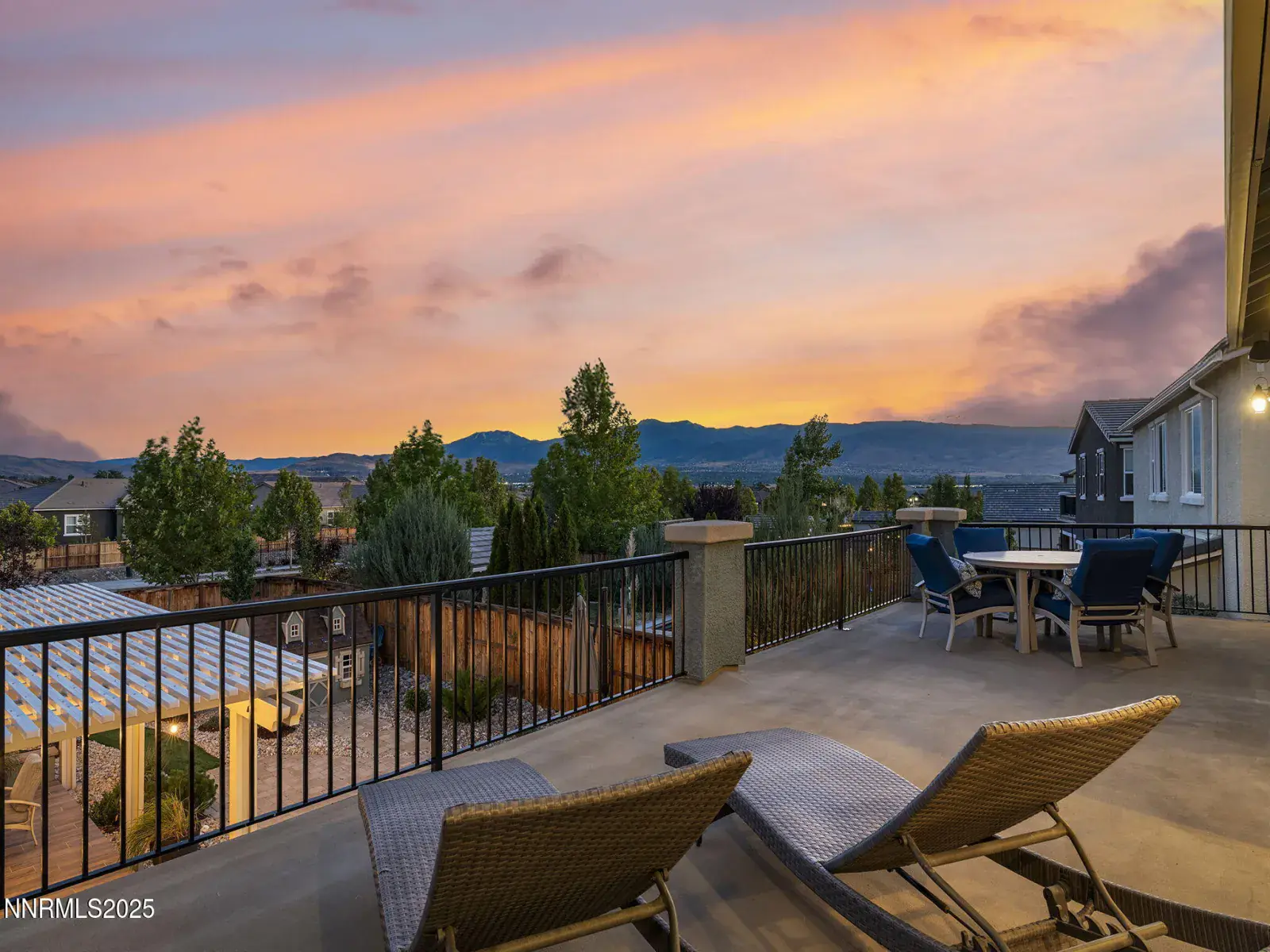 Former model home in Saddle Ridge, fully upgraded with incredible mountain and valley views! The backyard presents an experience unlike any other, enjoy the high quality faux wood aluminum clad steel frame pergola hovering over the 2-step wood print style raised deck. This luxurious setting is highlighted by 2 large granite waterfall islands with a Lynx Sedona stubbed in BBQ and side burner, 5 person bar, 2 Lynx refrigeration systems and ice bin and 9x6ft gas fireplace with raised hearth. Amongst the extensive pavers there is a pond fed by a curved channel with 2ft masonry wall, premium quality turf in the rear and side yard and a covered, wood imprinted tile patio that includes 2 ceiling fans, pull-down shades and is wired with speakers and ready for an outdoor TV. Perched atop the amazing backyard is a 12x35ft full building width balcony off the master bedroom, truly unique to the neighborhood and provides a panoramic view of Mt. Rose, the eastern foothills and Reno’s beautiful valley. The interior of the home is plush with upgrades and enhanced features. The foyer opens to a 14ft tall wood paneling surround, inlaid tile walkway, custom handrails on the staircase and custom long stem drop down pendant lighting. The kitchen has ample builder upgrades with full 18ft wall width granite counter with Kohler farm sink, cabinets above and below, KitchenAid dishwasher, JennAir built-in microwave, counter-to-ceiling subway tile backsplash, extra large granite island (87 x 37″) with breakfast seating for five. Please see the full “Features List” that details all the amazing qualities of this one-of-kind home!