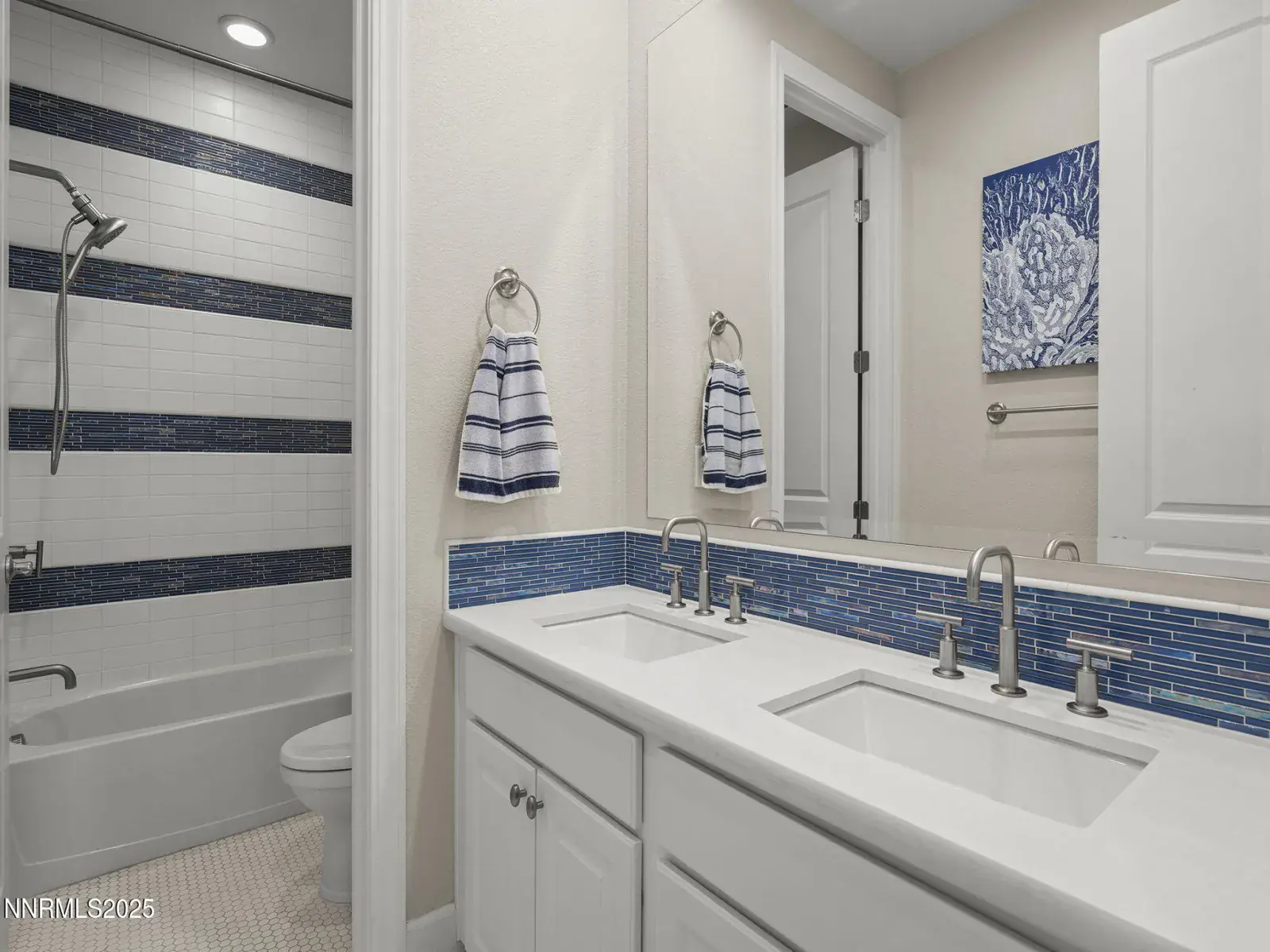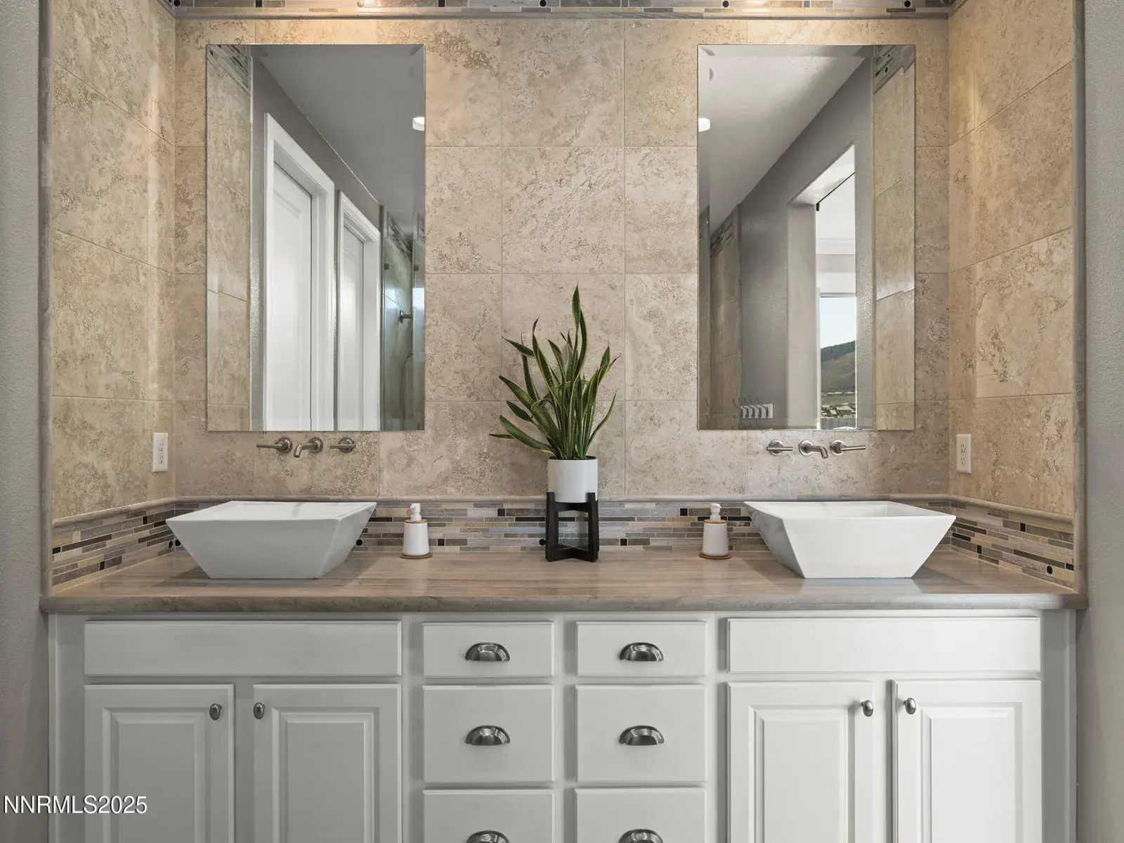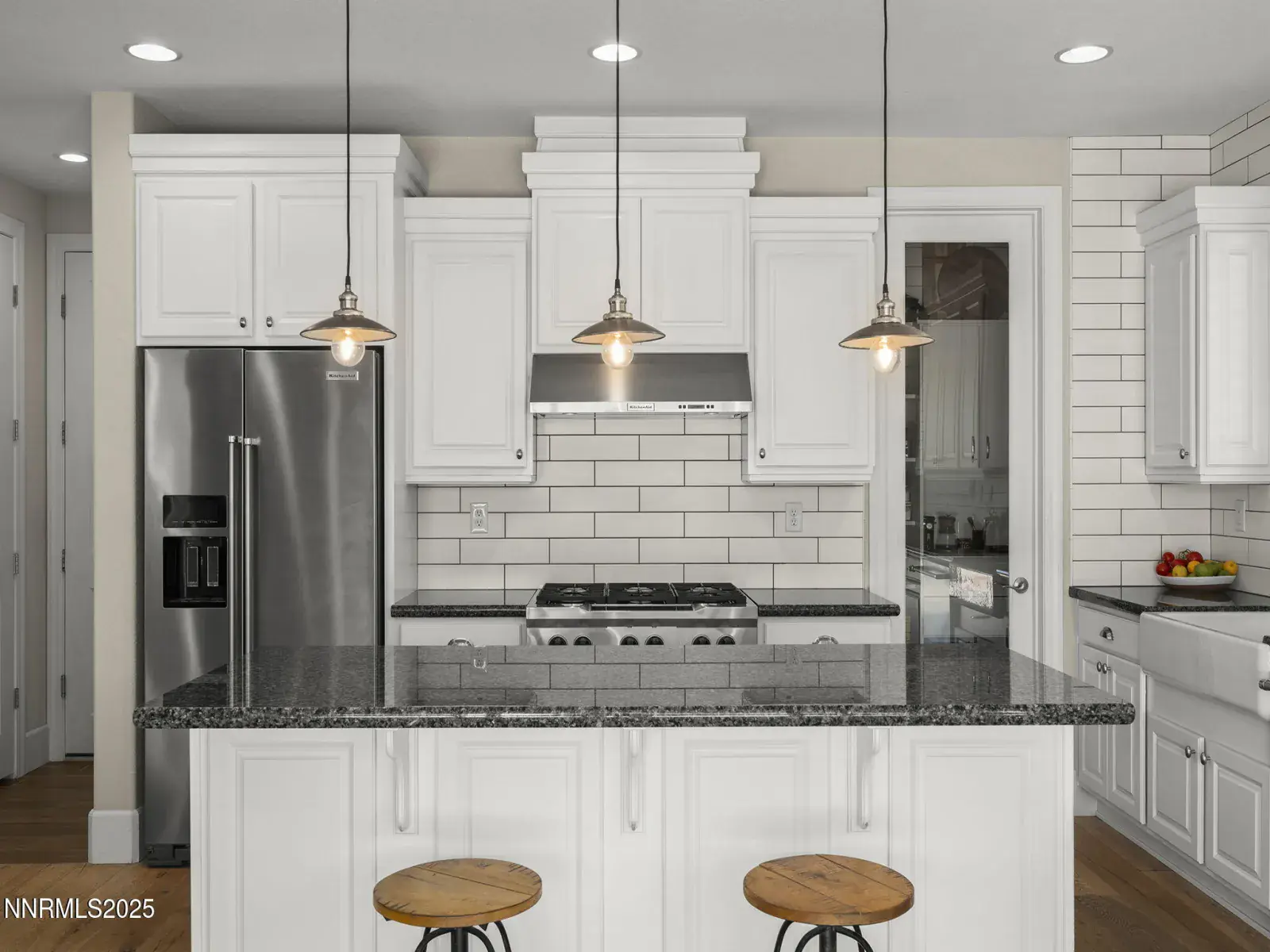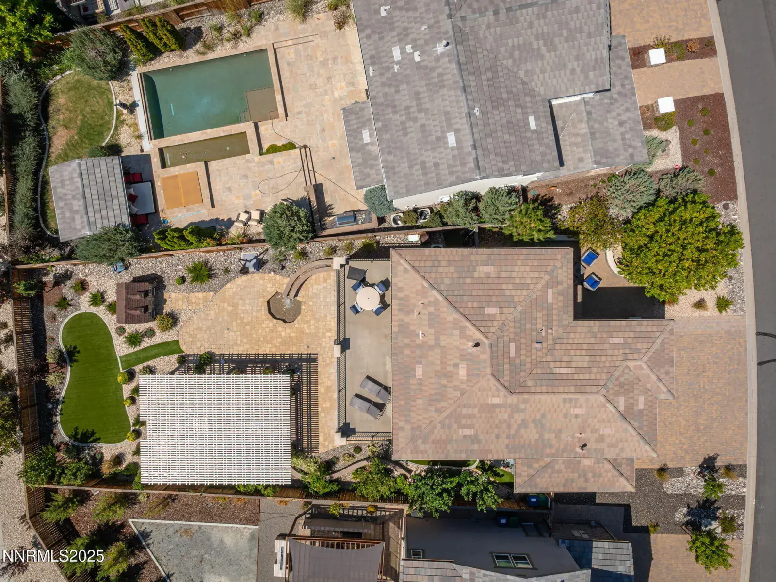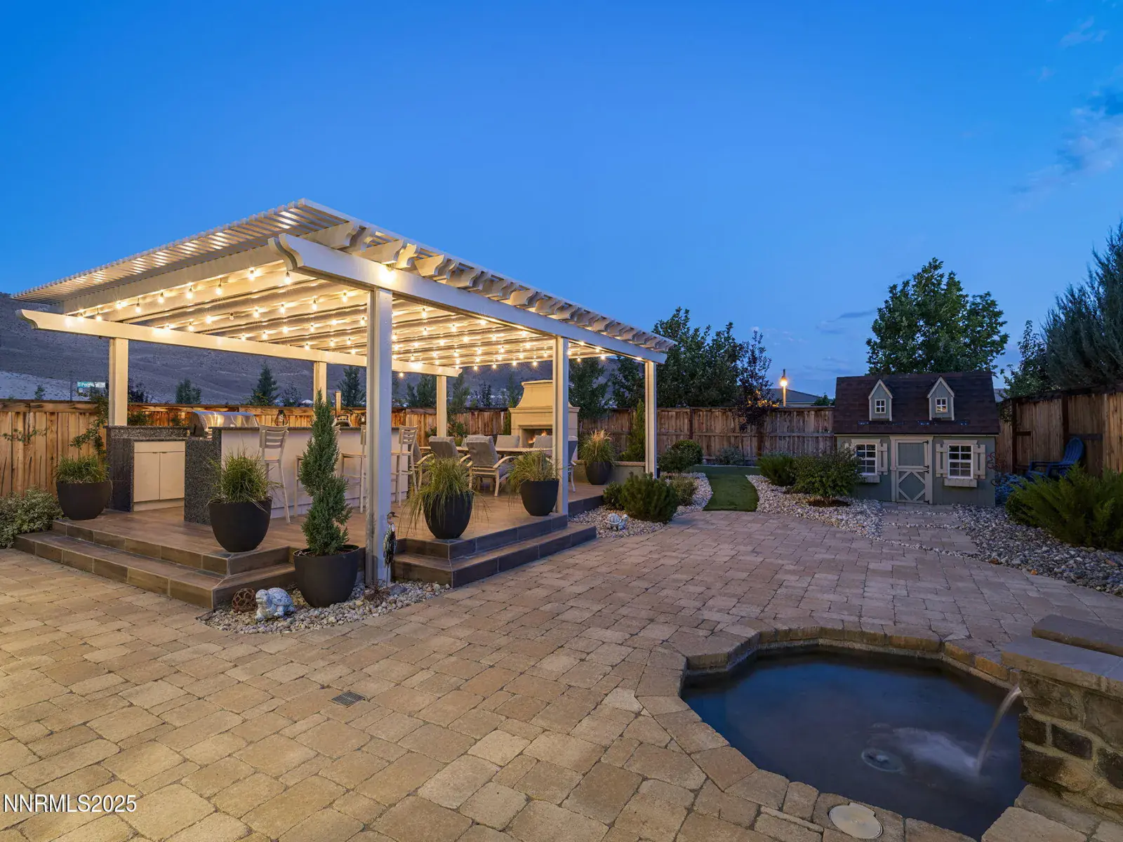 Former model home in Saddle Ridge, fully upgraded with incredible mountain and valley views! The backyard presents an experience unlike any other, enjoy the high quality faux wood aluminum clad steel frame pergola hovering over the 2-step wood print style raised deck. This luxurious setting is highlighted by 2 large granite waterfall islands with a Lynx Sedona stubbed in BBQ and side burner, 5 person bar, 2 Lynx refrigeration systems and ice bin and 9x6ft gas fireplace with raised hearth. Amongst the extensive pavers there is a pond fed by a curved channel with 2ft masonry wall, premium quality turf in the rear and side yard and a covered, wood imprinted tile patio that includes 2 ceiling fans, pull-down shades and is wired with speakers and ready for an outdoor TV. Perched atop the amazing backyard is a 12x35ft full building width balcony off the master bedroom, truly unique to the neighborhood and provides a panoramic view of Mt. Rose, the eastern foothills and Reno’s beautiful valley. The interior of the home is plush with upgrades and enhanced features. The foyer opens to a 14ft tall wood paneling surround, inlaid tile walkway, custom handrails on the staircase and custom long stem drop down pendant lighting. The kitchen has ample builder upgrades with full 18ft wall width granite counter with Kohler farm sink, cabinets above and below, KitchenAid dishwasher, JennAir built-in microwave, counter-to-ceiling subway tile backsplash, extra large granite island (87 x 37″) with breakfast seating for five. Please see the full “Features List” that details all the amazing qualities of this one-of-kind home!