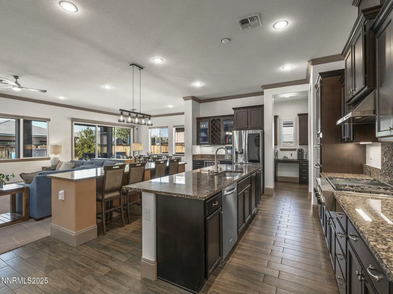Beautiful home in The Estates at Saddle Ridge with amazing views! This Airmont floor plan is perfect for a large family or someone that wants or needs space. The layout makes entertaining a breeze. Open kitchen/great room with two large islands, gorgeous cabinetry, granite slab countertops and walk-in pantry. Enjoy the picturesque Sierra’s and Mt. Rose from the master bedroom or from the backyard of this corner lot. Beautifully designed backyard with oversized paver patios (covered and uncovered), custom outdoor kitchen, hot tub, large water feature and more! Newer carpet and beautiful wood-look tile flooring throughout, custom remote controlled blinds, window shutters, heated and cooled finished garage with extra shelving/storage. Stainless kitchen fridge, washer and dryer included. Smart lighting controls and upgraded lighting. Large storage shed. Enjoy the secluded front courtyard for your morning coffee. Five bedrooms plus flex space for all your needs, Gated community with its own clubhouse, pool, spa, sauna, tennis & pickle ball courts. Located a few minutes from shopping, restaurants, and medical. A short drive to Mt. Rose Ski Resort and Lake Tahoe. Outdoor Kitchen Island included in sale. Security system is owned and stays with home. This home is sure to impress even your pickiest of buyers!