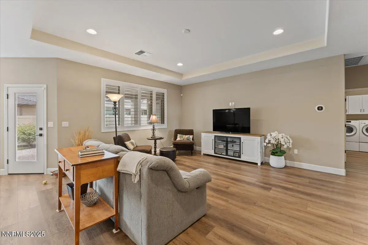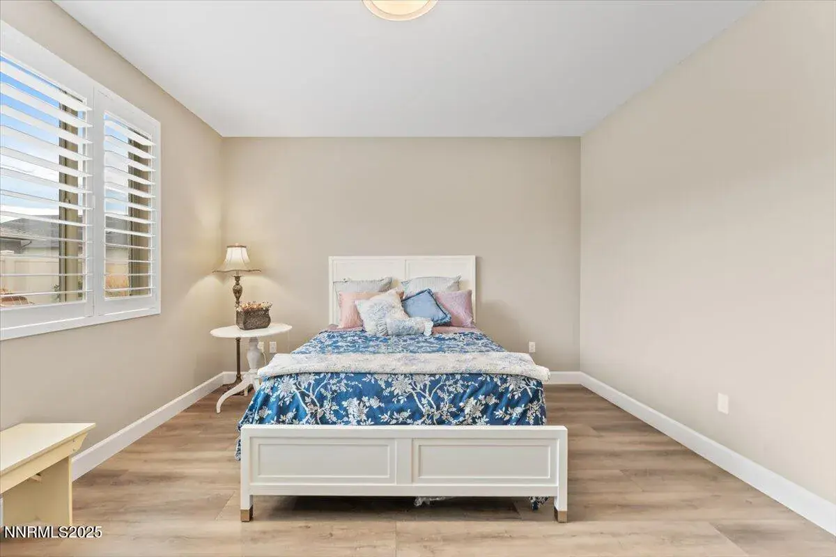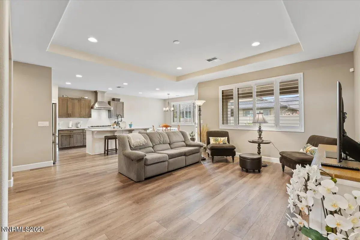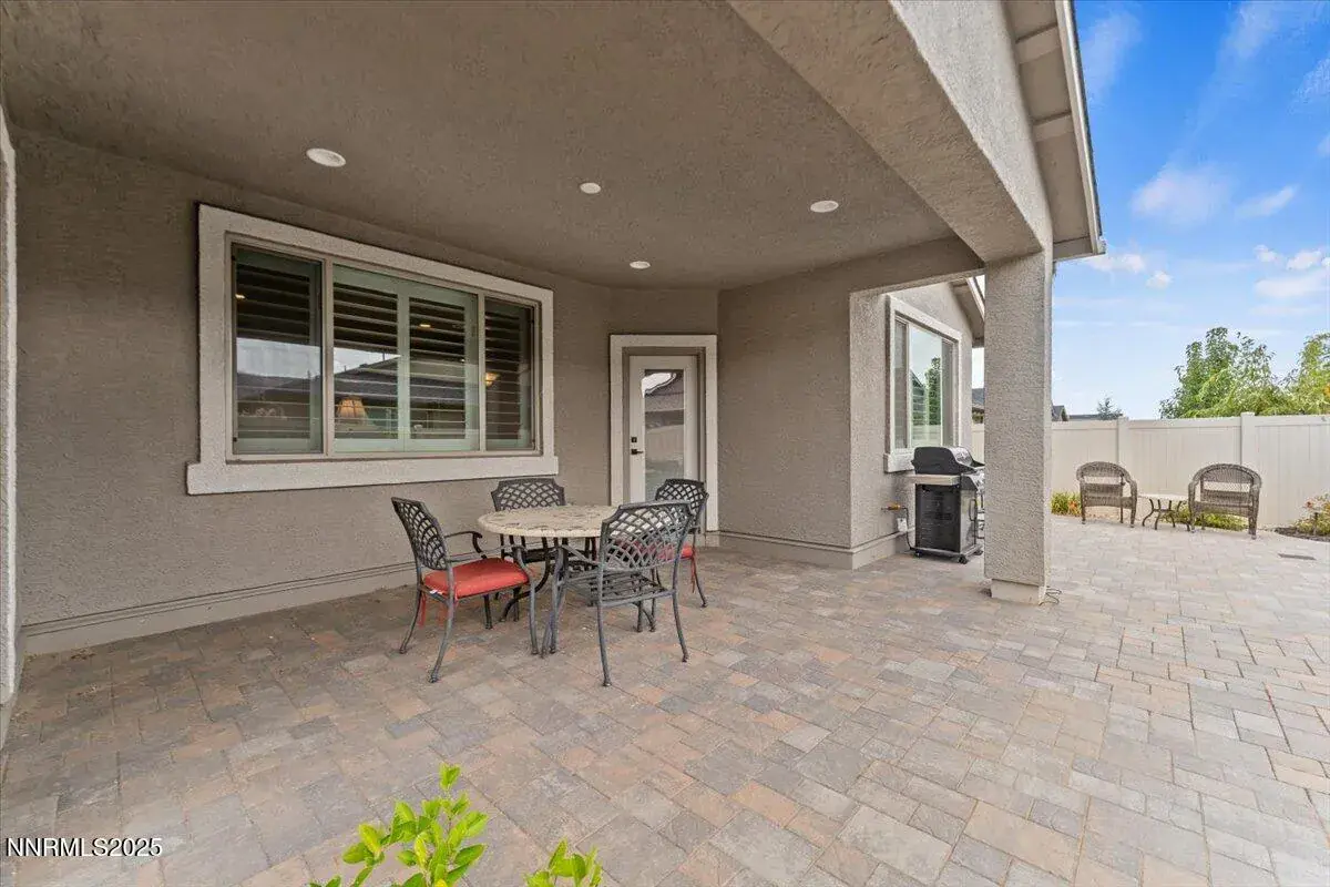 This stunning single-level home is located in the desirable Terreno community of South Reno. Offering 3 bedrooms plus a versatile flex space, the open great room design creates the perfect balance of comfort and function. The chef’s kitchen features quartz countertops, upgraded ZLINE appliances including a 6-burner gas cooktop, and custom cabinetry with pullouts and soft-close drawers. Plantation shutters and upgraded LVP flooring run throughout the home for a seamless, modern look. The private primary suite is thoughtfully separated from the secondary bedrooms and includes a spacious walk-in closet and a beautifully upgraded bath with an extended shower. Additional highlights include a finished garage with attic storage, tankless water heater, and an extended covered patio overlooking easy-care landscaping with a tranquil water feature. An exterior attached storage unit adds convenience, while the HOA maintains the front yard for truly low-maintenance living. Enjoy being just minutes from scenic walking trails, schools, freeway access, shopping, and the highly anticipated Downtown Damonte development. A true low-maintenance gem in a prime South Reno location!