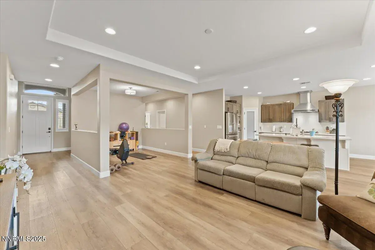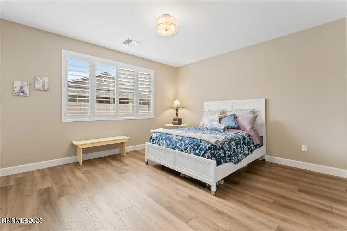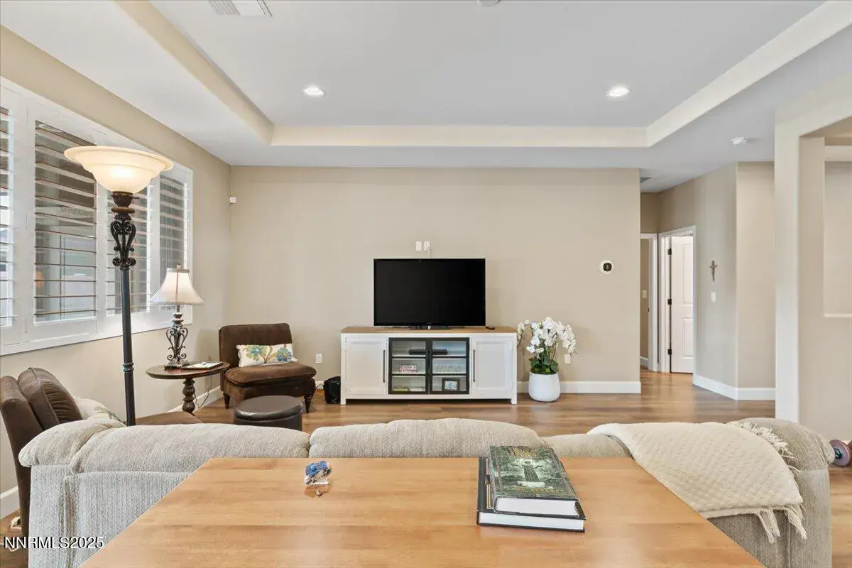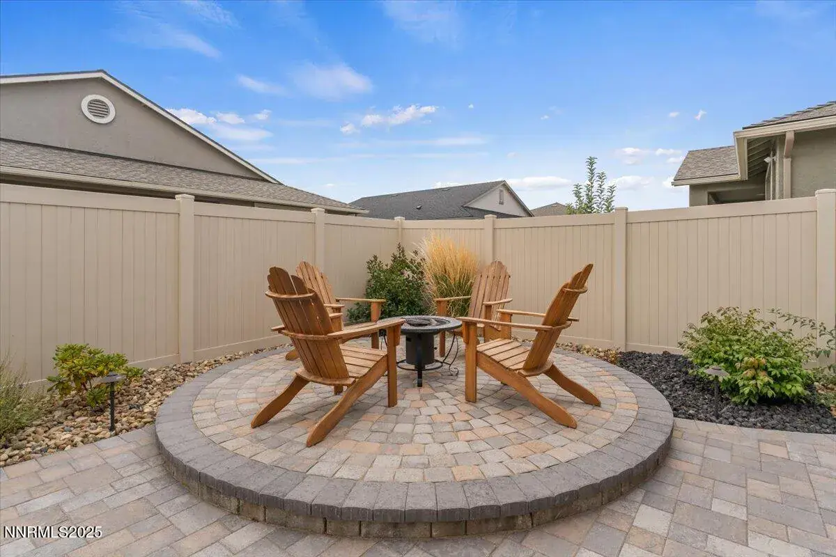 This stunning single-level home is located in the desirable Terreno community of South Reno. Offering 3 bedrooms plus a versatile flex space, the open great room design creates the perfect balance of comfort and function. The chef’s kitchen features quartz countertops, upgraded ZLINE appliances including a 6-burner gas cooktop, and custom cabinetry with pullouts and soft-close drawers. Plantation shutters and upgraded LVP flooring run throughout the home for a seamless, modern look. The private primary suite is thoughtfully separated from the secondary bedrooms and includes a spacious walk-in closet and a beautifully upgraded bath with an extended shower. Additional highlights include a finished garage with attic storage, tankless water heater, and an extended covered patio overlooking easy-care landscaping with a tranquil water feature. An exterior attached storage unit adds convenience, while the HOA maintains the front yard for truly low-maintenance living. Enjoy being just minutes from scenic walking trails, schools, freeway access, shopping, and the highly anticipated Downtown Damonte development. A true low-maintenance gem in a prime South Reno location!