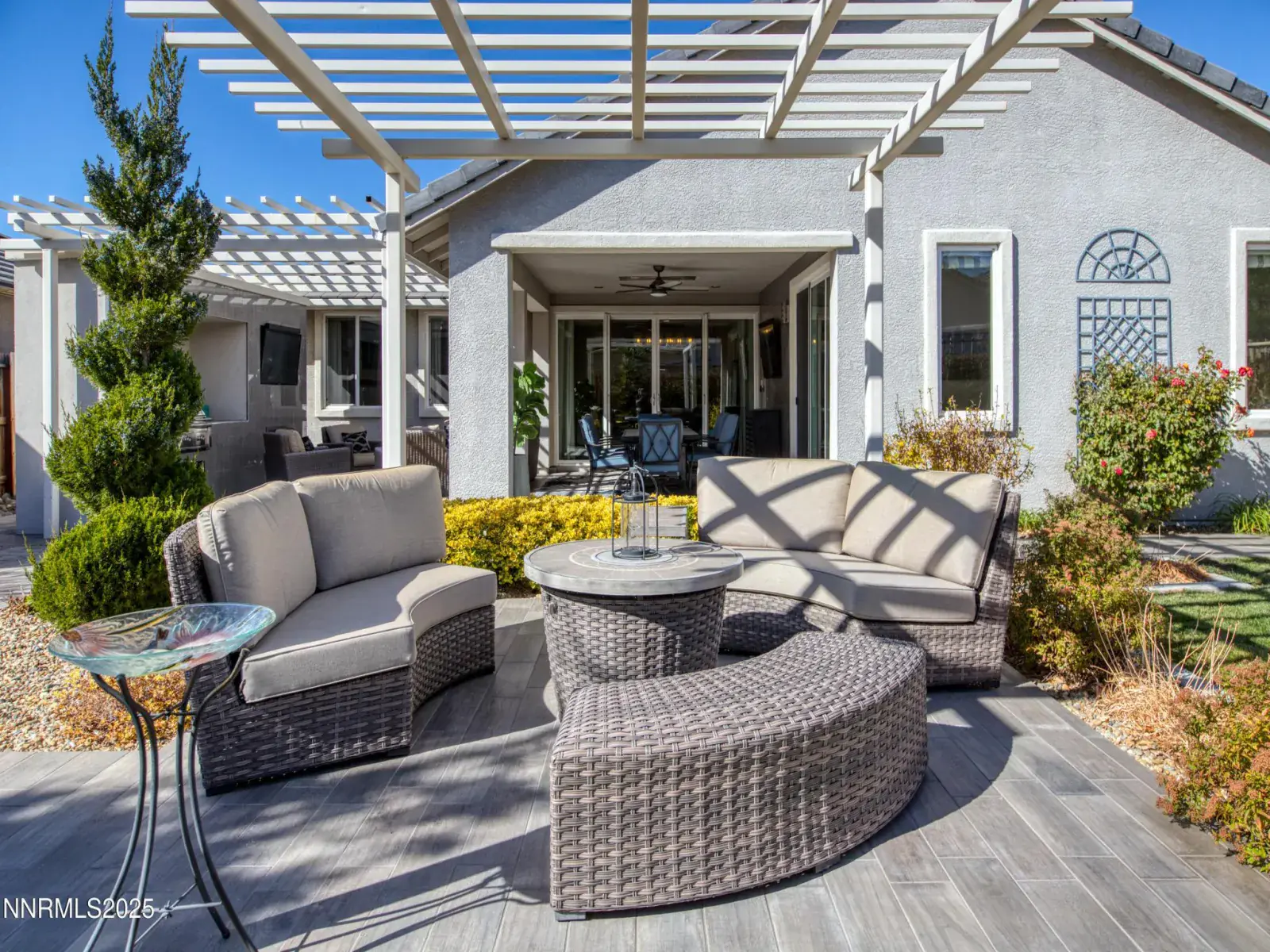 Former Toll Brothers Gilmore Model Home – Over 550,000 in Designer Upgrades! This drop-dead gorgeous former model home in Regency at Caramella Ranch, Toll Brothers’ premier 55+ Active Adult community, showcases approximately 550,000 in total upgrades, including a stunning custom waterfall by Gail Willey. Designed to impress, this home blends luxury, comfort, and effortless indoor/outdoor living. Upon entering, the custom flooring in the foyer sets the tone for this thoughtfully designed residence. The great room features elegant built-in cabinetry, a fireplace, surround sound, custom drapery, and sliders that flood the space with natural light while framing the breathtaking mountain views. The great room opens seamlessly to a covered patio, perfect for entertaining, complete with an outdoor kitchen, two indoor/outdoor TVs, heaters, a gazebo, and the tranquil waterfall feature—your own private retreat. The gourmet kitchen is a showstopper with floor-to-ceiling cabinetry, pull-out drawers, a custom backsplash, Miele dual-fuel steam range, farmhouse sink, wine refrigerator, built-in dining table that seats eight, and the refrigerator included with the home. The primary suite offers private patio access and features custom tile work, dual sinks, a walk-in shower with seamless glass doors, and a spacious walk-in closet with built-in organizers—a true owner’s retreat. The second bedroom is located away from the main living area and primary suite for added privacy and includes built-in closet organizers, a striking faux brick accent wall, and pendant lighting. The hallway bath boasts luxurious tile and designer finishes. The secluded den offers a perfect space for a home office or reading area, highlighted by custom cabinetry and floating shelves with peaceful views of the front patio and waterfall. Additional highlights include: Control4 Home Automation System Electronic window shades Refrigerator, washer, and dryer included Garage with built-in cabinets, epoxy flooring, and a dedicated component room (all components stay) Garage door with backup battery Remote-controlled waterfall Mature landscaping for added privacy and beauty With approximately 1,690 sq. ft., this home offers 2 bedrooms, 2 bathrooms, a den, and a 2-car garage. The open-concept layout provides seamless flow between the kitchen, dining area, and great room, creating a bright and inviting atmosphere perfect for everyday living or entertaining guests. Located in the highly desirable Regency at Caramella Ranch, residents enjoy resort-style amenities, social events, and a low-maintenance lifestyle in one of South Reno’s most sought-after 55+ communities. Experience the quality, craftsmanship, and attention to detail that only Toll Brothers can deliver — this exceptional home truly has it all.