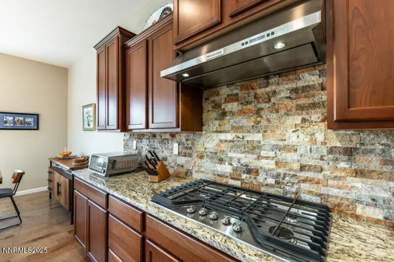 Experience elevated 55+ living at in this a premier gated community where luxury meets lifestyle. This beautifully designed single-story home features light and bright rooms, hardwood floors throughout, den/flex room complete with barn doors, and a formal dining area adjacent to the great room. A spacious breakfast room off the kitchen and great room comes with a fireplace with a mantle and surround. This functional kitchen features granite countertops, and a full-height stone backsplash, stainless steel appliances. The spacious center island offers ample prep space plus seating. Generous pantry space and extensive cabinetry provide excellent storage; all beautifully finished with pendant lighting and hardwood floors. Set on a premium corner lot in a quiet cul-de-sac, the backyard offers enhanced privacy and is thoughtfully landscaped with a blend of lush grass and low-maintenance xeriscaping. From the back of the home, enjoy stunning southern views of Mt. Rose—perfect for peaceful mornings or evening entertaining. Residents enjoy access to an exceptional 17,000 sq. ft. clubhouse with indoor pickleball courts, a year-round heated pool and spa, state-of-the-art fitness center, game and billiards rooms, an aerobics studio, and a refined lounge. The community thrives with engaging clubs, classes, and a full calendar of social events to suit every interest. Outdoor amenities include tennis and bocce ball courts, plus the nearby Presidio Clubhouse with an additional gym, outdoor pool, and spa. Nature lovers will appreciate scenic walking and biking trails through a protected wildlife preserve, with hiking, fishing, and skiing just 25 minutes away. Conveniently located near shopping, dining, the freeway, and the airport, this home offers the ideal blend of sophistication, comfort, and connection. Embrace the vibrant, active lifestyle you deserve in a home that truly has it all.