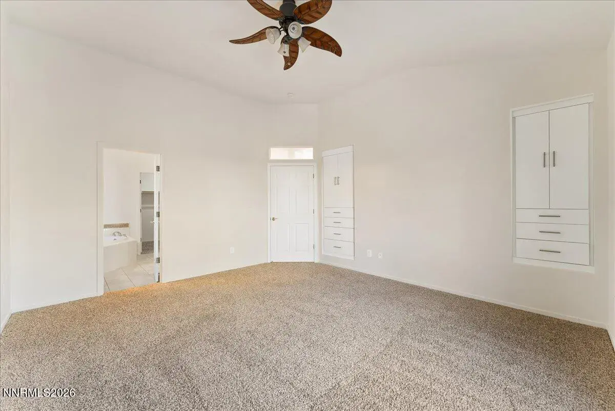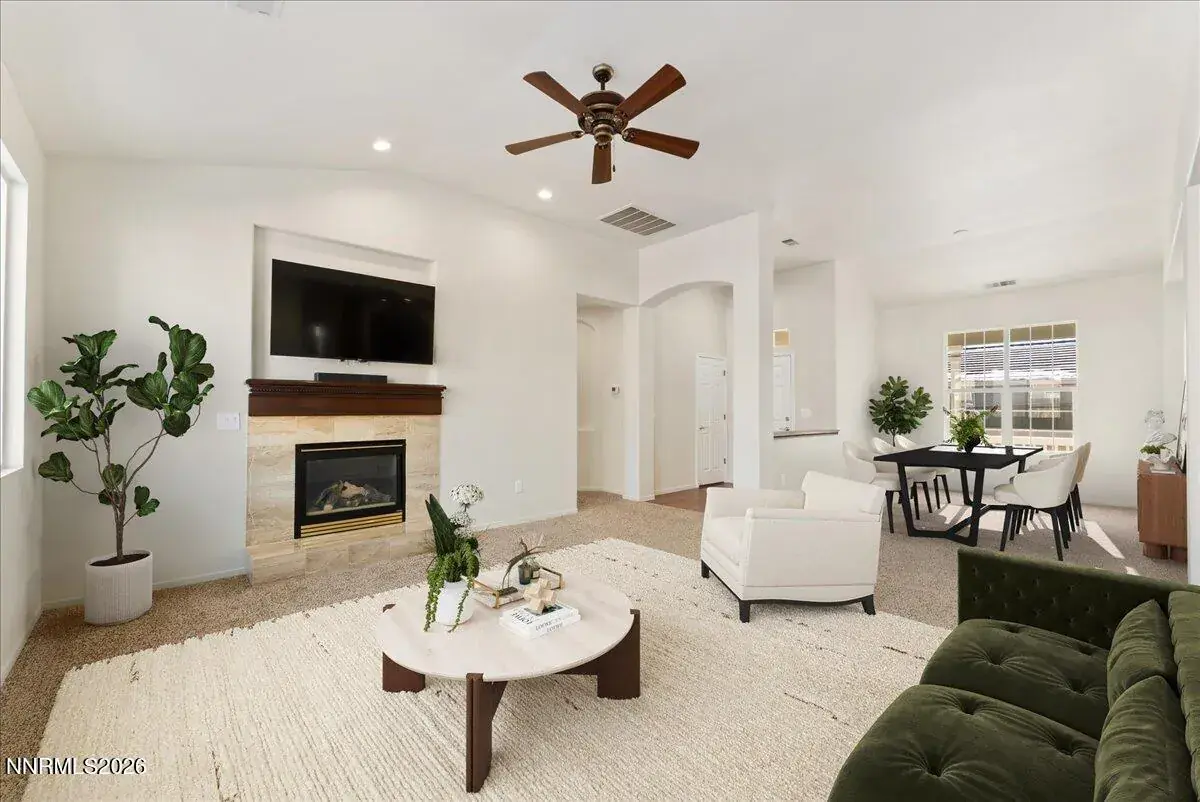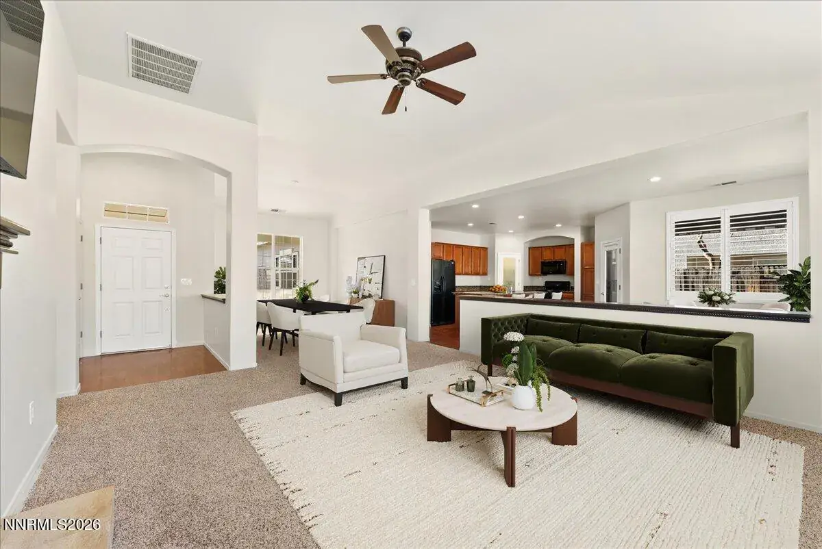 Welcome to easy, single-level living in Miner’s Village, a sought-after 55+ community within Double Diamond Ranch in desirable South Reno. This beautifully maintained home offers three bedrooms, two bathrooms, and just under 2,000 square feet of comfortable living space designed for everyday enjoyment and effortless entertaining. Truly move-in ready, the home has been freshly painted throughout and features brand-new carpet along with extensive electrical updates, including all new switches, outlets, and plates, energy-efficient recessed ceiling lighting, and updated bathroom light fixtures. Safety and convenience have been thoughtfully addressed with replaced smoke and carbon monoxide detectors and new batteries installed. Major system upgrades provide peace of mind with a new furnace, ducting, and air conditioning installed in 2024, plus a new dishwasher and garage door opener added in fall 2025. The primary suite offers newly installed built-in cabinetry for extra storage. A brand-new 55″ wall-mounted flat-screen TV and sound bar in the family room are also included. Step outside to a private backyard with a covered patio—perfect for relaxing. Plus, the HOA maintains the front yard landscaping, allowing for low-maintenance living. Residents enjoy access to a community clubhouse with a gym, pool, and hot tub, along with an active social calendar featuring clubs, games, and gatherings. Ideally located close to walking and biking trails, nearby parks, and convenient shopping, this home offers the perfect blend of comfort, community, and easy living in one of South Reno’s most desirable 55+ neighborhoods.
