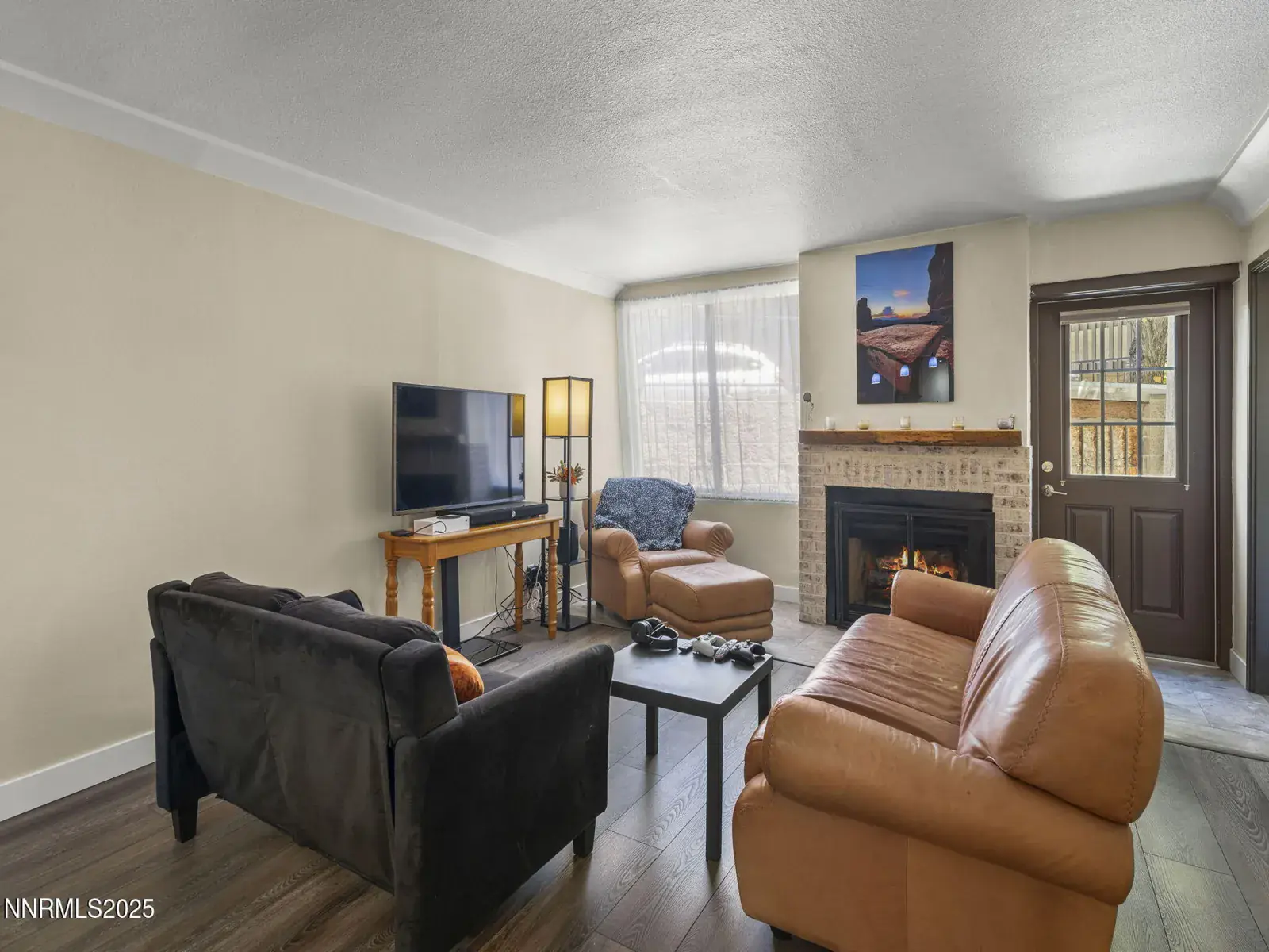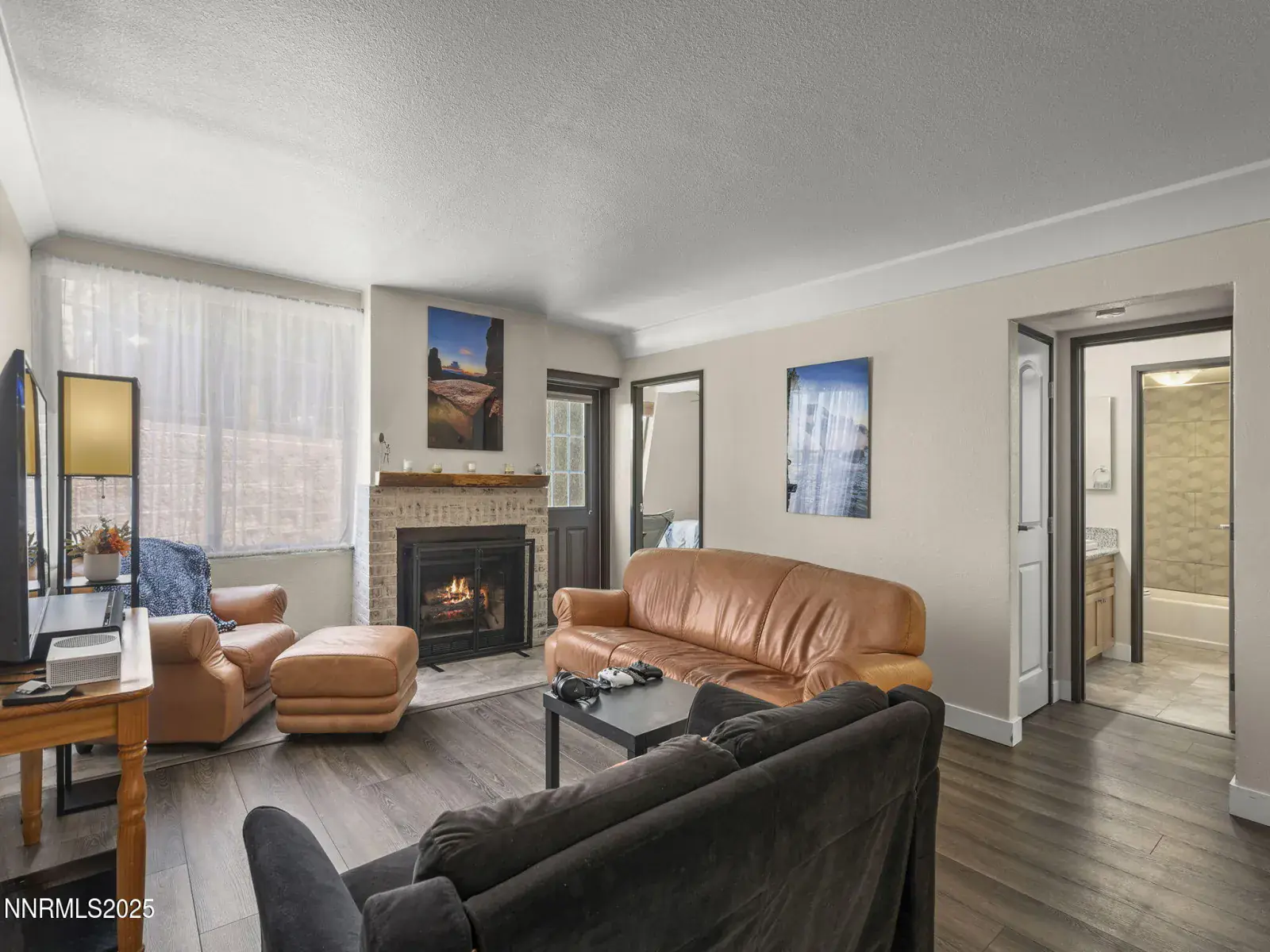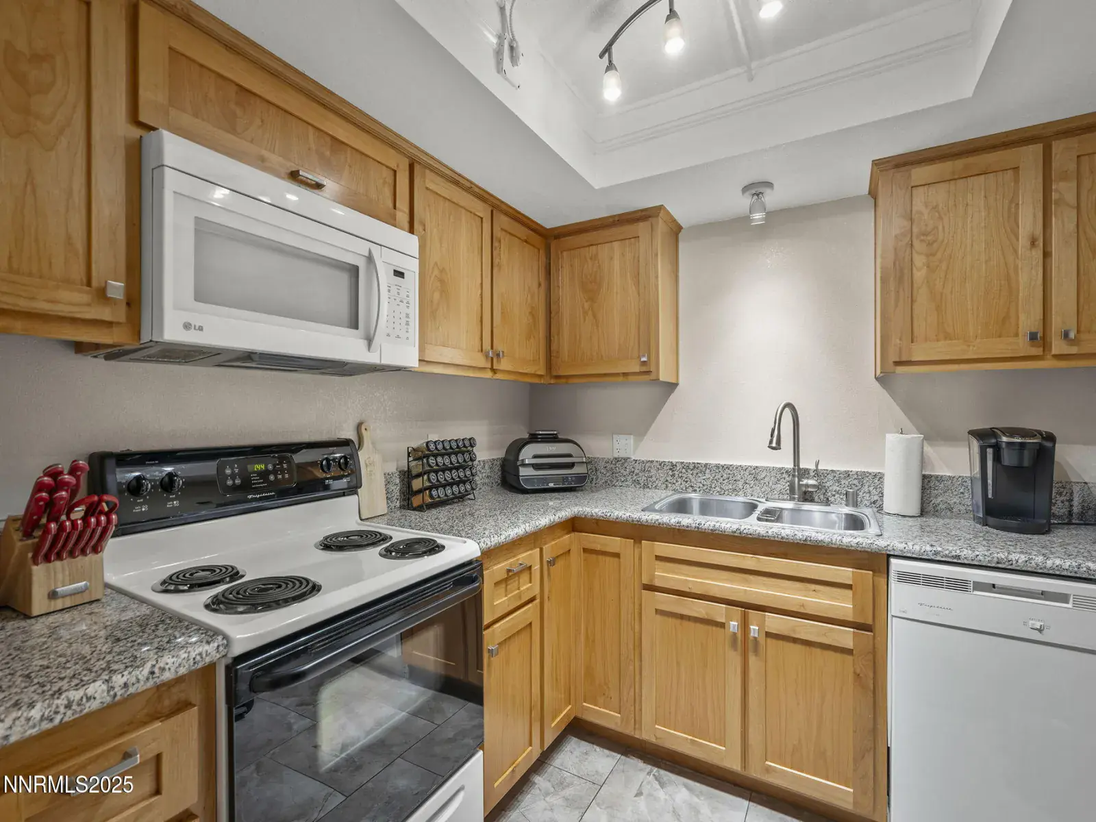 Charming two-bedroom condominium located in the heart of Reno. As you enter, the oversized great room immediately catches your attention as it highlights the abundance of natural light, cozy wood burning fireplace and LVP flooring throughout! The kitchen features granite countertops, solid oak cabinets, electric range and white appliances. The primary bedroom has an en-suite with a shower stall and single vanity. Separate bedroom and full bathroom that has been recently upgraded with tile flooring, shower/tub combo and single vanity with granite countertops.