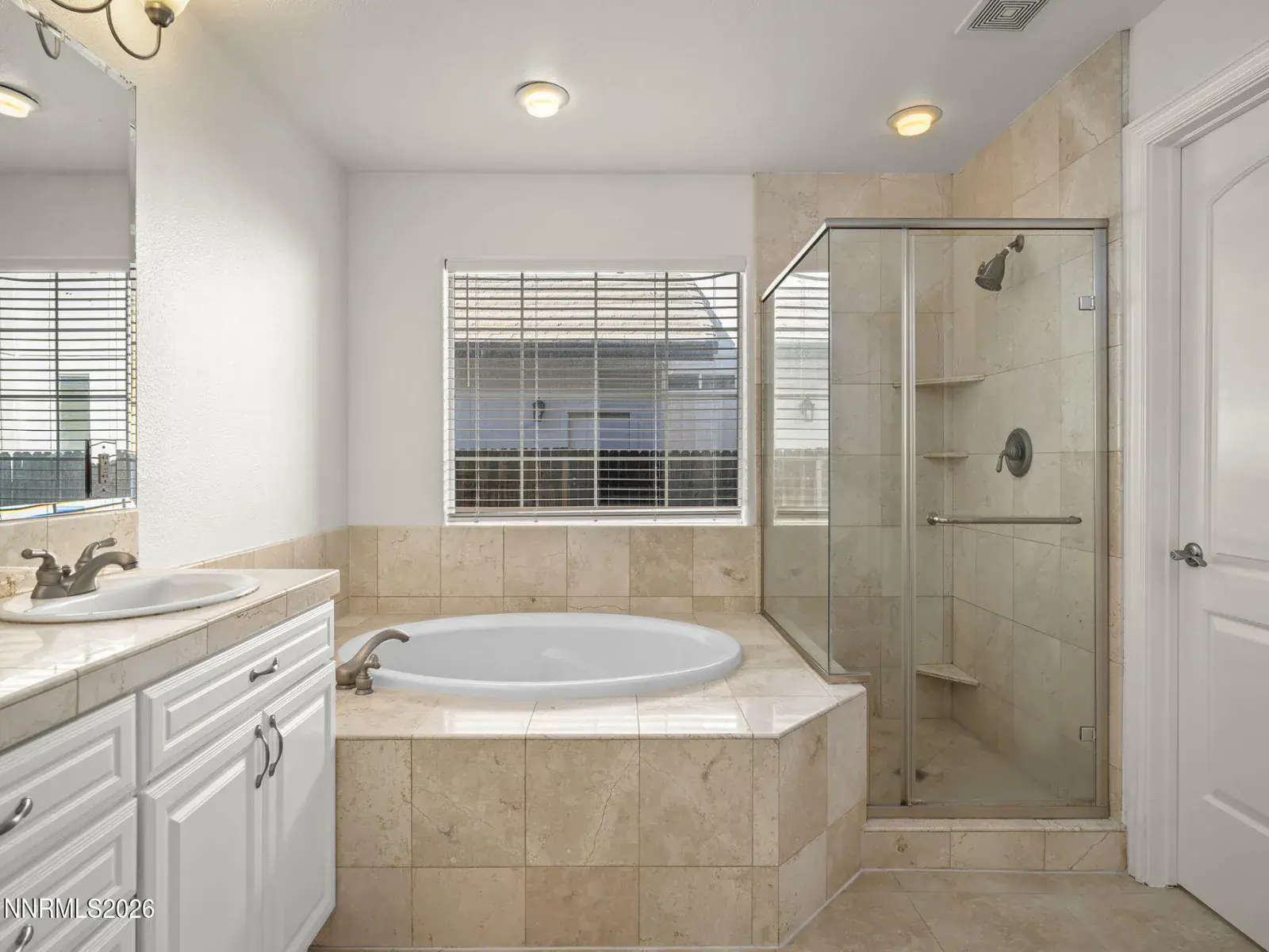 Located on a quiet cul-de-sac in prime Southwest Reno, this well-maintained 5-bedroom home with a 3-car finished garage offers a highly desirable floor plan, including the primary suite and an additional bedroom on the main level. Fresh interior paint enhances the home’s timeless finishes and light-filled spaces. Formal living and dining rooms feature hardwood flooring, a fireplace, and plantation shutters, while the family room showcases soaring ceilings and a second fireplace. The well-appointed kitchen includes granite countertops, newer glass cooktop, double ovens, built-in microwave, ample cabinetry, center island, and breakfast nook. The expansive primary suite offers a private sitting area with fireplace and a spacious bath with soaking tub, walk-in shower, dual vanities, and large walk-in closet. Upstairs are three additional bedrooms, including a junior suite with full bath and walk-in closet. The private backyard is a serene retreat with a spacious patio, tranquil water feature, and mature landscaping. Additional highlights include a large laundry room with cabinetry and sink, newer tankless water heater, and built-in vacuum system. Exceptional home in an unbeatable Southwest Reno location. See private remarks: