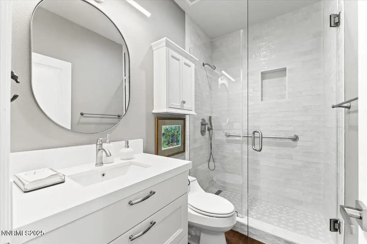 Throughout Reno, there is very little available in the way of new custom home construction. In 2024, this custom build went through an 8-month renovation where every part of this home was rebuilt, replaced and in some parts redesigned to create an open, functional living space with expansive windows that showcase the front and back views. The seller is offering (3) options for purchasing this home. 1. Purchase the home and what is listed in the listing details. This option is what is included in the listed price. 2. Purchase the house fully furnished. 3. With the purchase of the home individual furniture item are negotiable. The home sits upon a knoll corner lot and cul de sac within a half block of Wolf Run Golf Club entrance. Enter through a walled and gated stone courtyard to the open floor plan with vaulted ceilings, wood flooring, enormous windows, and natural light throughout. The living room, kitchen, breakfast area, and dining room are all one large open space. The appliances are energy star-rated and include a 48″ Subzero refrigerator, Zline Dual-Fuel Range, Crystal cabinetry (be sure to check out the unique cabinet features), quartzite countertops, pantry with coffee bar, and an oversized center island. The primary suite is large enough for an office setup and has two walk-in closets. The primary bathroom has dual sinks, a walk-in shower, and a standalone soaking tub. The additional bedrooms (one ensuite, two jack-and-jills) are large and bright with 2 having walk-in closets and one having a floor to ceiling closet design. The backyard is fully fenced with views of Mt. Rose and the 10th hole of Wolf Run Golf Course. The new landscaping/irrigation system was designed to meet fire prevention recommendations of the Washoe Fire Department and have minimal water usage. The four-car garage is 1160 sq ft with a workshop bay. The laundry room has built-in desks, bookcases, and a coat rack. Attached at the end of the listing is the floor plan and a list of all the remodel upgrades that include fresh paint inside and out, new Milgard & Anderson energy efficient windows, new appliances, LED lighting throughout, exterior ground lighting, exterior security cameras, a newly improved roof with an extended 30 years estimated life, a whole house surge protector and so much more!