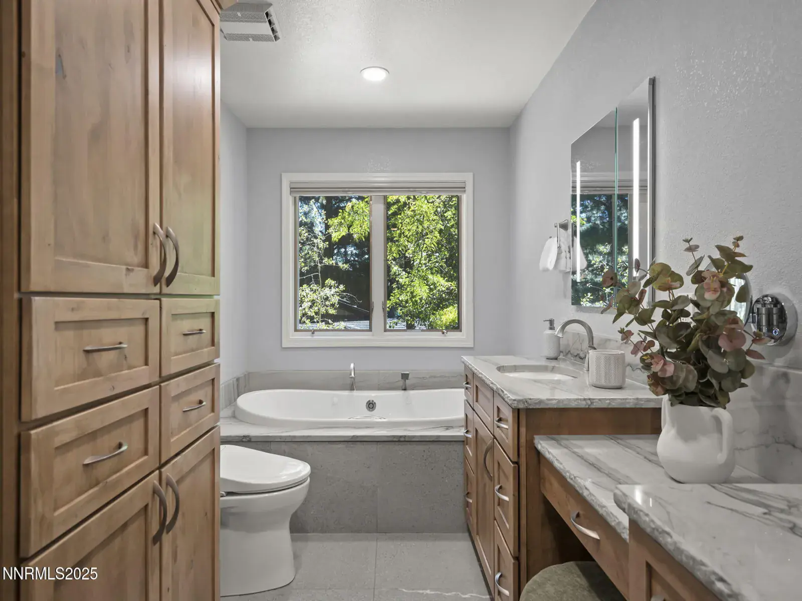 The primary suite, remodeled in 2022, creates a spa-like retreat with programmable radiant heat tile floors, a 9-foot quartzite vanity with a centered makeup space, knotty alder cabinetry, and a frameless porcelain and river rock shower. Enjoy premium Brizo Virage fixtures, a heated MAXX jetted tub with quartzite surround, a heated towel rack, and an elongated, heated, and self-cleaning Toto Washlet bidet toilet. Additional features include a Robern LED medicine cabinet with outlets and USB ports, a magnification mirror, new wall insulation, and dual step-in closets—one fully customized with cedar floors, drawers, shelving, and motion lighting.