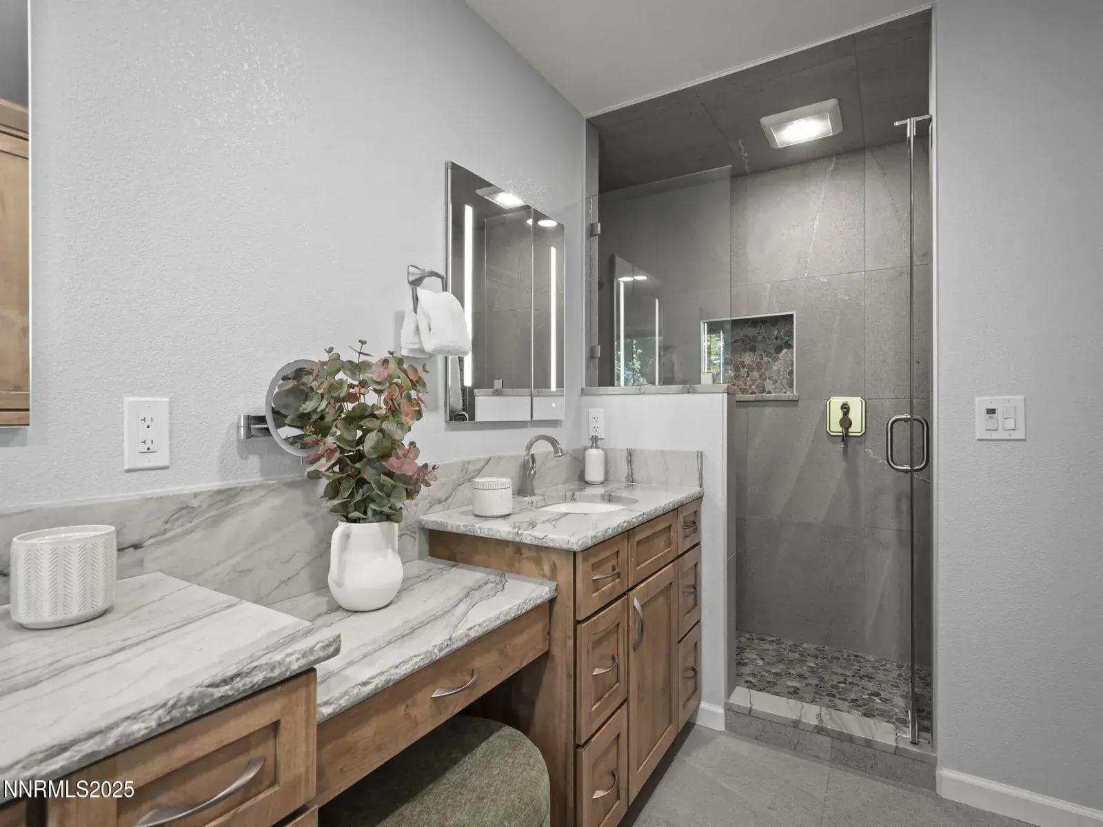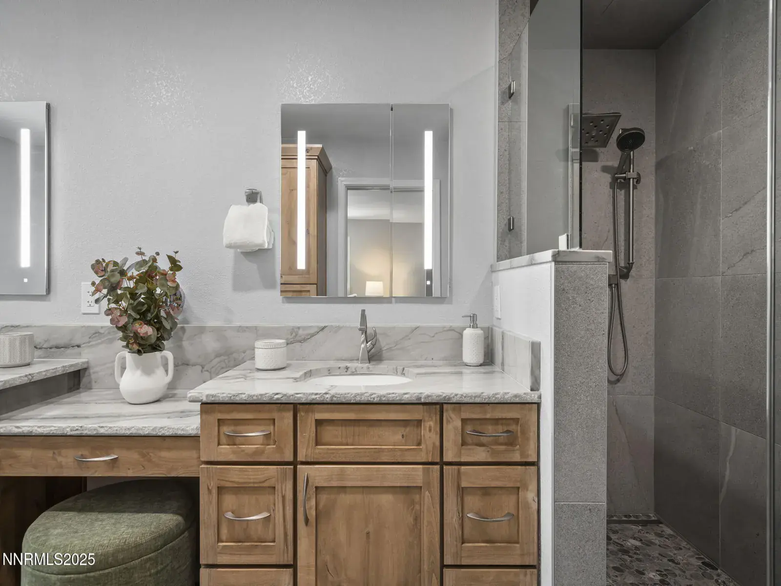 In 2025, the laundry room, powder room, and guest bathroom were refreshed with new quartzite counters, modern undermounted sinks and faucets. The guest bath remodel also included a new porcelain tile shower and flooring, updated drywall and baseboard and fresh paint.
