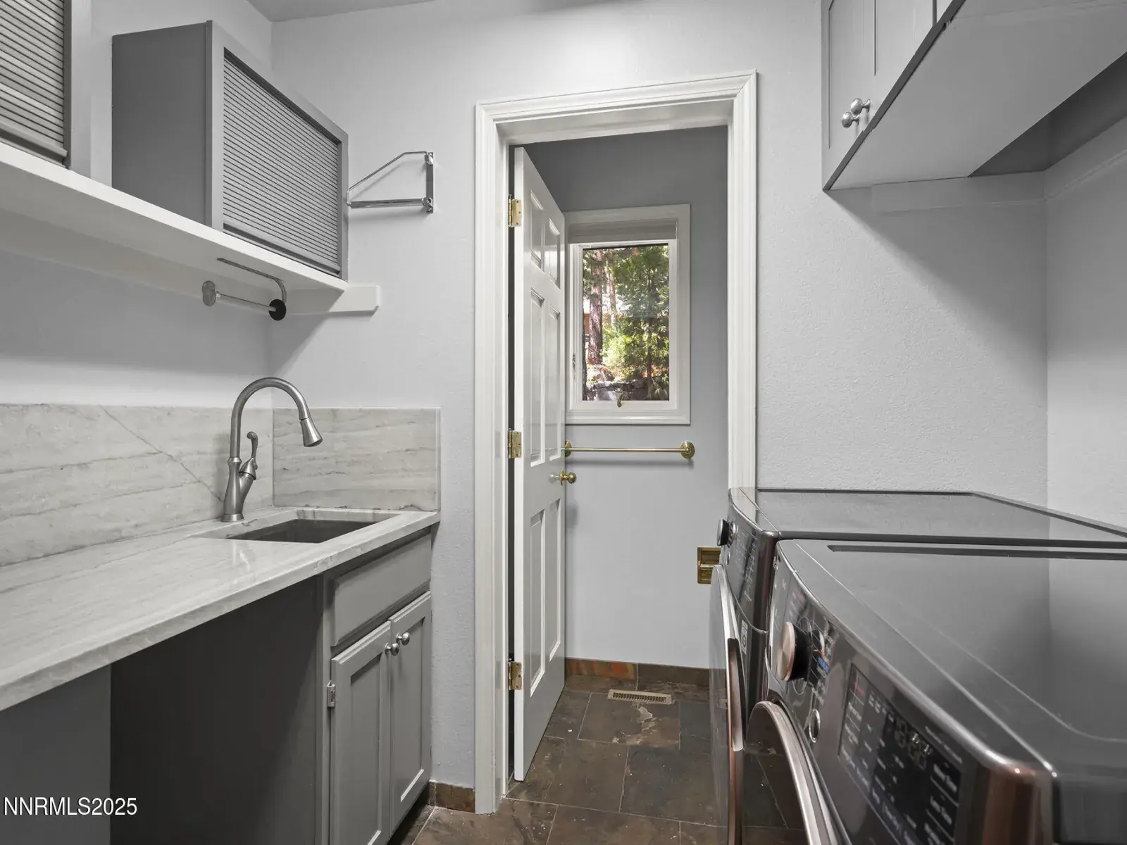 Cabinets, Laundry Room, Shelves, Sink, Washer Hookup