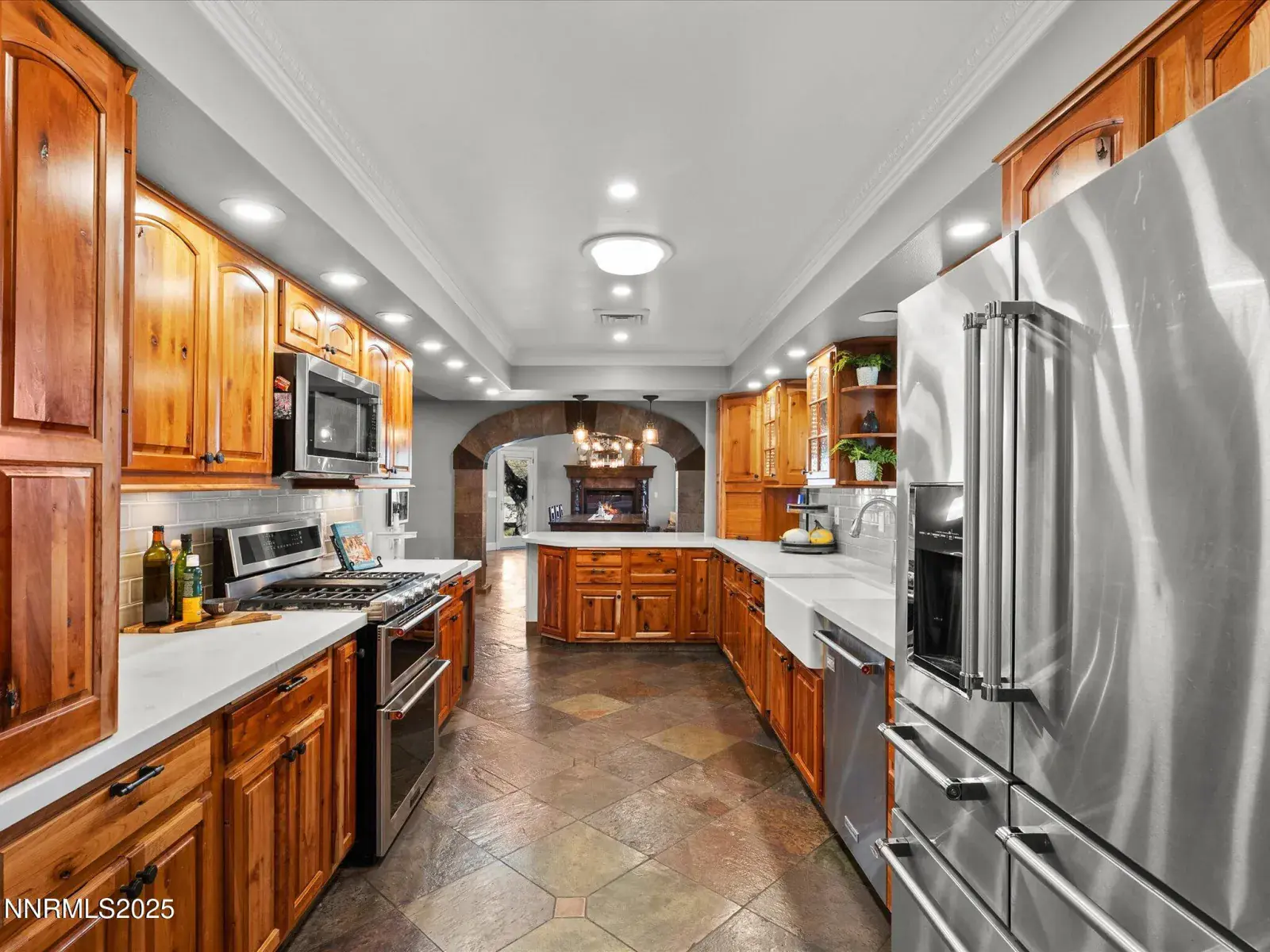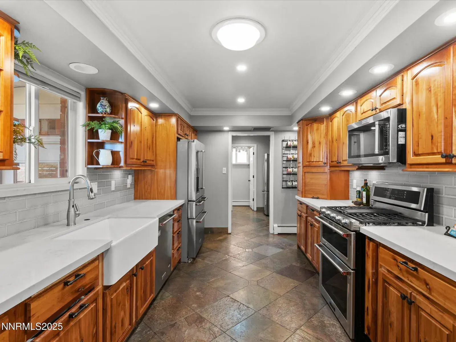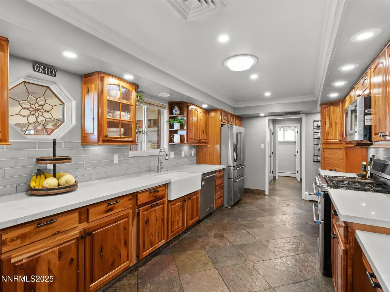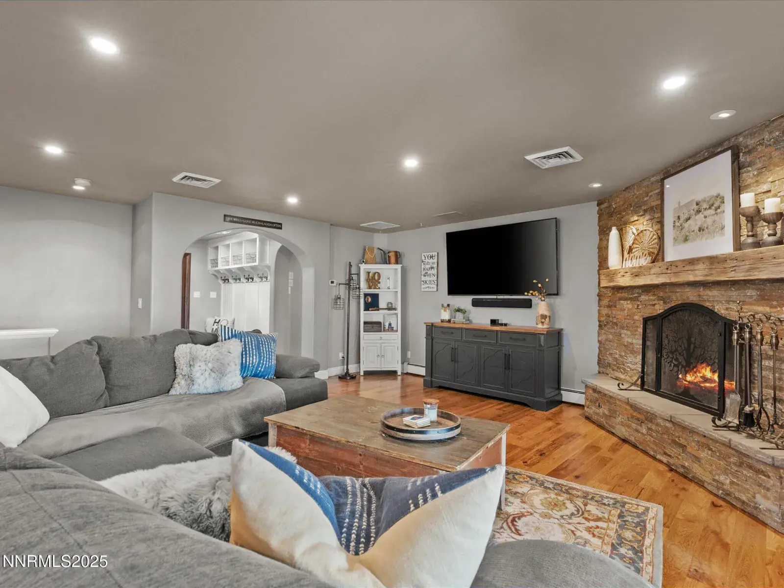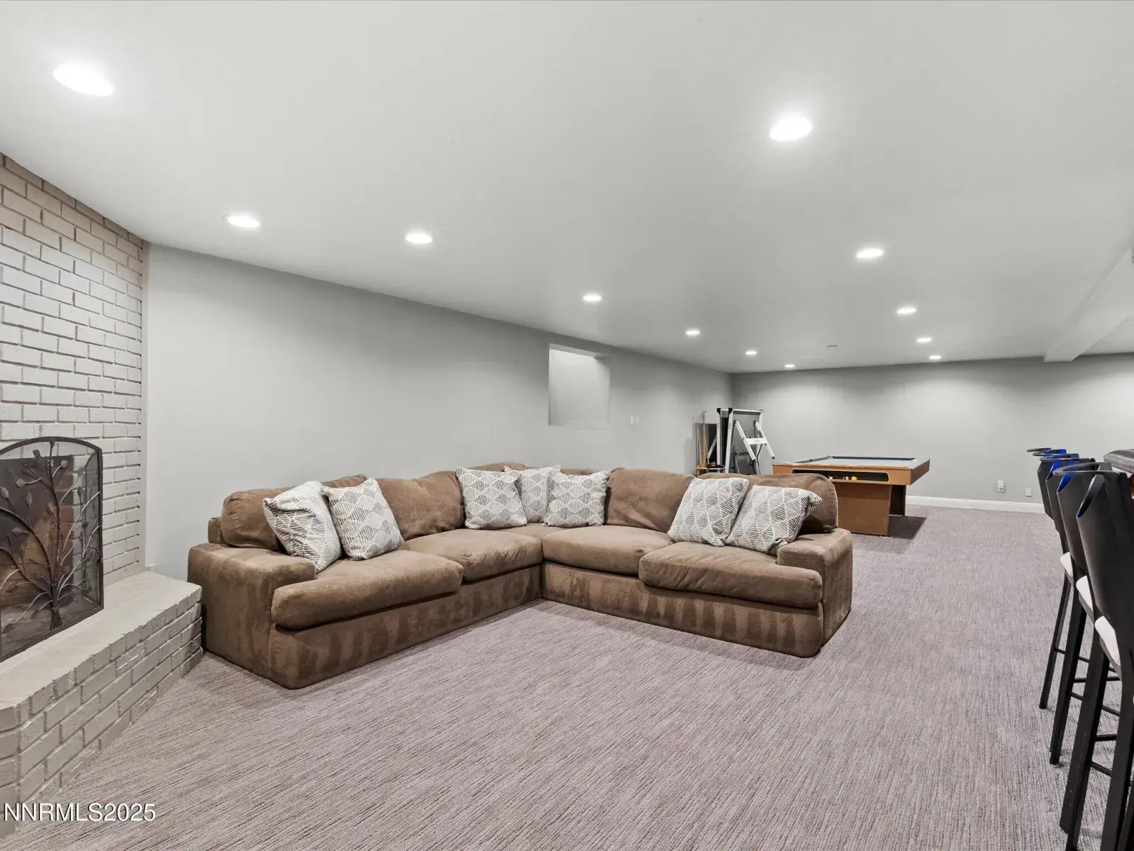 This spacious and beautifully maintained single-story home with a fully finished basement offers 6,336 sq ft of living space, thoughtfully designed for comfort, flexibility, and entertaining. The main level spans 3,940 sq ft and features a sprawling floor plan with both open and private spaces. The updated kitchen provides abundant counter space, stainless steel appliances, and a butler’s pantry with a second sink and dishwasher, perfect for hosting gatherings. Additional highlights include an office nook with built-ins, a family/playroom, and multiple fireplaces throughout the living and dining areas, as well as in the primary suite and the outdoor courtyard. Recently replaced recessed lighting and a solar tube in the entryway enhance the home’s natural light and warmth. The primary suite is a true retreat, offering mountain views and a separate sitting room with a private bar. A double-sided fireplace connects the sitting area to the spa-like bathroom, which features a jetted garden tub, separate shower, and dual vanities. The sitting room’s cozy ambiance makes it ideal as a reading nook, home gym, or office, while a massive walk-in closet with custom his-and-hers organization completes this luxurious space. Downstairs, the finished basement adds 2,396 sq ft of versatile living space, with a large family area and wood-burning fireplace, a full kitchen with a bar, two bedrooms, a full bath, and extra flexible space and storage rooms. A separate entrance from the 3-car garage makes this level ideal for guests, extended family, or multigenerational living. Outside, the 1.36-acre lot offers a park-like setting with mature landscaping, multiple seating areas, and mountain and downtown views. There’s ample space for RV and boat parking, a dump station, and an additional storage shed/workshop. The finished, insulated three-car garage features epoxy flooring and direct access to the basement. Additional features include fresh interior paint, new HVAC system in the main living area, an owned solar system, no HOA, and no rear neighbors. Located less than two miles from I-80 and five miles from downtown Reno, you’ll enjoy easy access to hiking, biking, and walking trails along the Truckee River, all while coming home to peace, space, and stunning views.