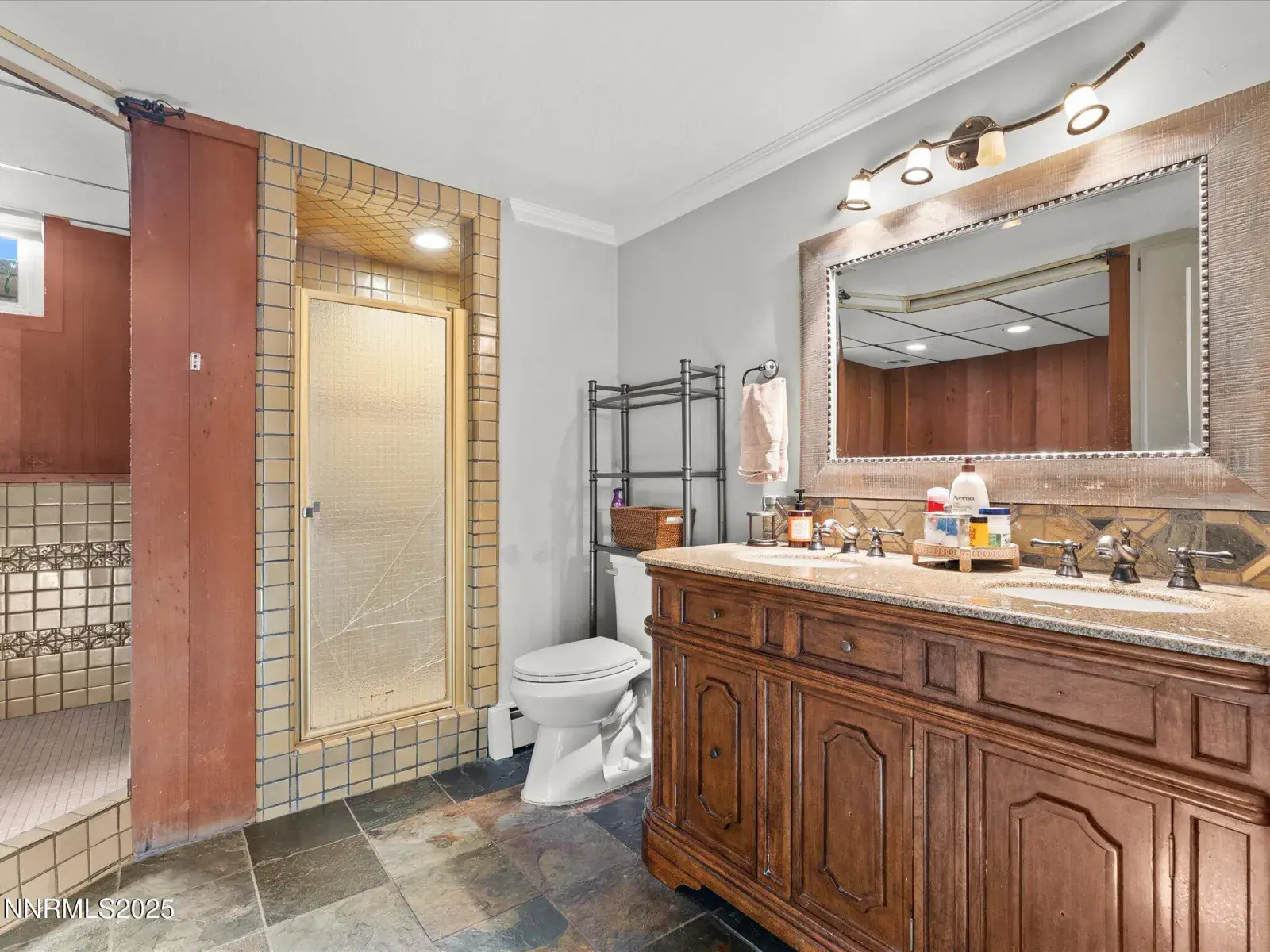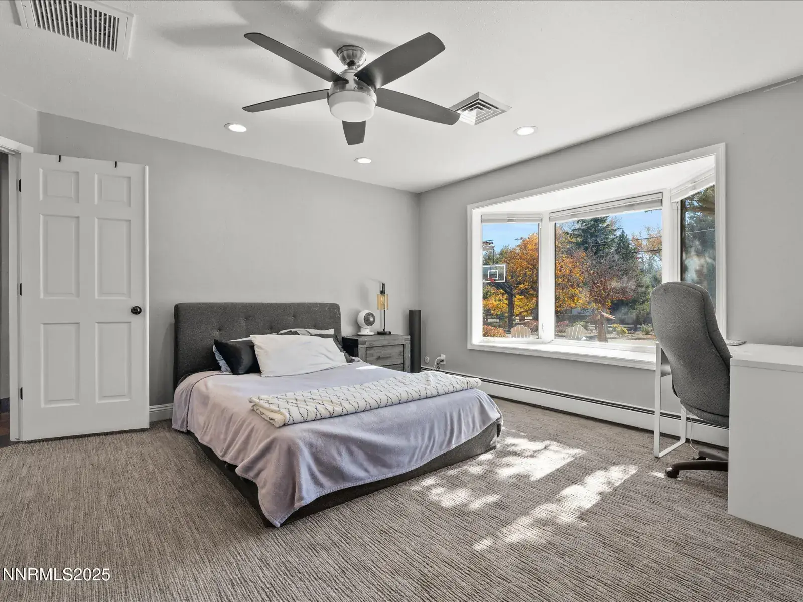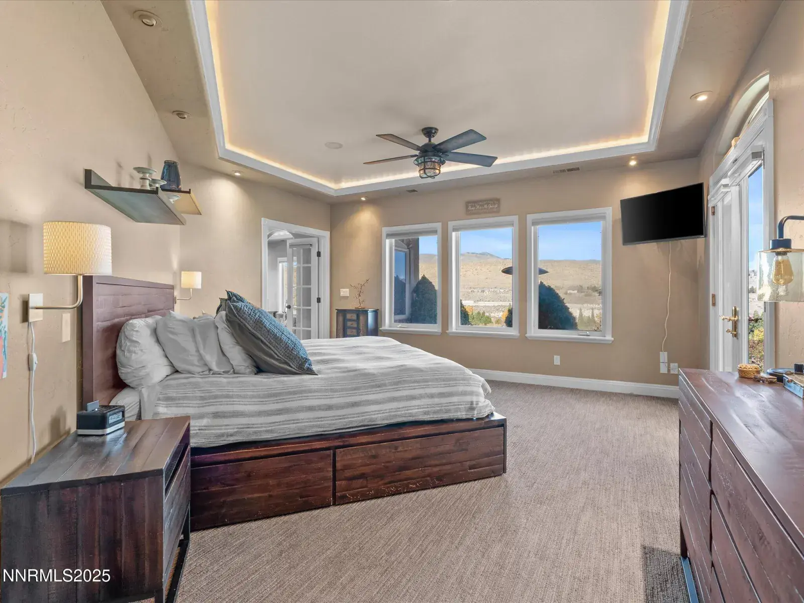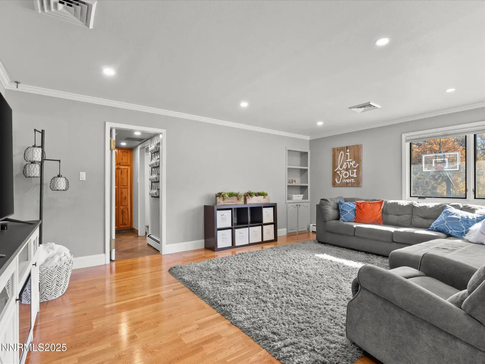 This spacious and beautifully maintained single-story home with a fully finished basement offers 6,336 sq ft of living space, thoughtfully designed for comfort, flexibility, and entertaining. The main level spans 3,940 sq ft and features a sprawling floor plan with both open and private spaces. The updated kitchen provides abundant counter space, stainless steel appliances, and a butler’s pantry with a second sink and dishwasher, perfect for hosting gatherings. Additional highlights include an office nook with built-ins, a family/playroom, and multiple fireplaces throughout the living and dining areas, as well as in the primary suite and the outdoor courtyard. Recently replaced recessed lighting and a solar tube in the entryway enhance the home’s natural light and warmth. The primary suite is a true retreat, offering mountain views and a separate sitting room with a private bar. A double-sided fireplace connects the sitting area to the spa-like bathroom, which features a jetted garden tub, separate shower, and dual vanities. The sitting room’s cozy ambiance makes it ideal as a reading nook, home gym, or office, while a massive walk-in closet with custom his-and-hers organization completes this luxurious space. Downstairs, the finished basement adds 2,396 sq ft of versatile living space, with a large family area and wood-burning fireplace, a full kitchen with a bar, two bedrooms, a full bath, and extra flexible space and storage rooms. A separate entrance from the 3-car garage makes this level ideal for guests, extended family, or multigenerational living. Outside, the 1.36-acre lot offers a park-like setting with mature landscaping, multiple seating areas, and mountain and downtown views. There’s ample space for RV and boat parking, a dump station, and an additional storage shed/workshop. The finished, insulated three-car garage features epoxy flooring and direct access to the basement. Additional features include fresh interior paint, new HVAC system in the main living area, an owned solar system, no HOA, and no rear neighbors. Located less than two miles from I-80 and five miles from downtown Reno, you’ll enjoy easy access to hiking, biking, and walking trails along the Truckee River, all while coming home to peace, space, and stunning views.