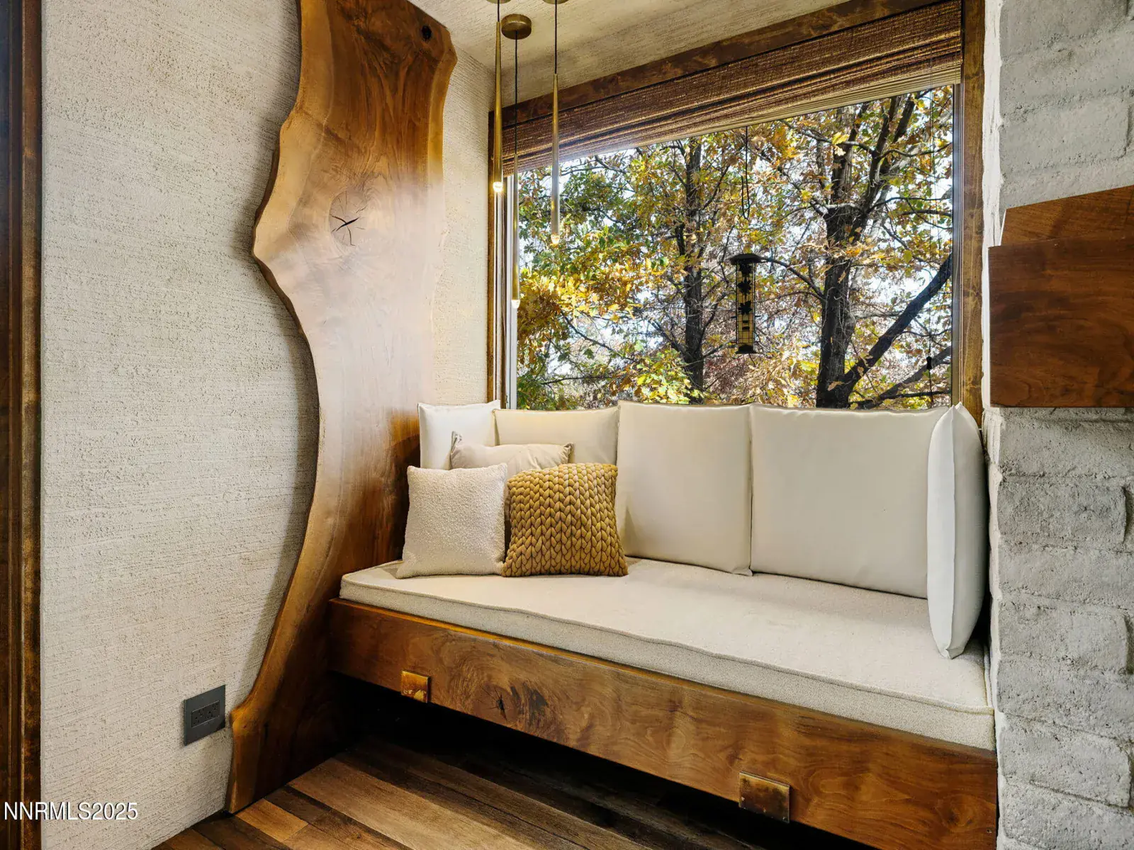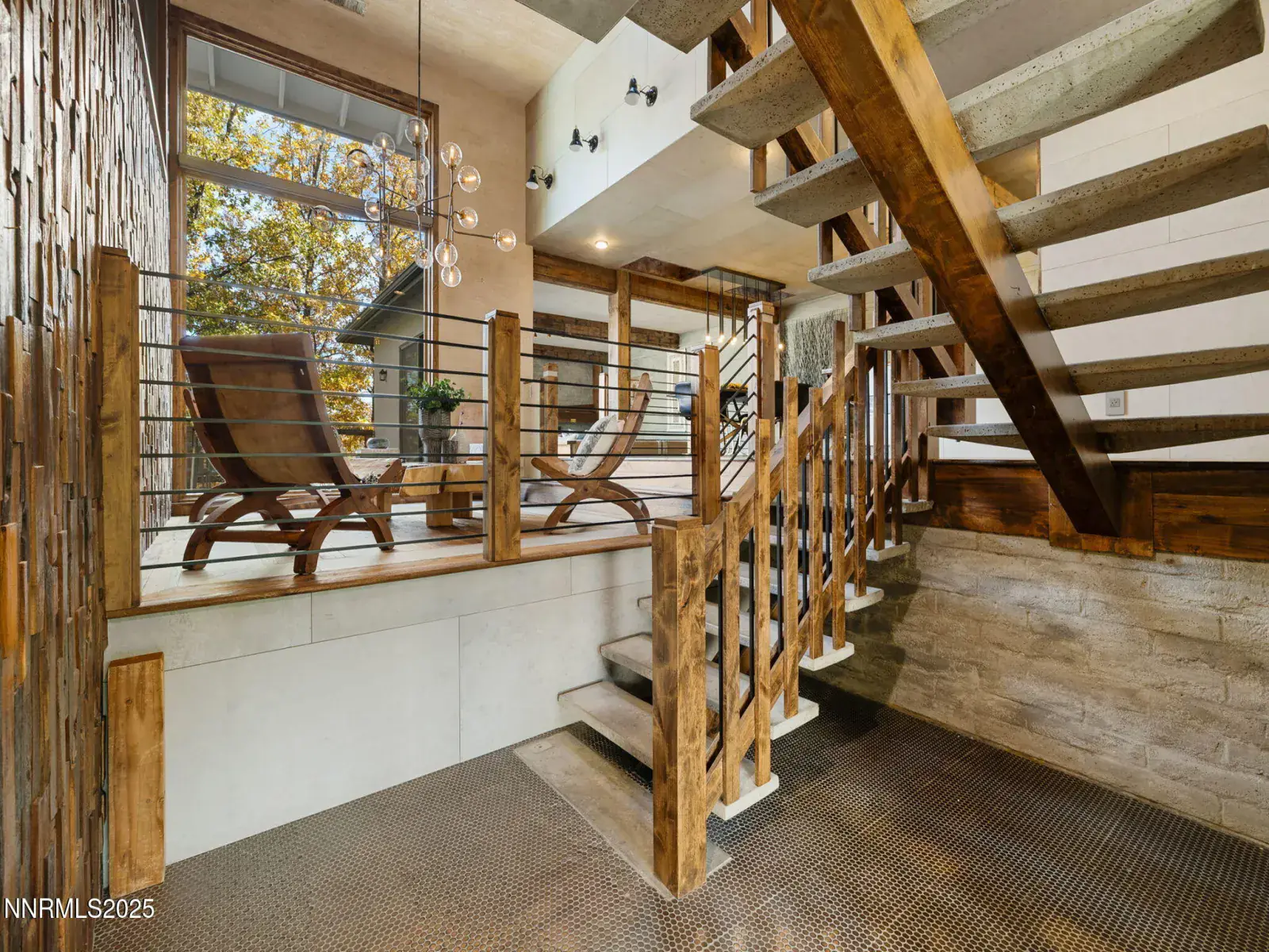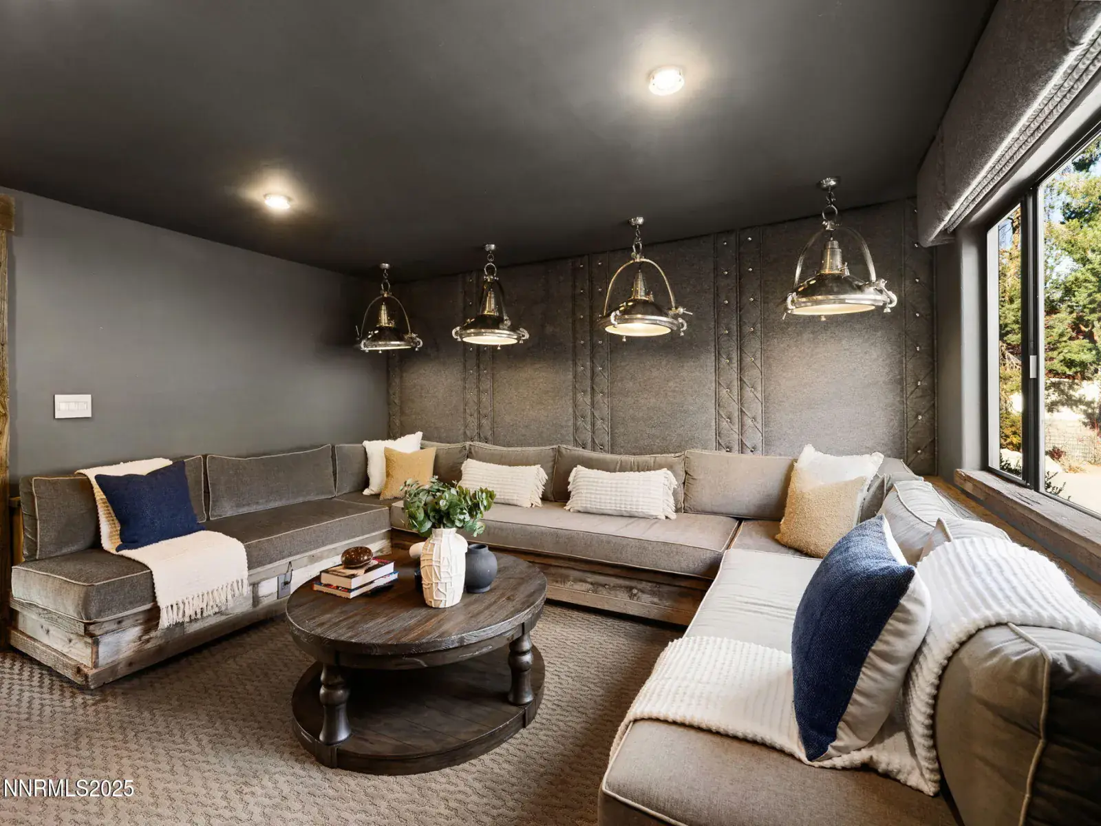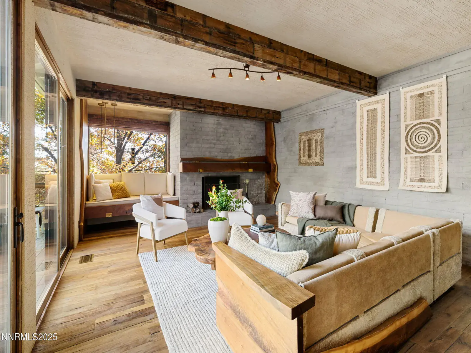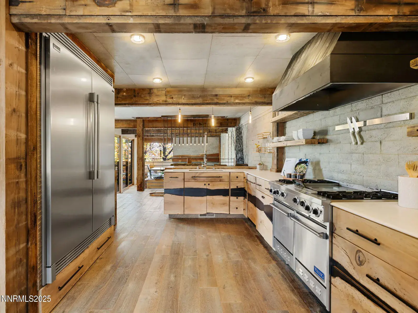 Designed by a renowned Northern Nevada architect, this residence was built in the 1970s for the original family who lovingly cared for the home until 2016 when the current owners bought the home. The property underwent a complete redesign and renovation in 2017, where all interior and exterior surfaces were rebuilt, including new walls, flooring, windows, doors, cabinetry, appliances, plumbing fixtures, counters, and lighting. Distinctive features include barnwood ceiling beams, fireplaces, custom metal-and-wood kitchen cabinetry, walnut living-room wall slabs and mantle, a media room with a functioning vault door, built-in office cabinetry, interior stucco wall texture, and a dedicated glass-enclosed wine storage. Interior doors were crafted from reclaimed wood from the Tahoe Queen dock in South Lake Tahoe. Custom cabinetry was fabricated in Truckee, CA, and the walnut elements were built in Minden, NV. The landscape, designed by Artistic Gardens of Reno, includes terraced boulder pads, garden beds, rose garden, fruit trees, and an outdoor fireplace. There is a large composite deck, paved seating areas, and an RV parking space on the Manzanita Lane side. Energy-efficient upgrades include foam-board exterior insulation added in 2018, geothermal heating with natural-gas backup, three new AC zones (2022), and a geothermal pump replaced in 2022. The home also features smart-home lighting controls, remote-operated thermostats, and garage doors that sense vehicle proximity.