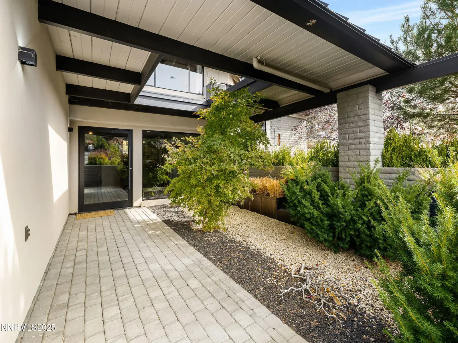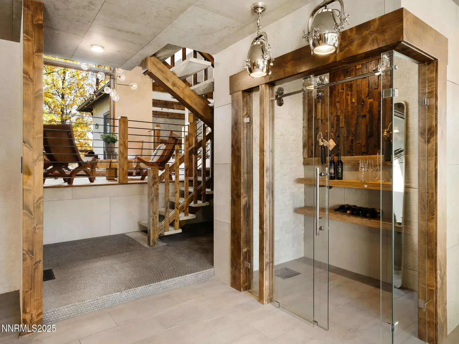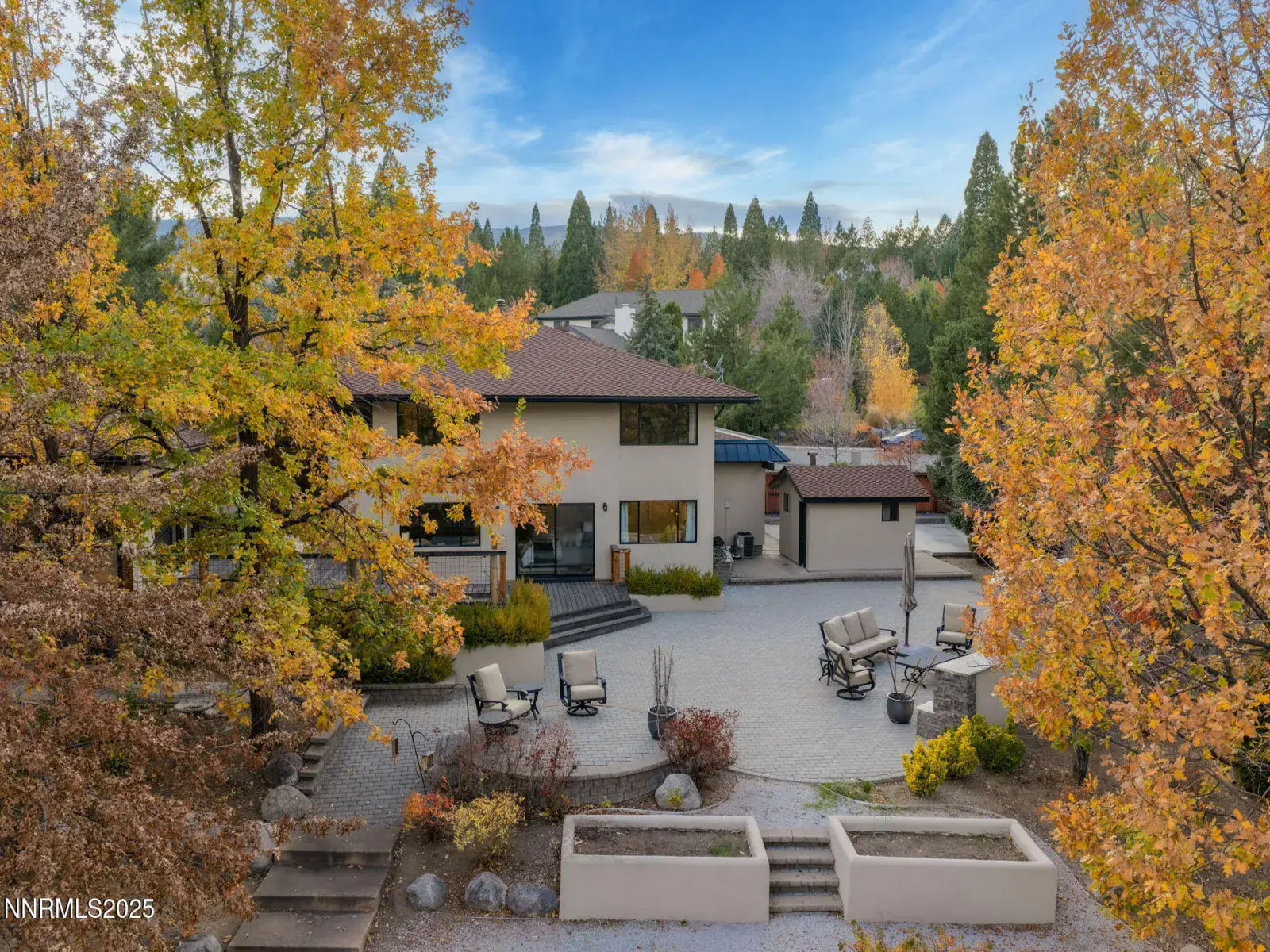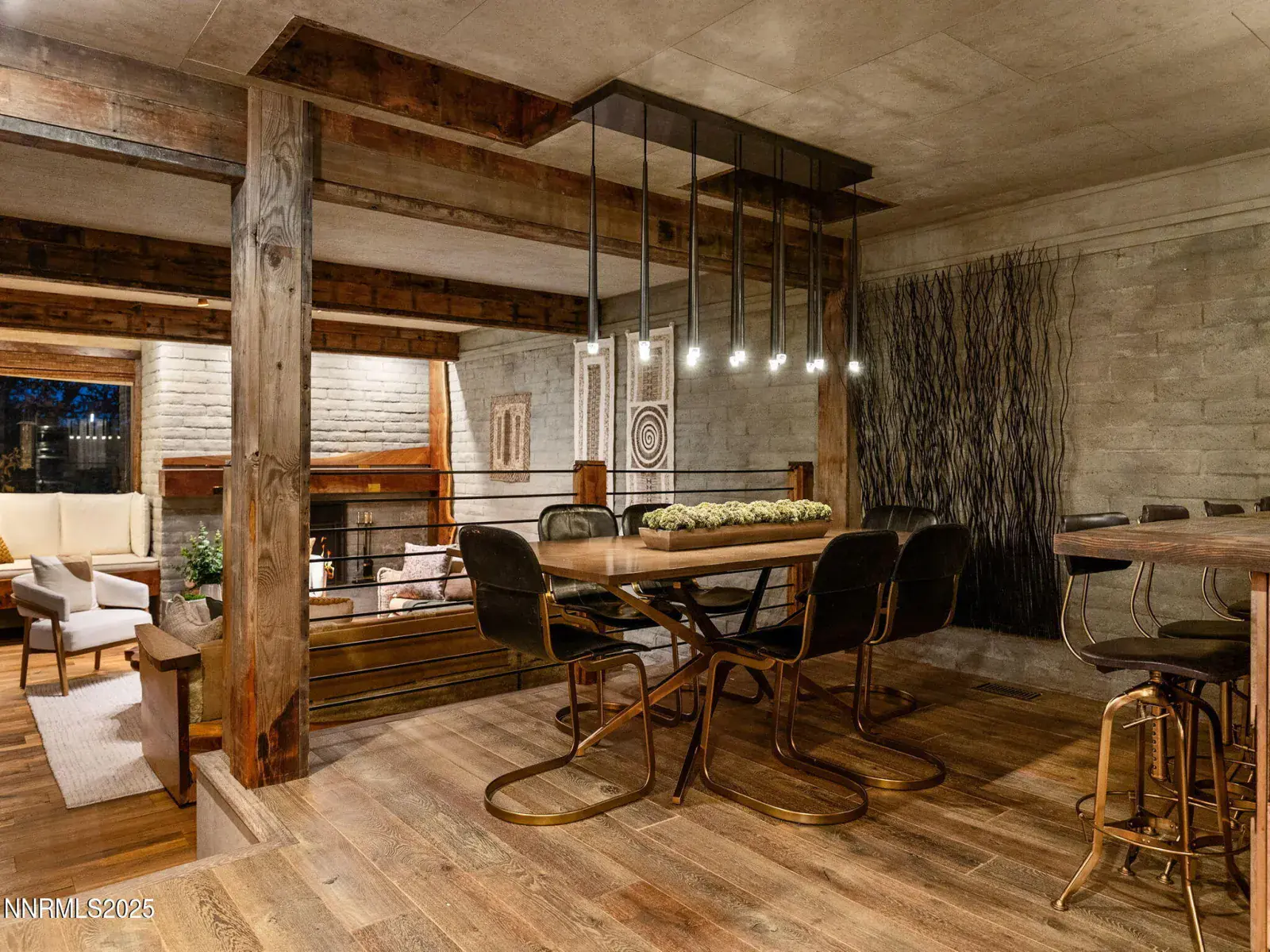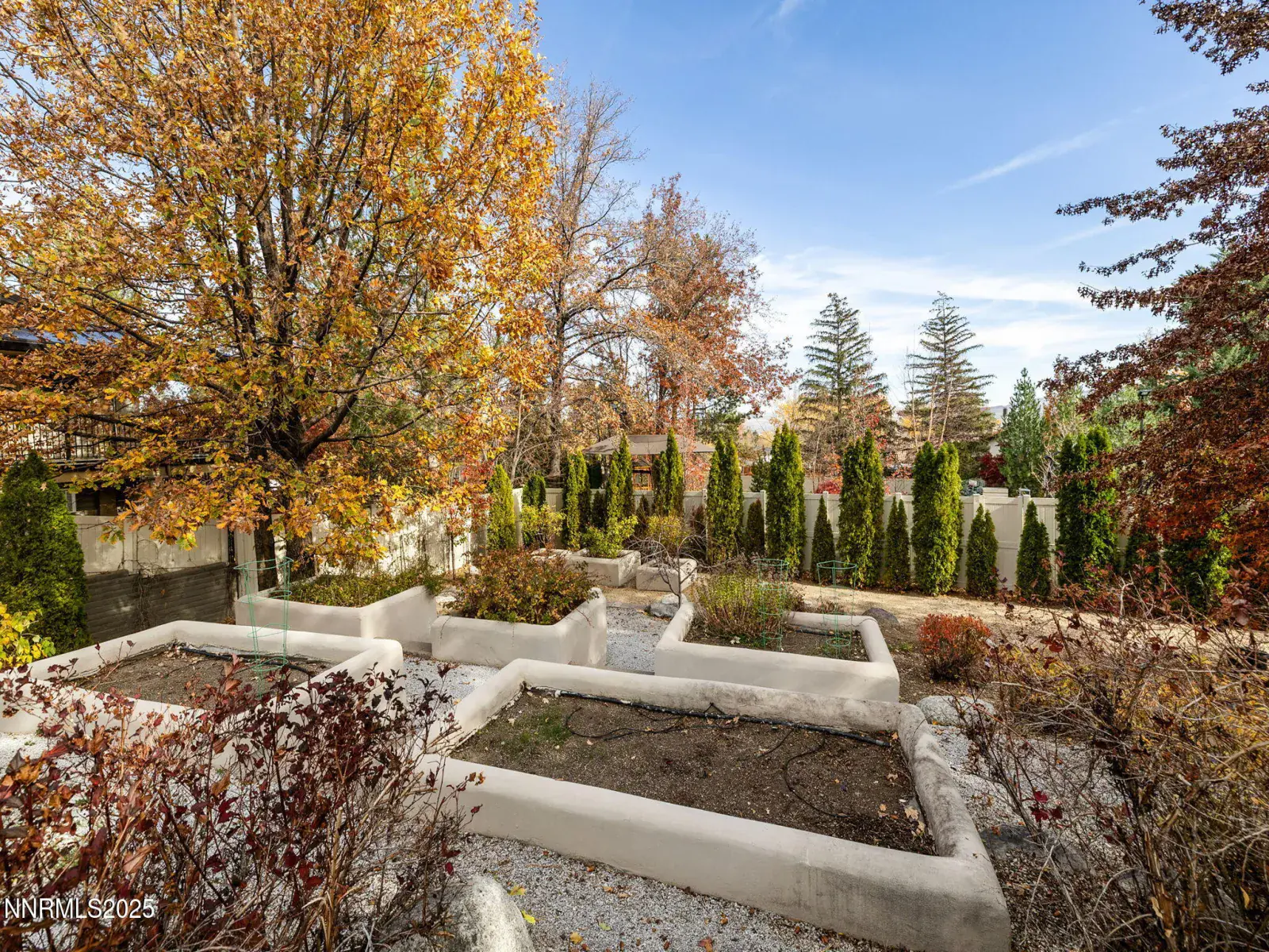 Designed by a renowned Northern Nevada architect, this residence was built in the 1970s for the original family who lovingly cared for the home until 2016 when the current owners bought the home. The property underwent a complete redesign and renovation in 2017, where all interior and exterior surfaces were rebuilt, including new walls, flooring, windows, doors, cabinetry, appliances, plumbing fixtures, counters, and lighting. Distinctive features include barnwood ceiling beams, fireplaces, custom metal-and-wood kitchen cabinetry, walnut living-room wall slabs and mantle, a media room with a functioning vault door, built-in office cabinetry, interior stucco wall texture, and a dedicated glass-enclosed wine storage. Interior doors were crafted from reclaimed wood from the Tahoe Queen dock in South Lake Tahoe. Custom cabinetry was fabricated in Truckee, CA, and the walnut elements were built in Minden, NV. The landscape, designed by Artistic Gardens of Reno, includes terraced boulder pads, garden beds, rose garden, fruit trees, and an outdoor fireplace. There is a large composite deck, paved seating areas, and an RV parking space on the Manzanita Lane side. Energy-efficient upgrades include foam-board exterior insulation added in 2018, geothermal heating with natural-gas backup, three new AC zones (2022), and a geothermal pump replaced in 2022. The home also features smart-home lighting controls, remote-operated thermostats, and garage doors that sense vehicle proximity.