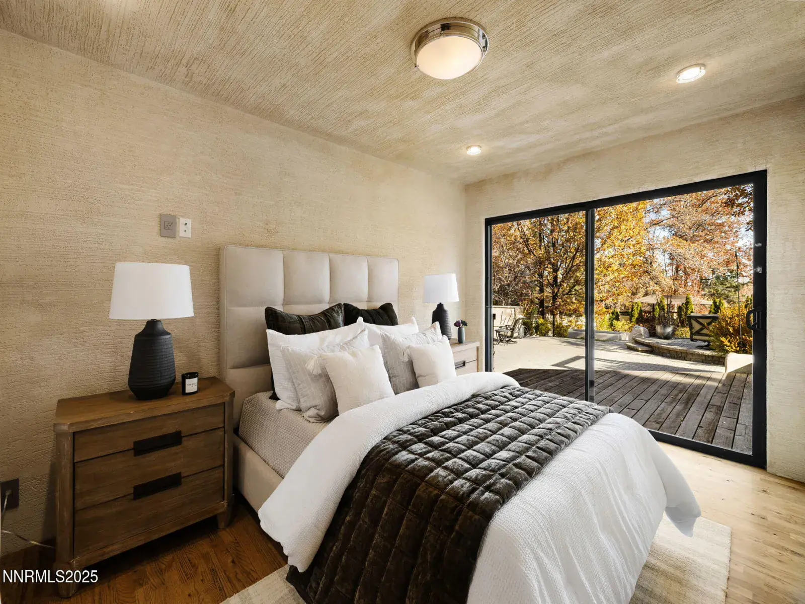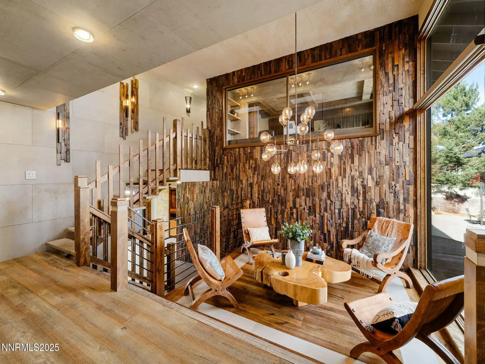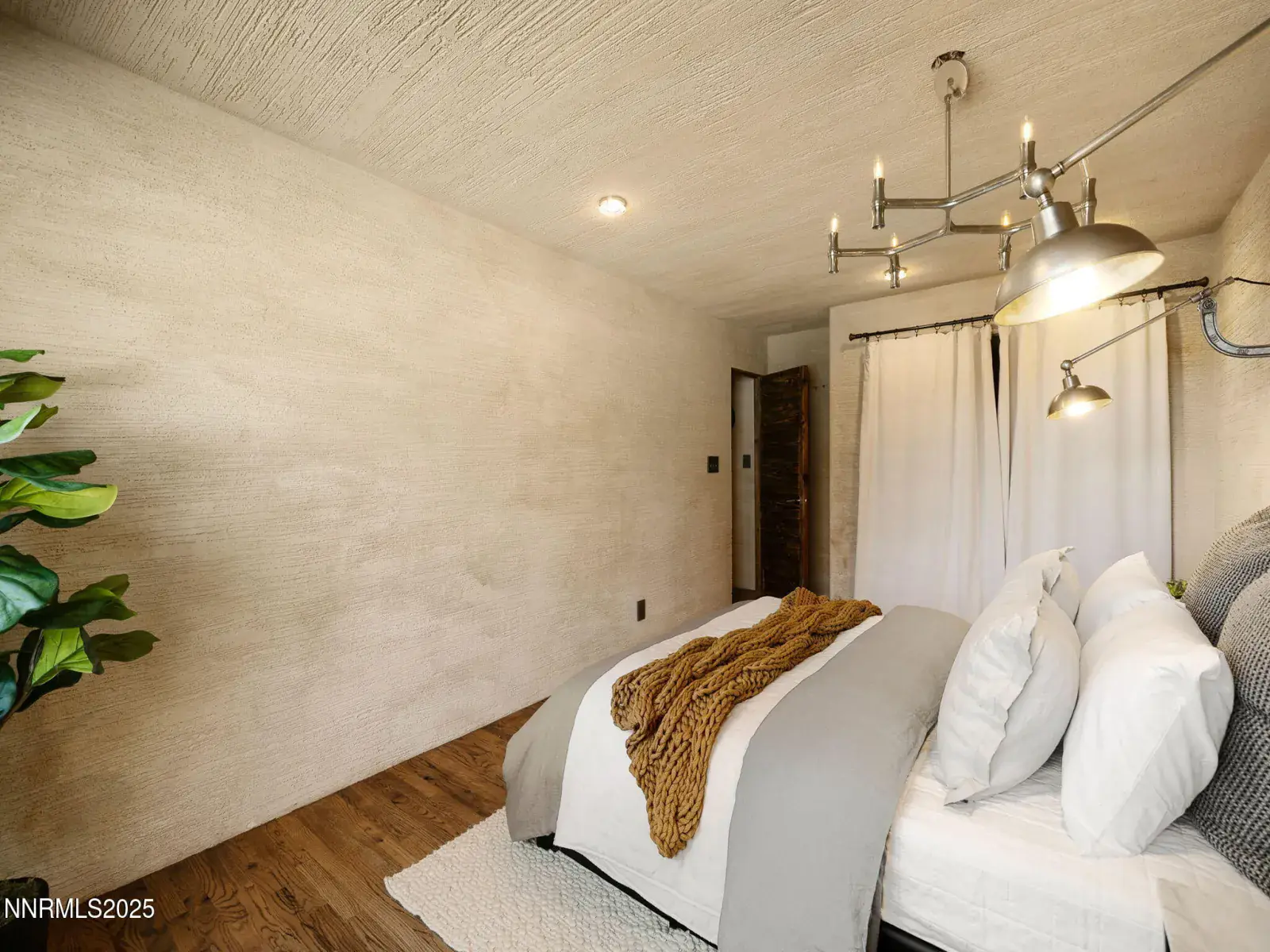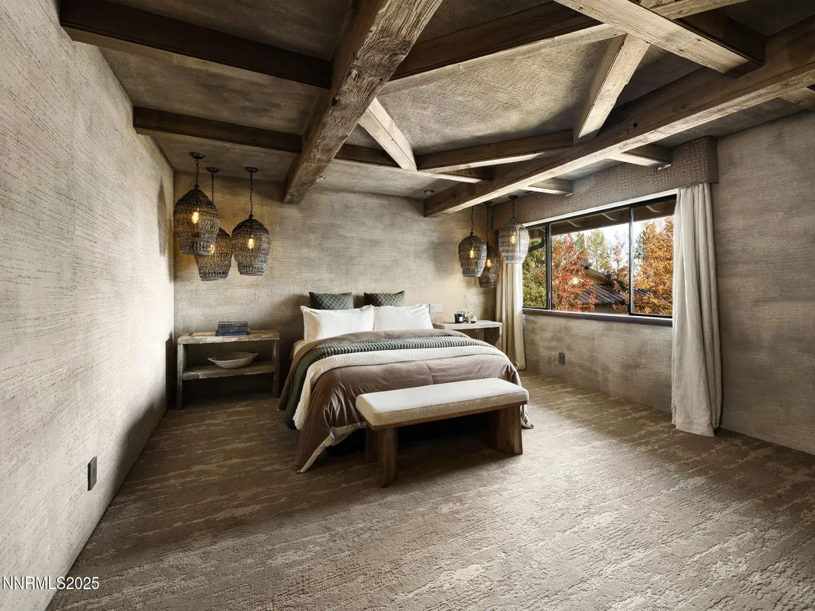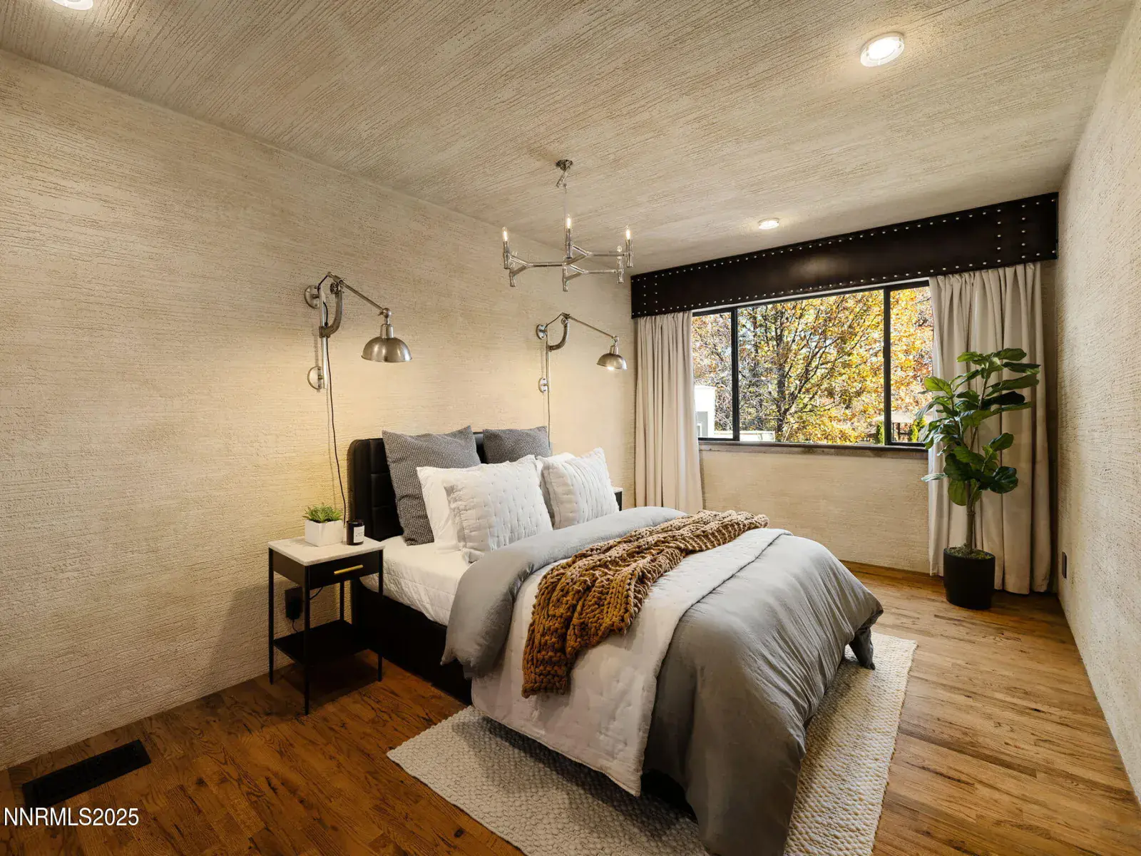 Designed by a renowned Northern Nevada architect, this residence was built in the 1970s for the original family who lovingly cared for the home until 2016 when the current owners bought the home. The property underwent a complete redesign and renovation in 2017, where all interior and exterior surfaces were rebuilt, including new walls, flooring, windows, doors, cabinetry, appliances, plumbing fixtures, counters, and lighting. Distinctive features include barnwood ceiling beams, fireplaces, custom metal-and-wood kitchen cabinetry, walnut living-room wall slabs and mantle, a media room with a functioning vault door, built-in office cabinetry, interior stucco wall texture, and a dedicated glass-enclosed wine storage. Interior doors were crafted from reclaimed wood from the Tahoe Queen dock in South Lake Tahoe. Custom cabinetry was fabricated in Truckee, CA, and the walnut elements were built in Minden, NV. The landscape, designed by Artistic Gardens of Reno, includes terraced boulder pads, garden beds, rose garden, fruit trees, and an outdoor fireplace. There is a large composite deck, paved seating areas, and an RV parking space on the Manzanita Lane side. Energy-efficient upgrades include foam-board exterior insulation added in 2018, geothermal heating with natural-gas backup, three new AC zones (2022), and a geothermal pump replaced in 2022. The home also features smart-home lighting controls, remote-operated thermostats, and garage doors that sense vehicle proximity.