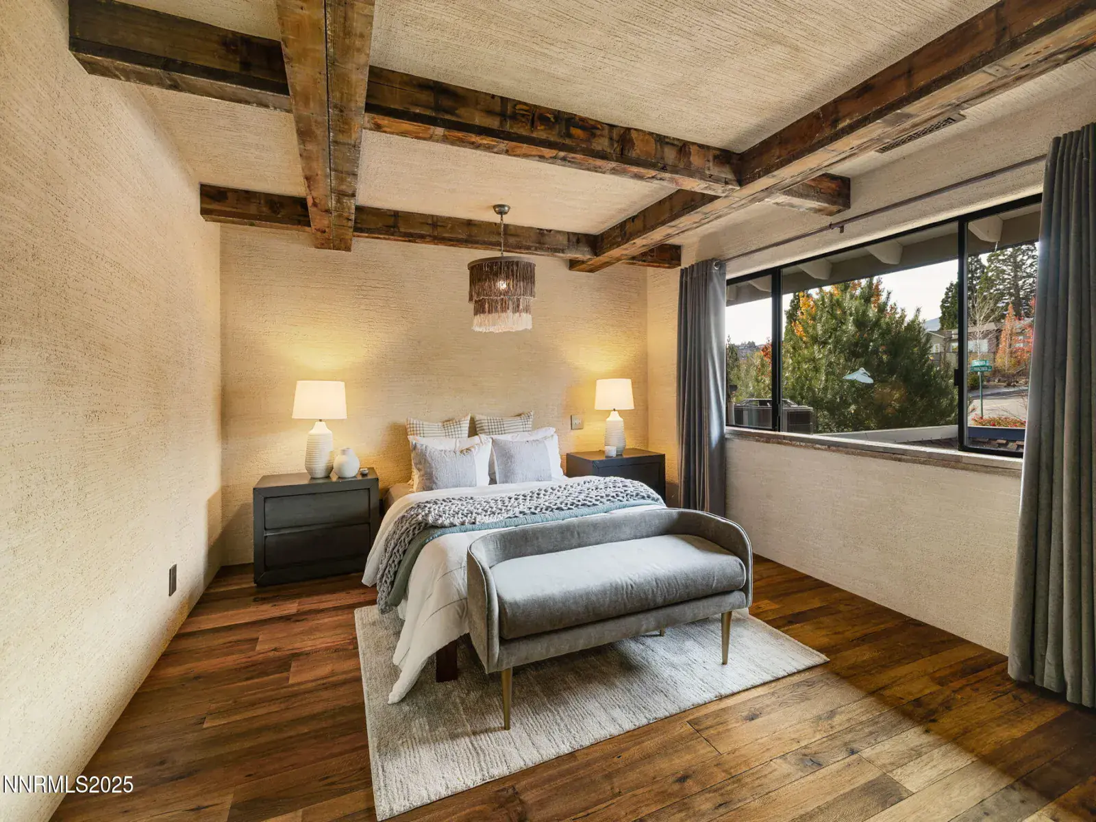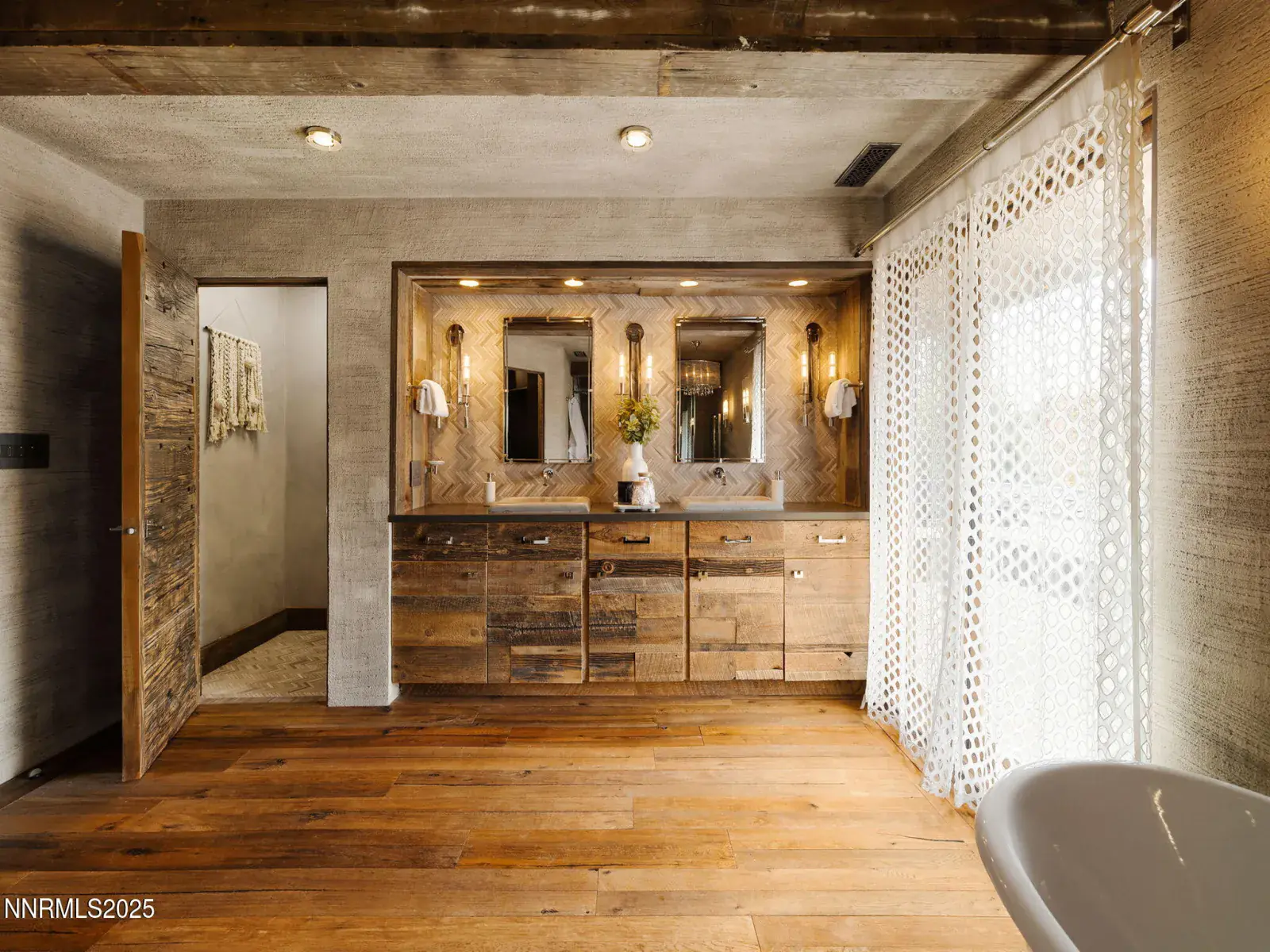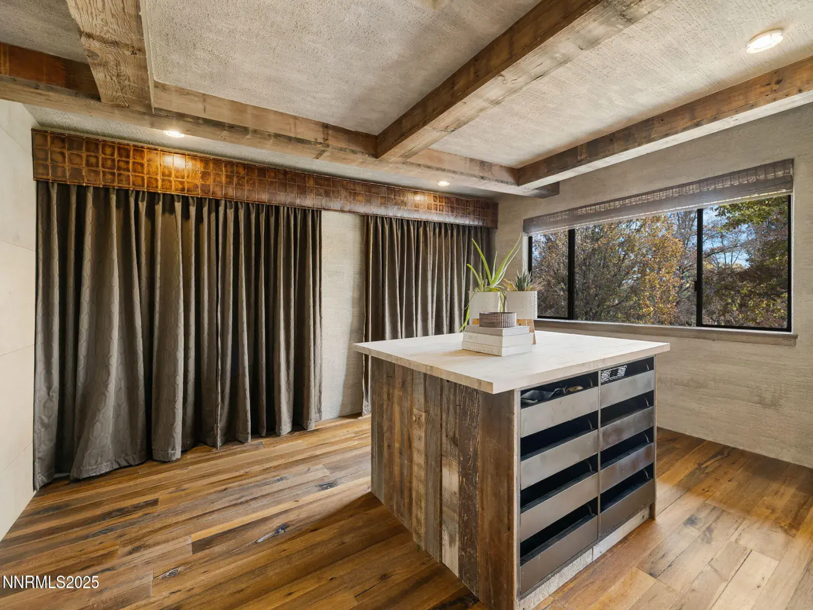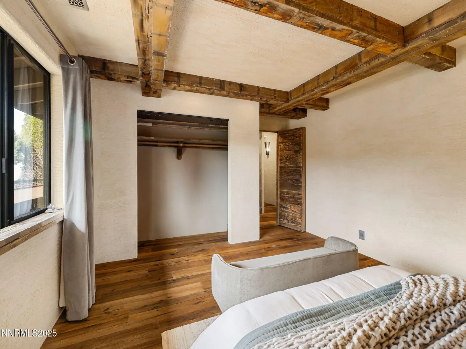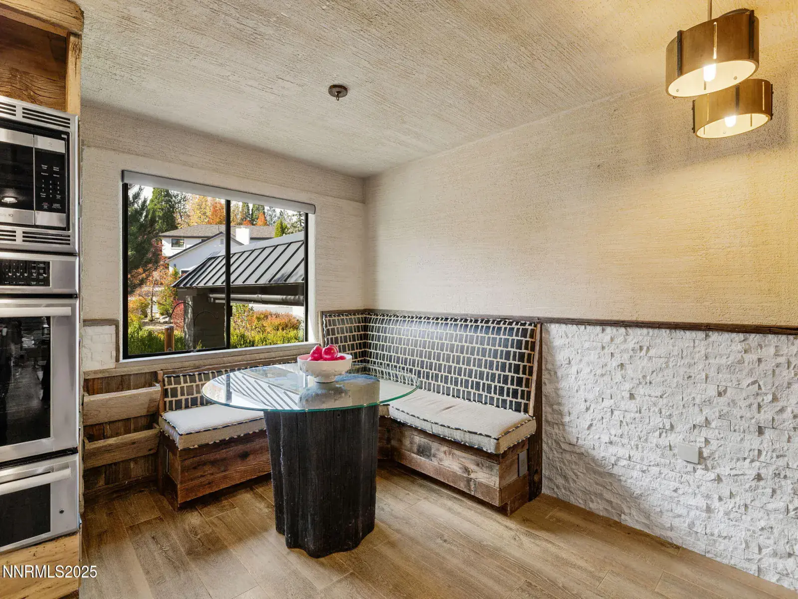 Designed by a renowned Northern Nevada architect, this residence was built in the 1970s for the original family who lovingly cared for the home until 2016 when the current owners bought the home. The property underwent a complete redesign and renovation in 2017, where all interior and exterior surfaces were rebuilt, including new walls, flooring, windows, doors, cabinetry, appliances, plumbing fixtures, counters, and lighting. Distinctive features include barnwood ceiling beams, fireplaces, custom metal-and-wood kitchen cabinetry, walnut living-room wall slabs and mantle, a media room with a functioning vault door, built-in office cabinetry, interior stucco wall texture, and a dedicated glass-enclosed wine storage. Interior doors were crafted from reclaimed wood from the Tahoe Queen dock in South Lake Tahoe. Custom cabinetry was fabricated in Truckee, CA, and the walnut elements were built in Minden, NV. The landscape, designed by Artistic Gardens of Reno, includes terraced boulder pads, garden beds, rose garden, fruit trees, and an outdoor fireplace. There is a large composite deck, paved seating areas, and an RV parking space on the Manzanita Lane side. Energy-efficient upgrades include foam-board exterior insulation added in 2018, geothermal heating with natural-gas backup, three new AC zones (2022), and a geothermal pump replaced in 2022. The home also features smart-home lighting controls, remote-operated thermostats, and garage doors that sense vehicle proximity.